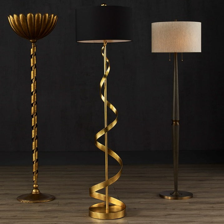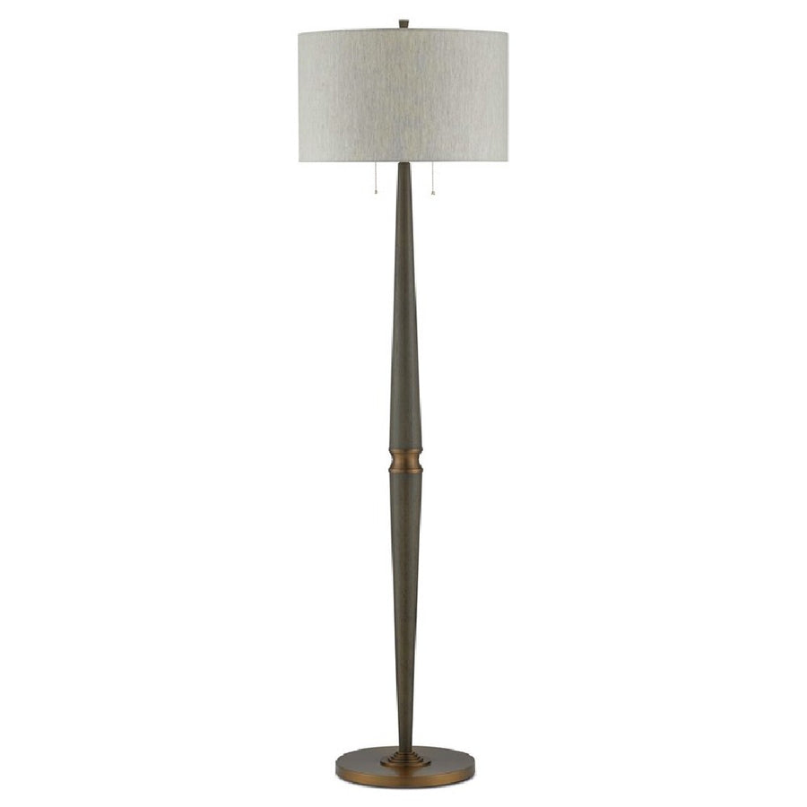 Lámpara para piso con un lustroso anillo de metal en un acabado de latón antiguo que conecta dos piezas alargadas de madera de caucho en un acabado gris.