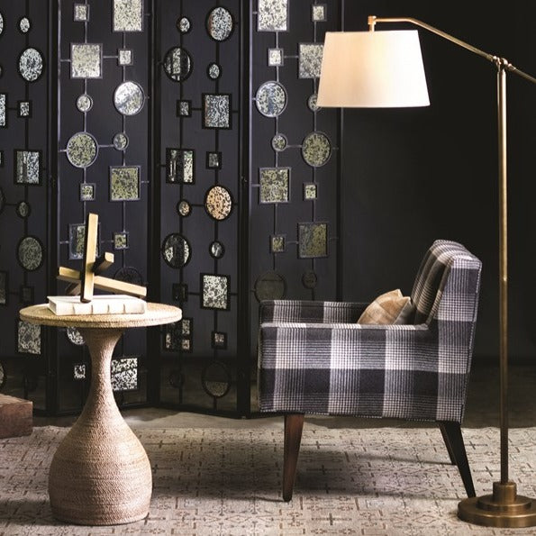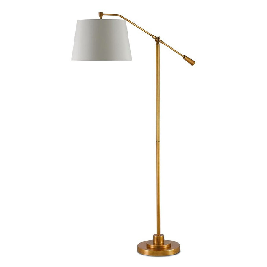 Lámpara para piso un brazo ajustable de metal cubierto con un acabado de latón antiguo.
