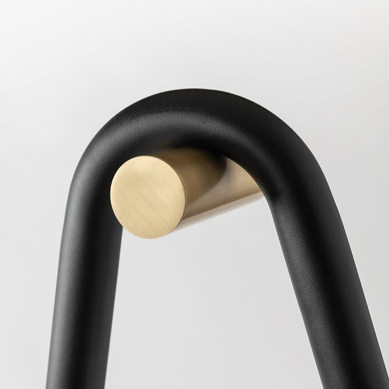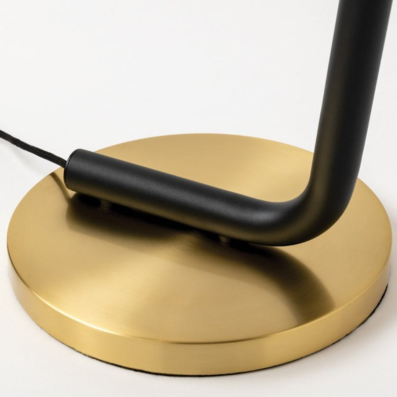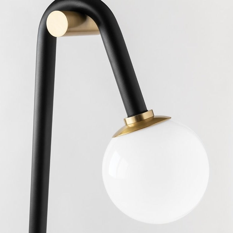 Lámpara de piso con un marco negro inclinado, detalles metálicos y una esfera de cristal opal brillante.