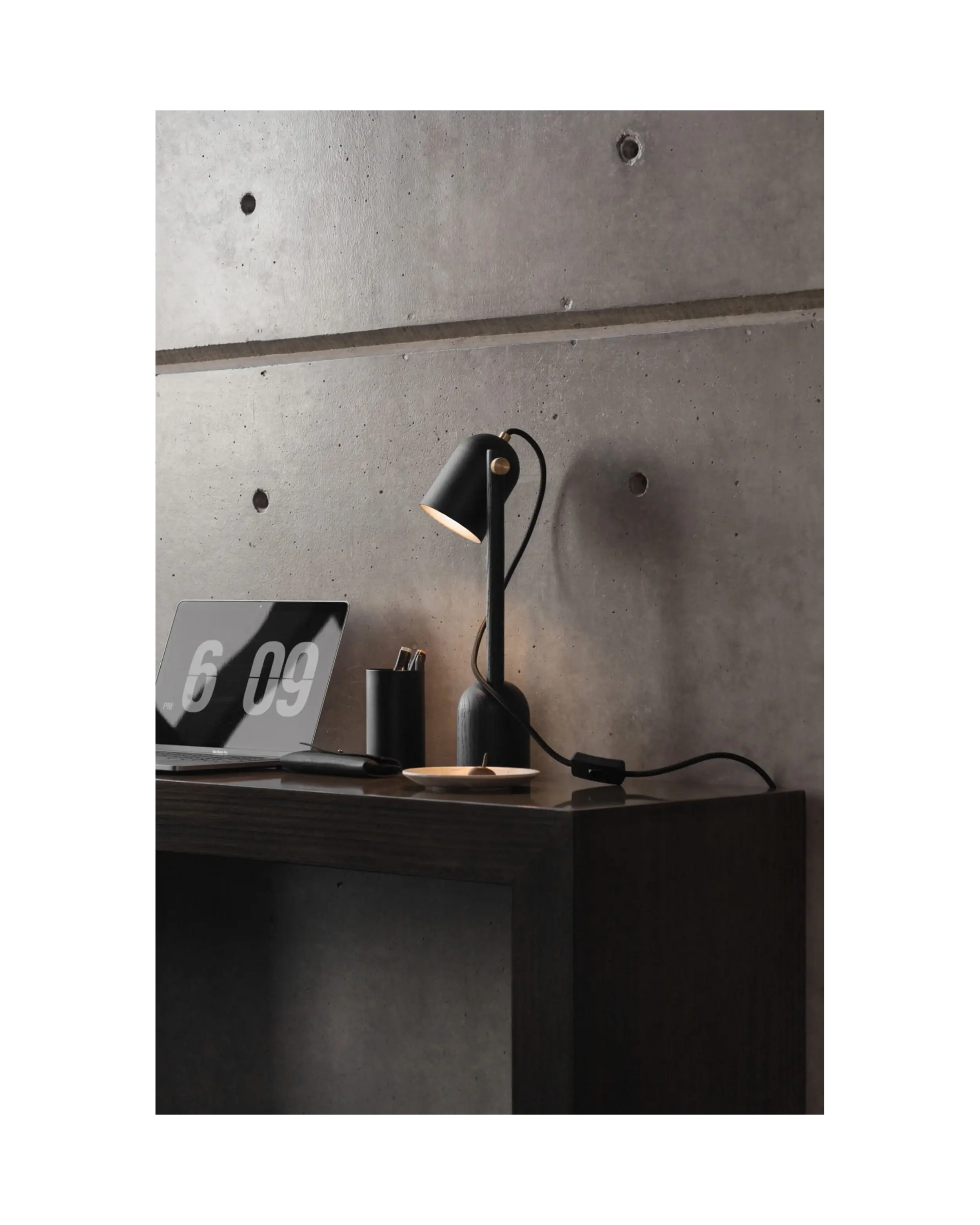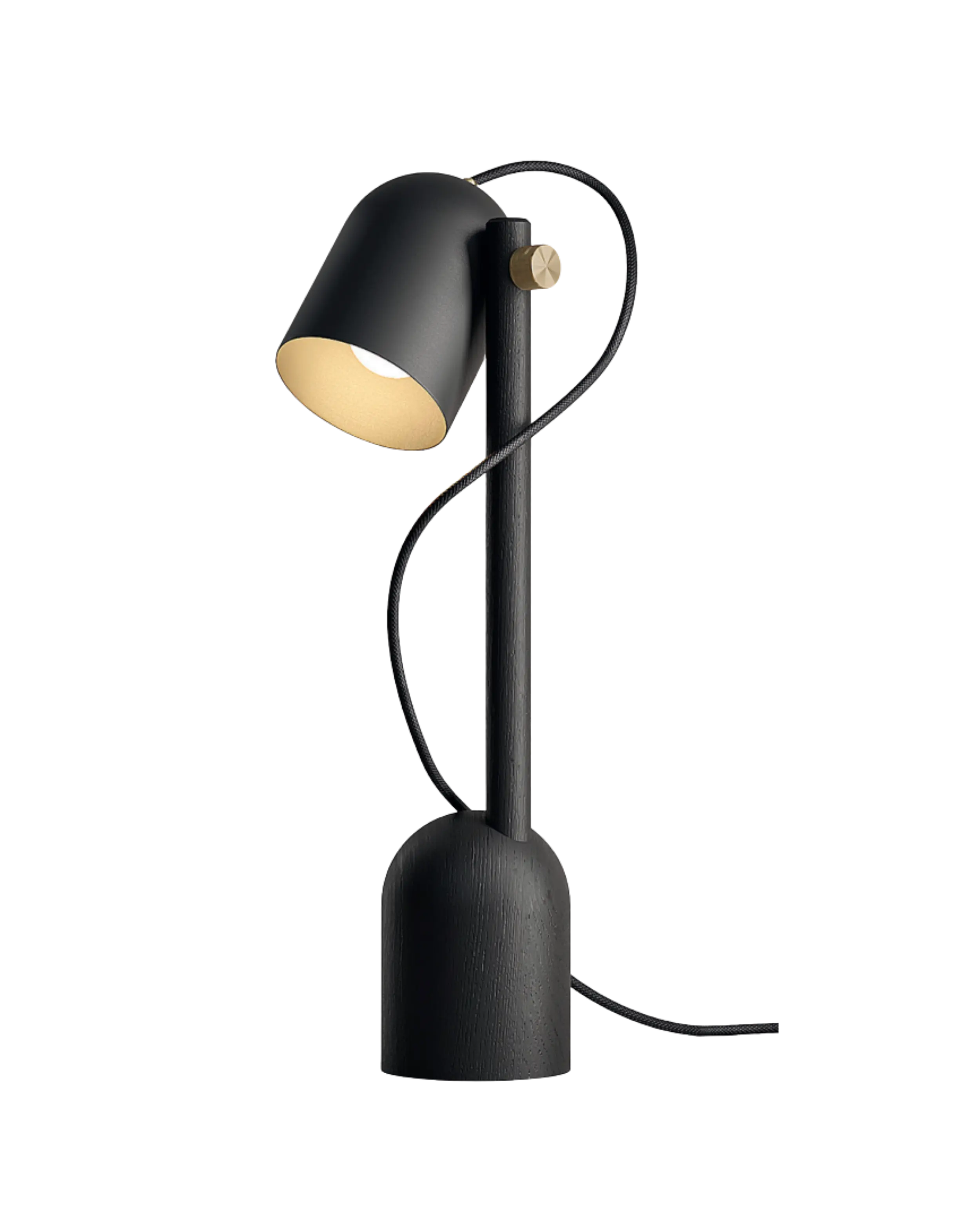 La lámpara de mesa CTR02 Black Edition es una luminaria funcional y monocromática con algunos elementos en latón.