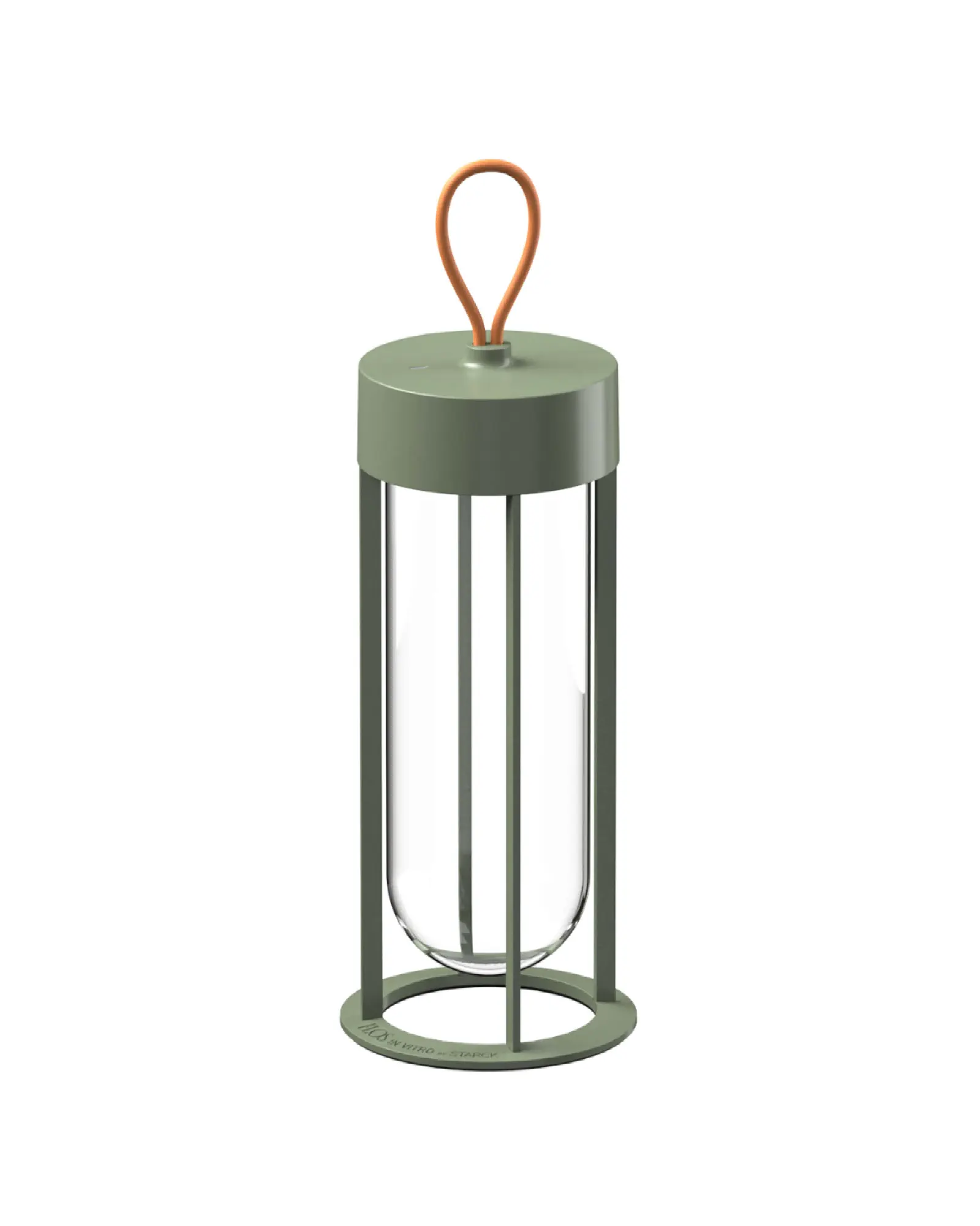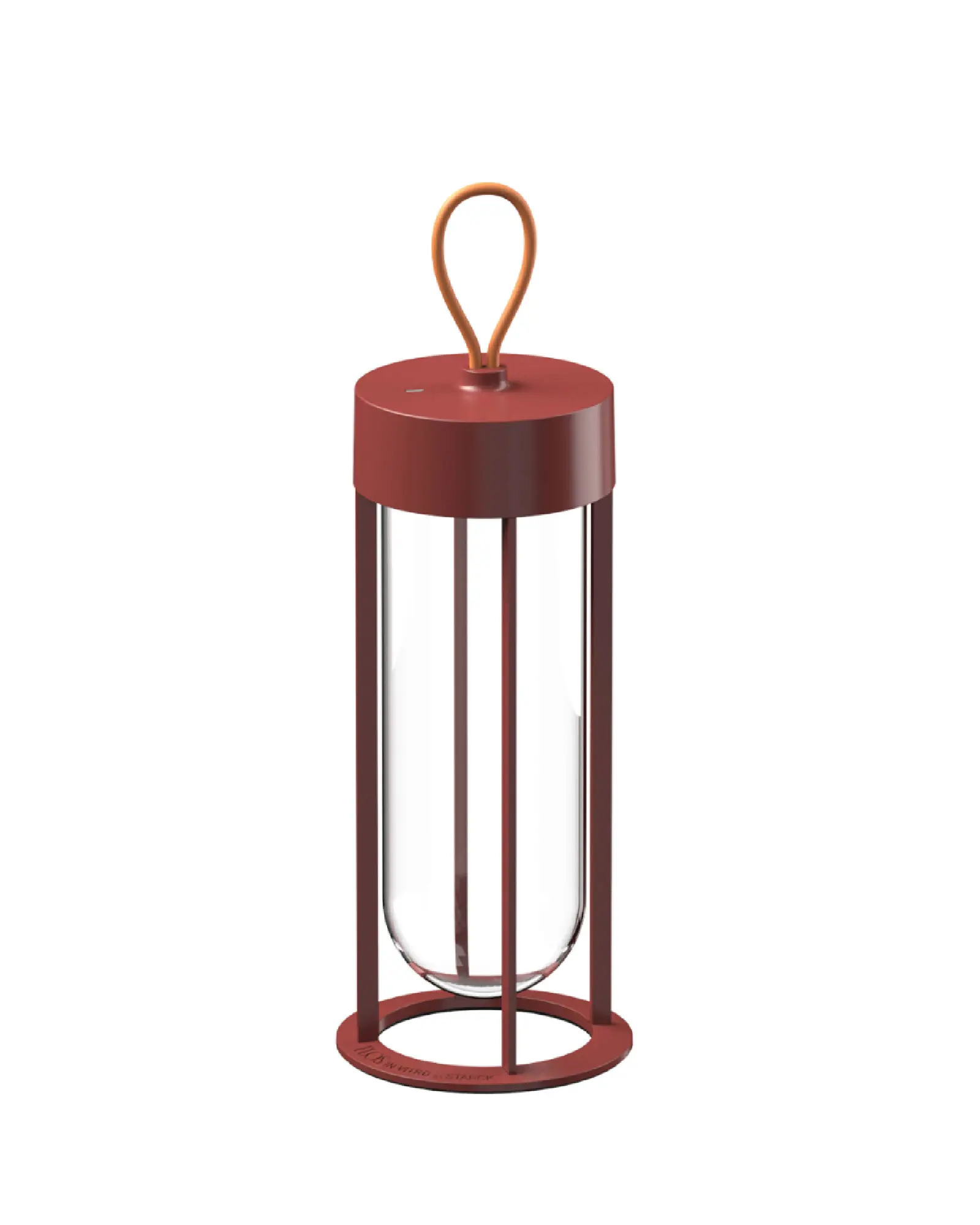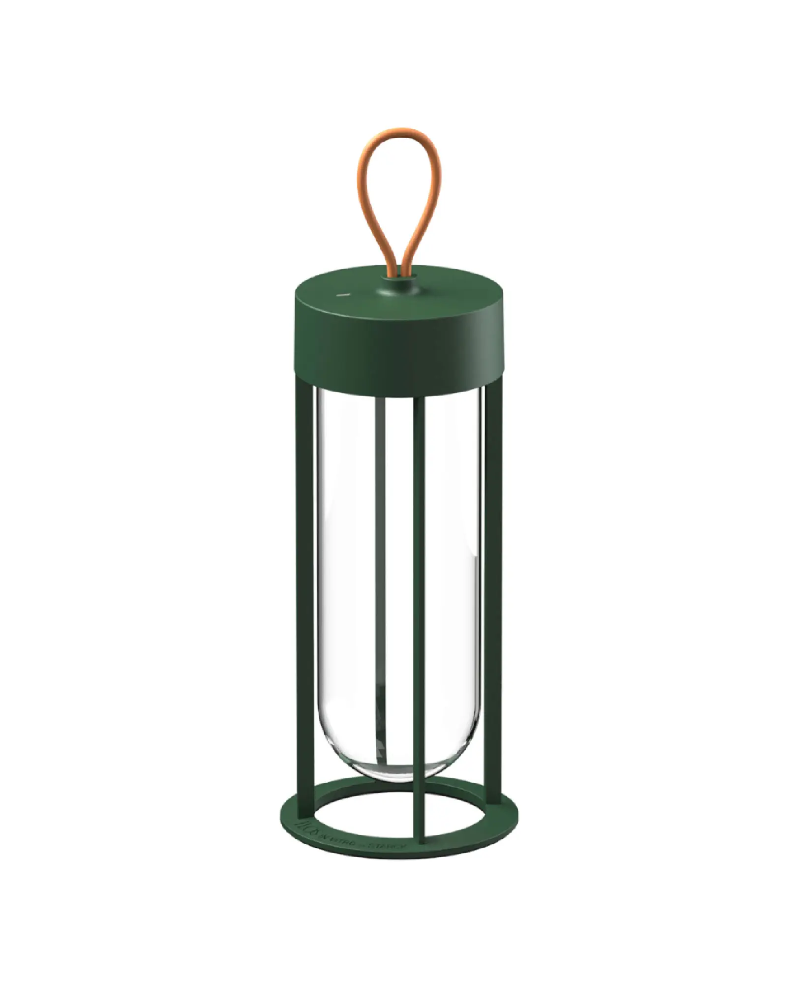 Lámpara portátil equipada con asa de transporte, ideal para exteriores.