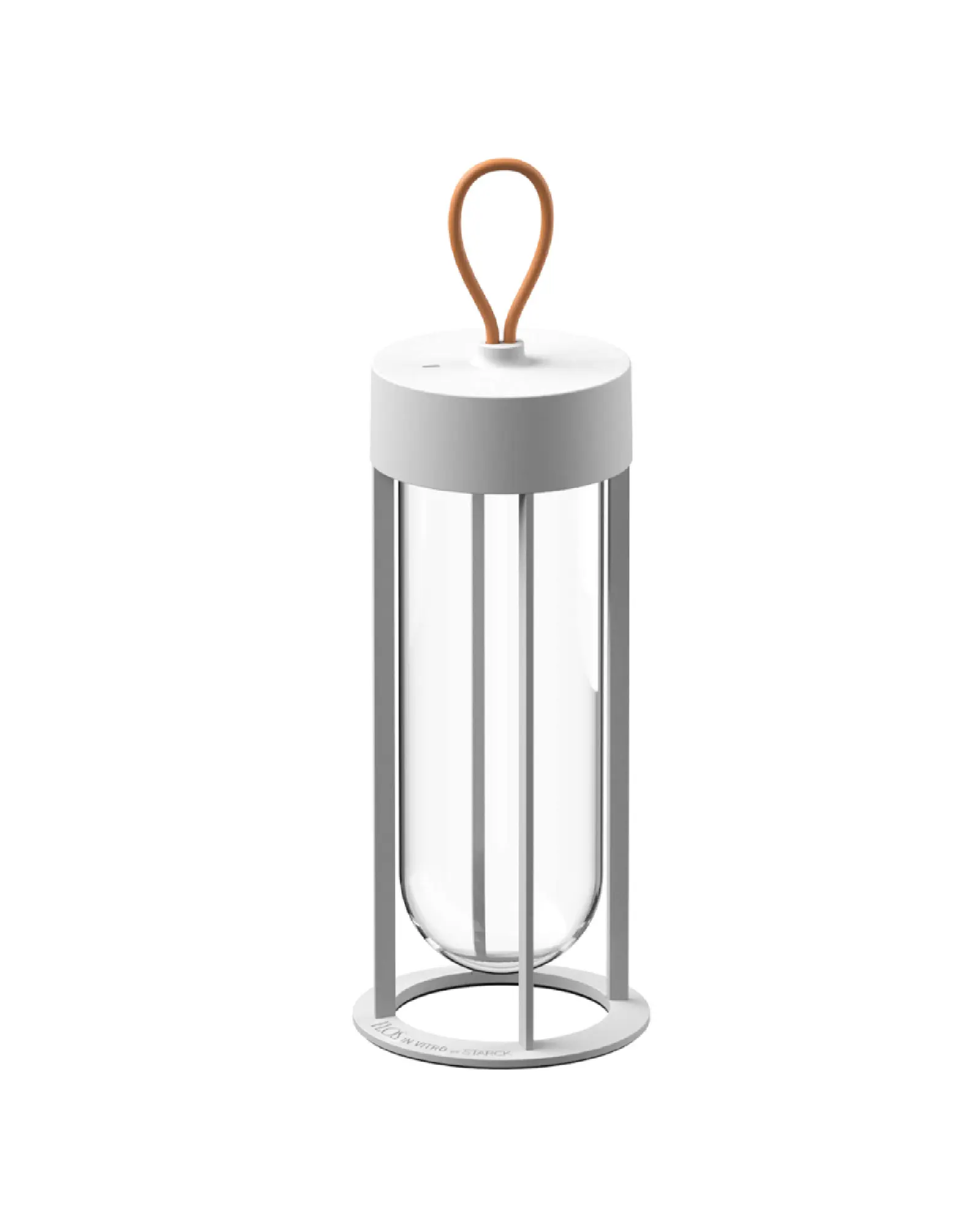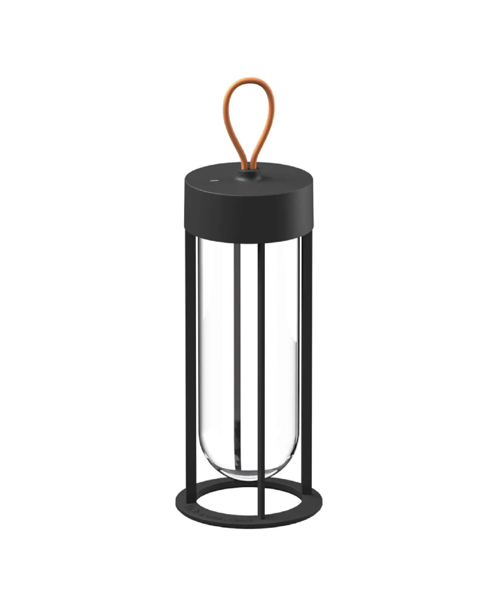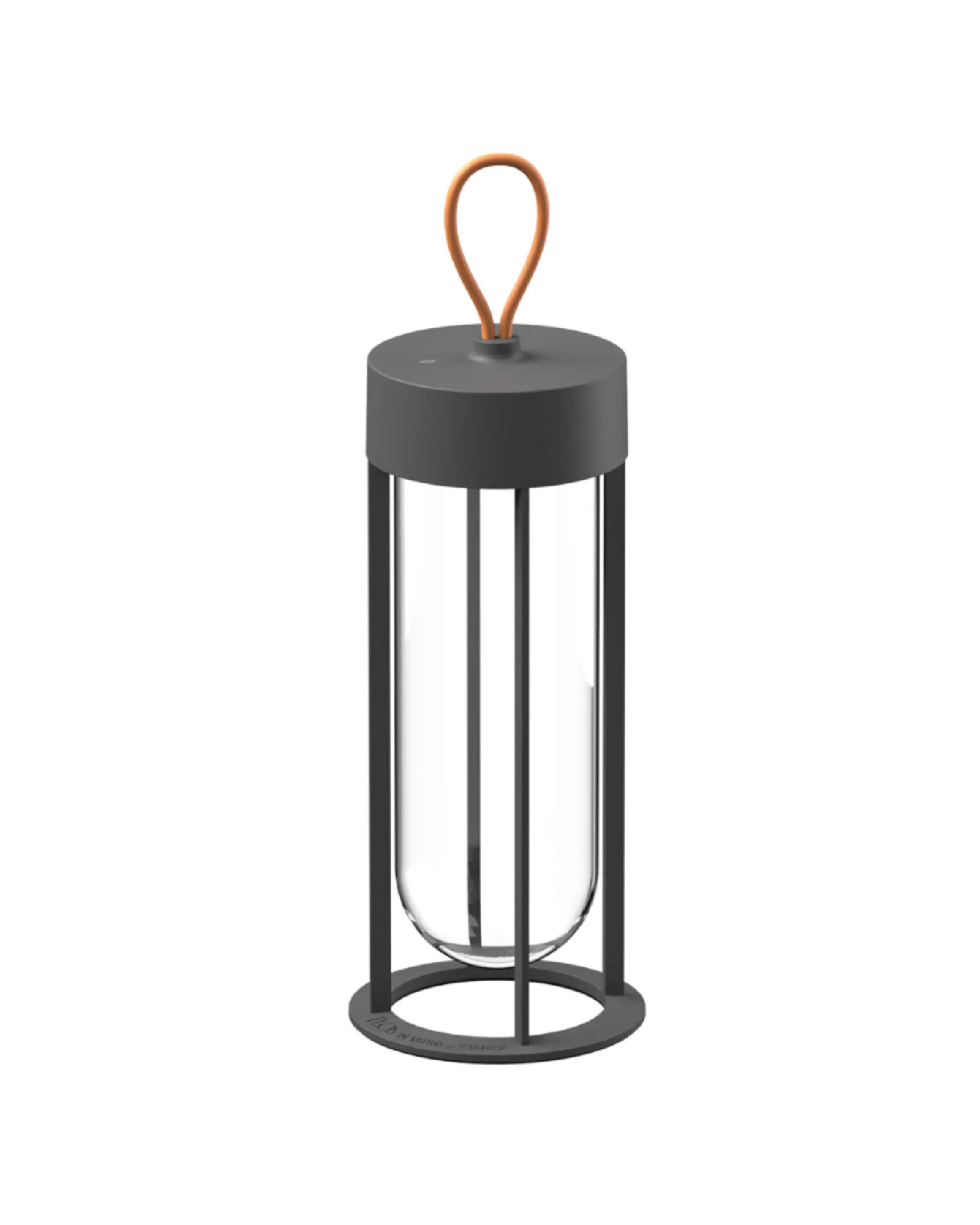 Lámpara portátil equipada con asa de transporte, ideal para exteriores.