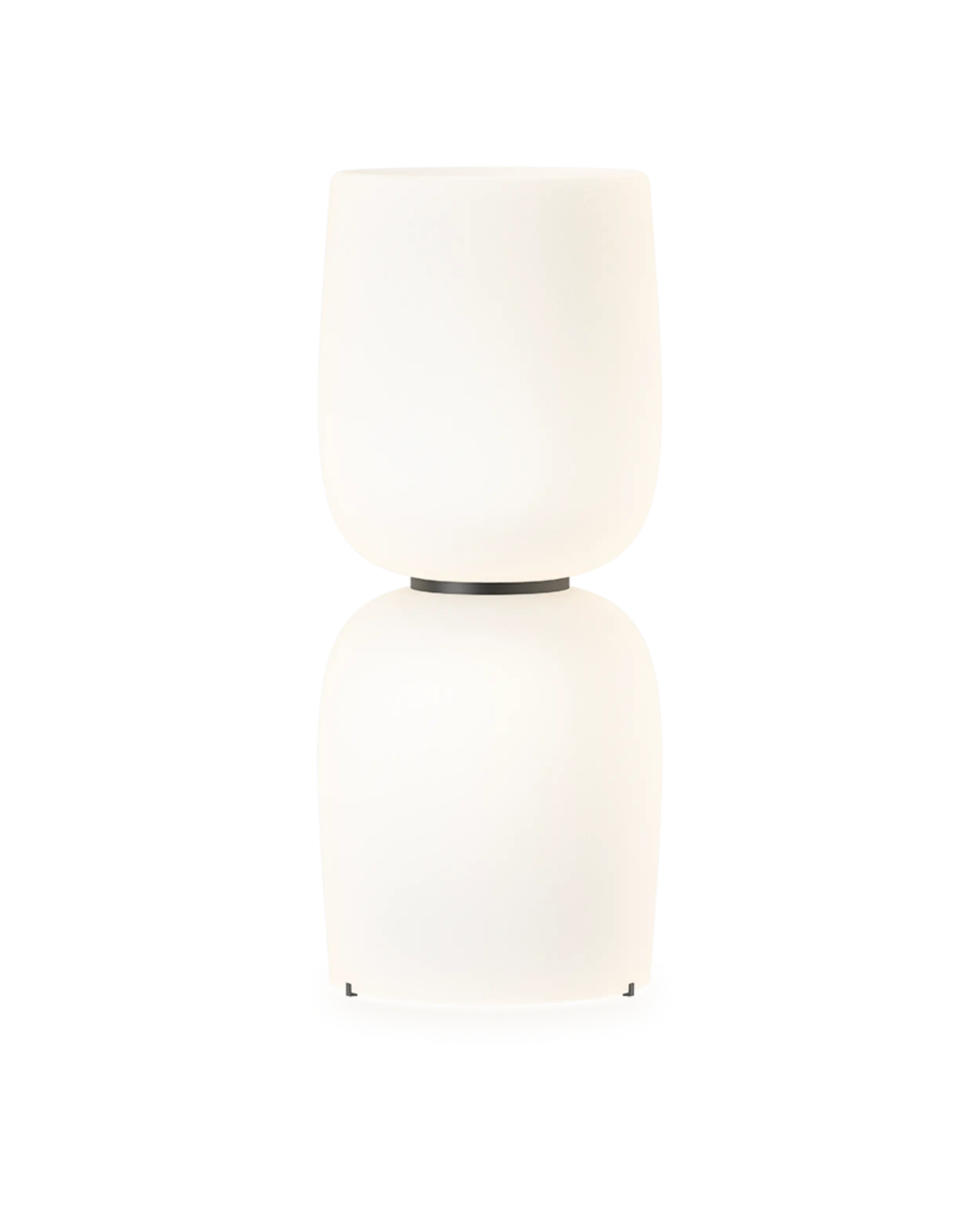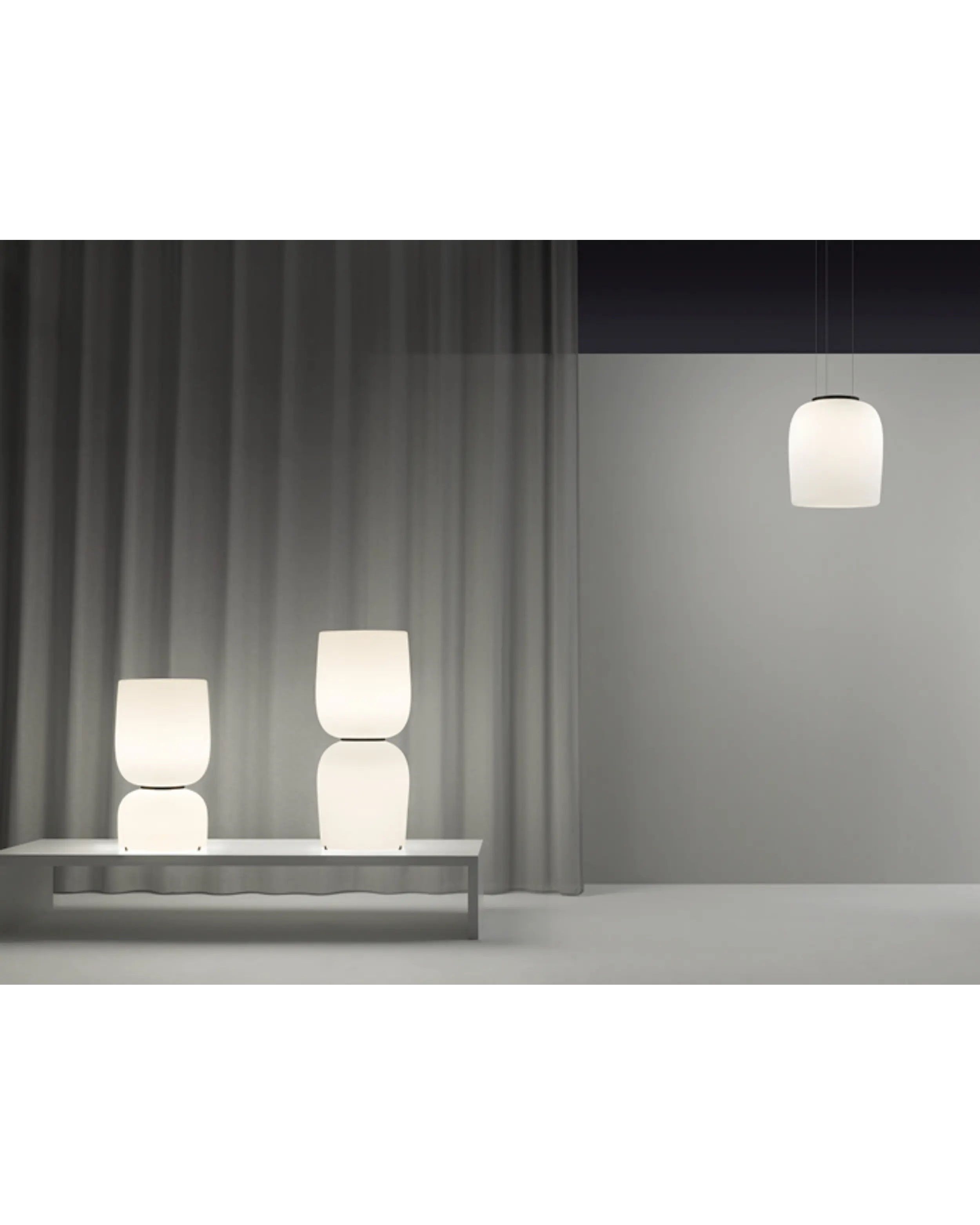 Presenta una silueta apilada de formas bulbosas hechas de vidrio opalino soplado a boca que irradia un brillo cálido y acogedor. Una banda negra rodea la sección media, acentuando sus sensuales curvas y sirviendo al mismo tiempo como regulador táctil para la versión con pulsador.