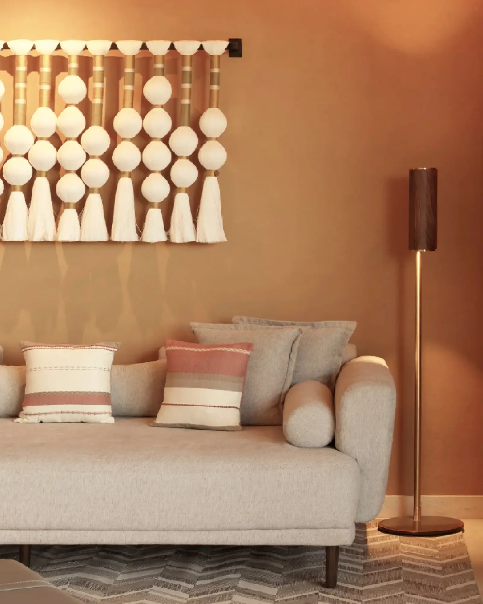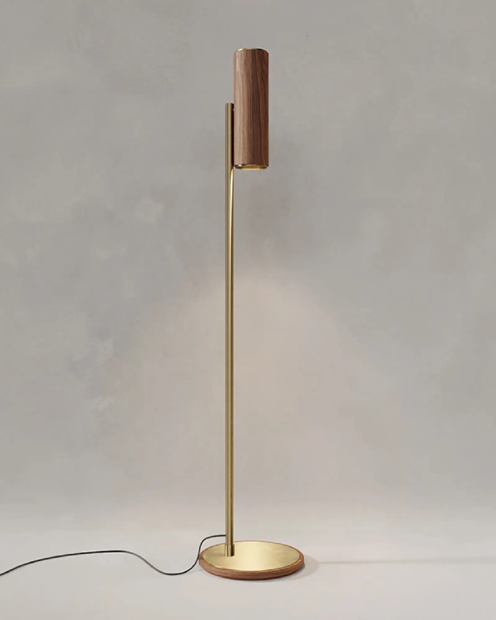 La lámpara de piso Templo consiste en una base de madera de nogal con una cubierta de latón, la cual refleja la luz emitida por el cilindro superior. El resplandor emitido por la lámpara escapa simultáneamente por las entradas del cuerpo cilíndrico esparciéndose por todo el tubo metálico que lo sostiene y hacia la parte superior del espacio donde se encuentra colocada.