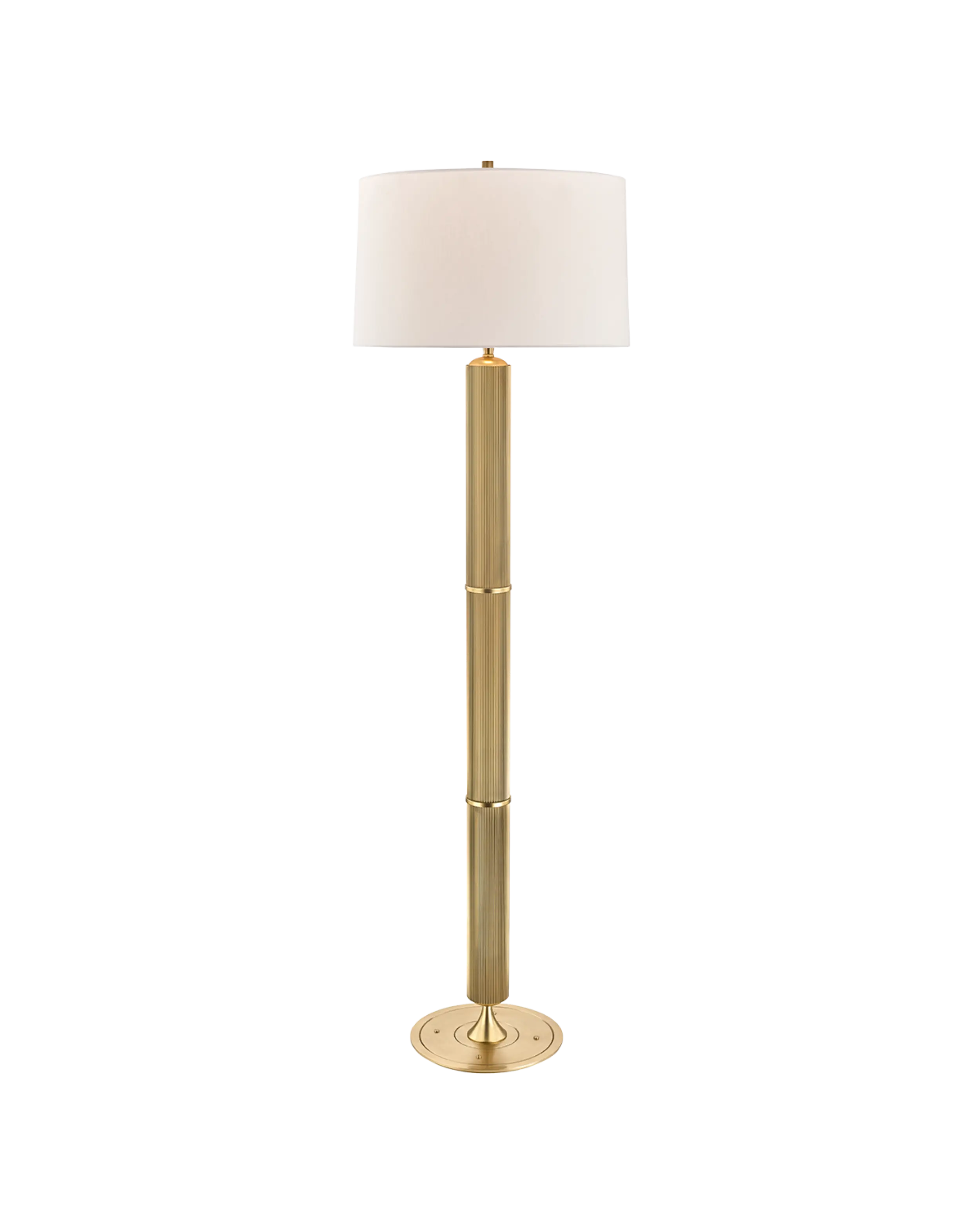Tompkins es una lámpara de piso, conocida por su estilo transicional y los detalles acanalados en las estructuras metálicas con pantallas de lino.
