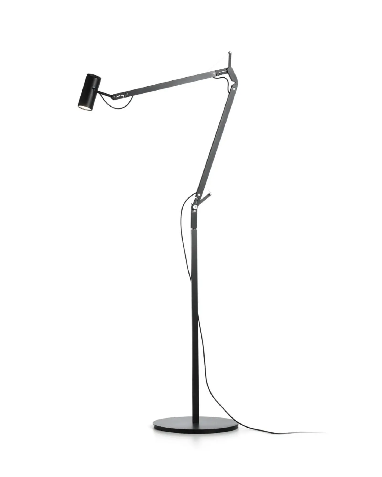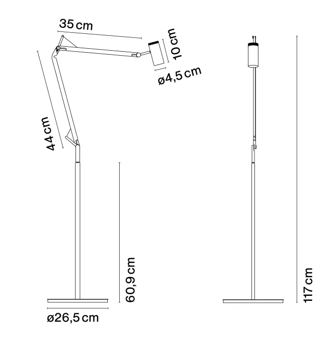 Este diseño une el cabezal a una estructura delgada y ligera que puede extenderse completamente sin apenas ocupar espacio. Cuenta con un sistema de rótula para orientar con precisión el haz de luz. El interruptor de la rueda está integrado en la parte superior del difusor, y se enciende y apaga al girarlo, un guiño retro a la historia de las lámparas.