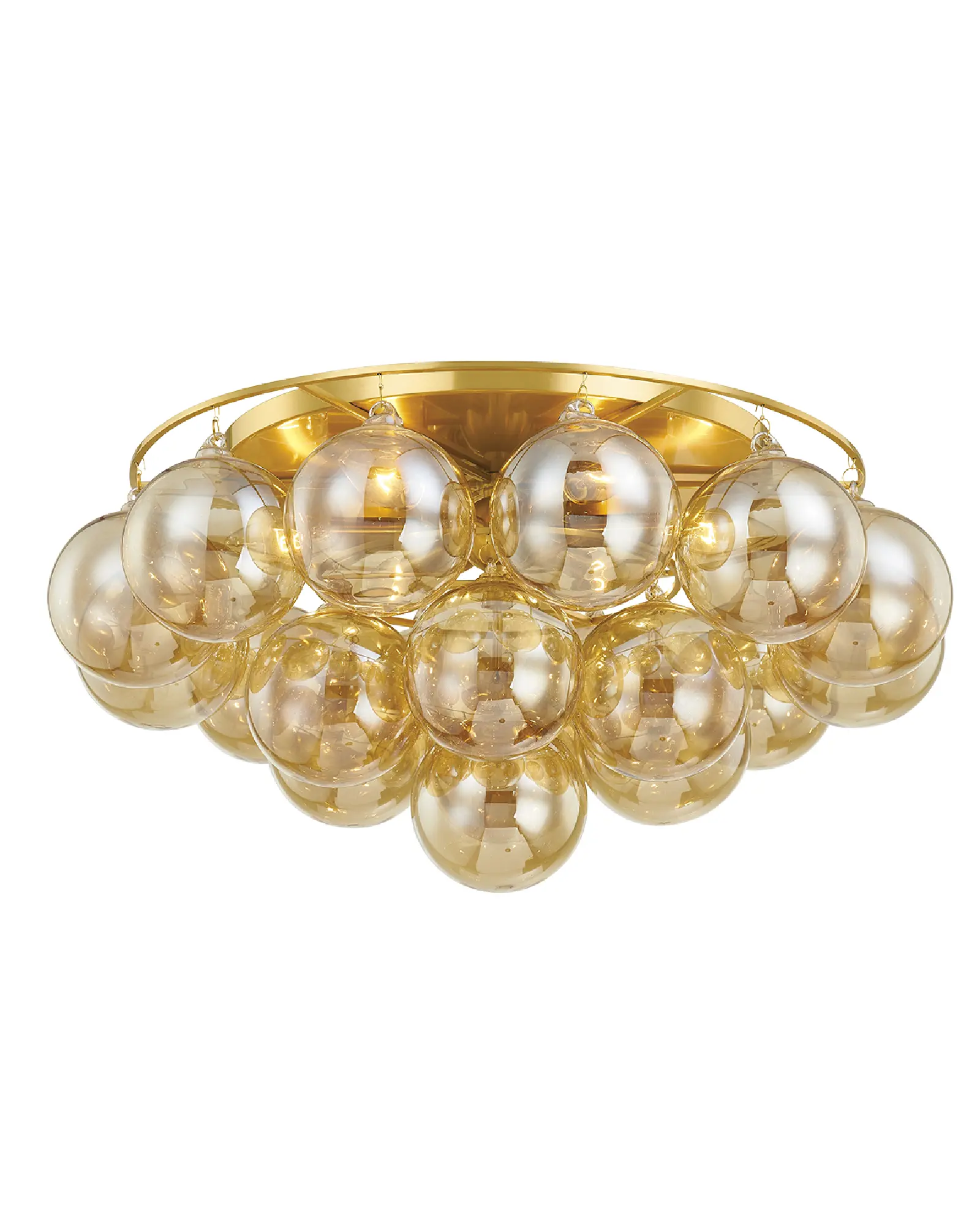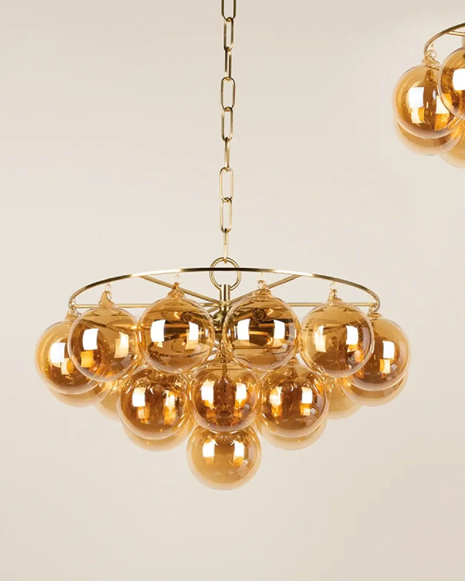 Los globos de cristal champán estriado o chapado en espiral cuelgan de un marco de latón envejecido, creando este espectáculo en forma de nube. Las posibilidades de Mimi son infinitas, ya sea para decorar un rincón de desayuno con la lámpara pequeña, para añadir un suave resplandor a una entrada con la lámpara empotrada o para crear un ambiente glamuroso en el comedor con la lámpara grande