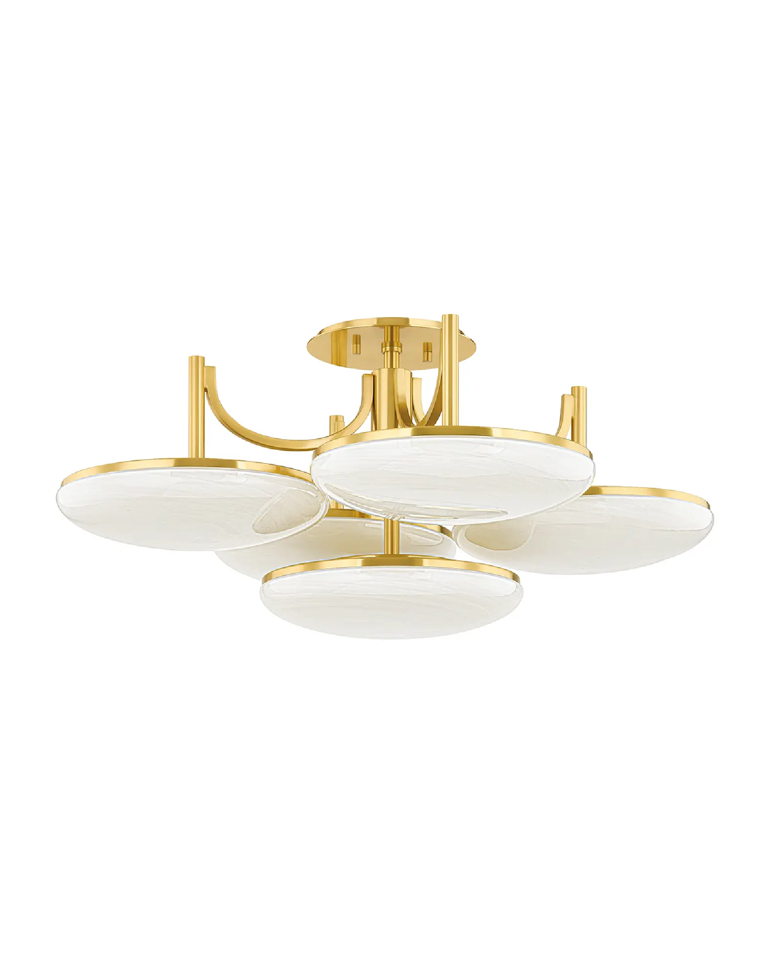 Las esbeltas pantallas de cristal en forma de nube están rematadas en latón envejecido y agrupadas alrededor del centro a distintas alturas, formando una silueta estilizada que combina lo moderno con un toque vintage. Los brazos largos y elegantes suavizan las líneas rectas de las pantallas, aportando equilibrio y sofisticación. Ideal para instalarse cerca del techo o en un punto focal que resalte la estética del espacio.