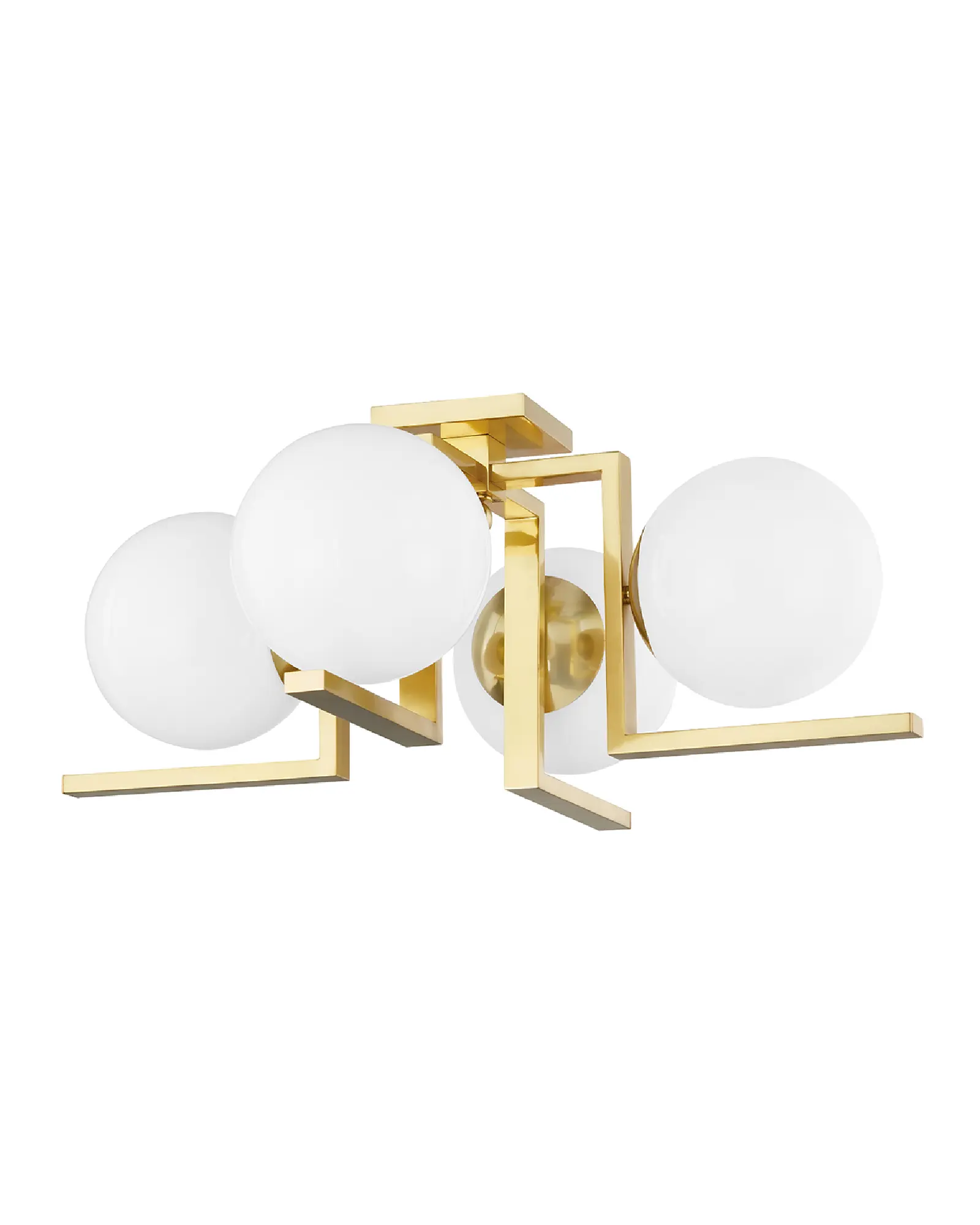 Grandes globos de cristal opalino con tapa metálica están montados sobre brazos metálicos perfectamente perpendiculares que crean esta obra maestra geométrica. Disponible como aplique, araña de gran tamaño, empotrada en el techo o como espectacular pieza para isla.Esta luminaria dominará la habitación y la llenará de un aspecto limpio y fresco.