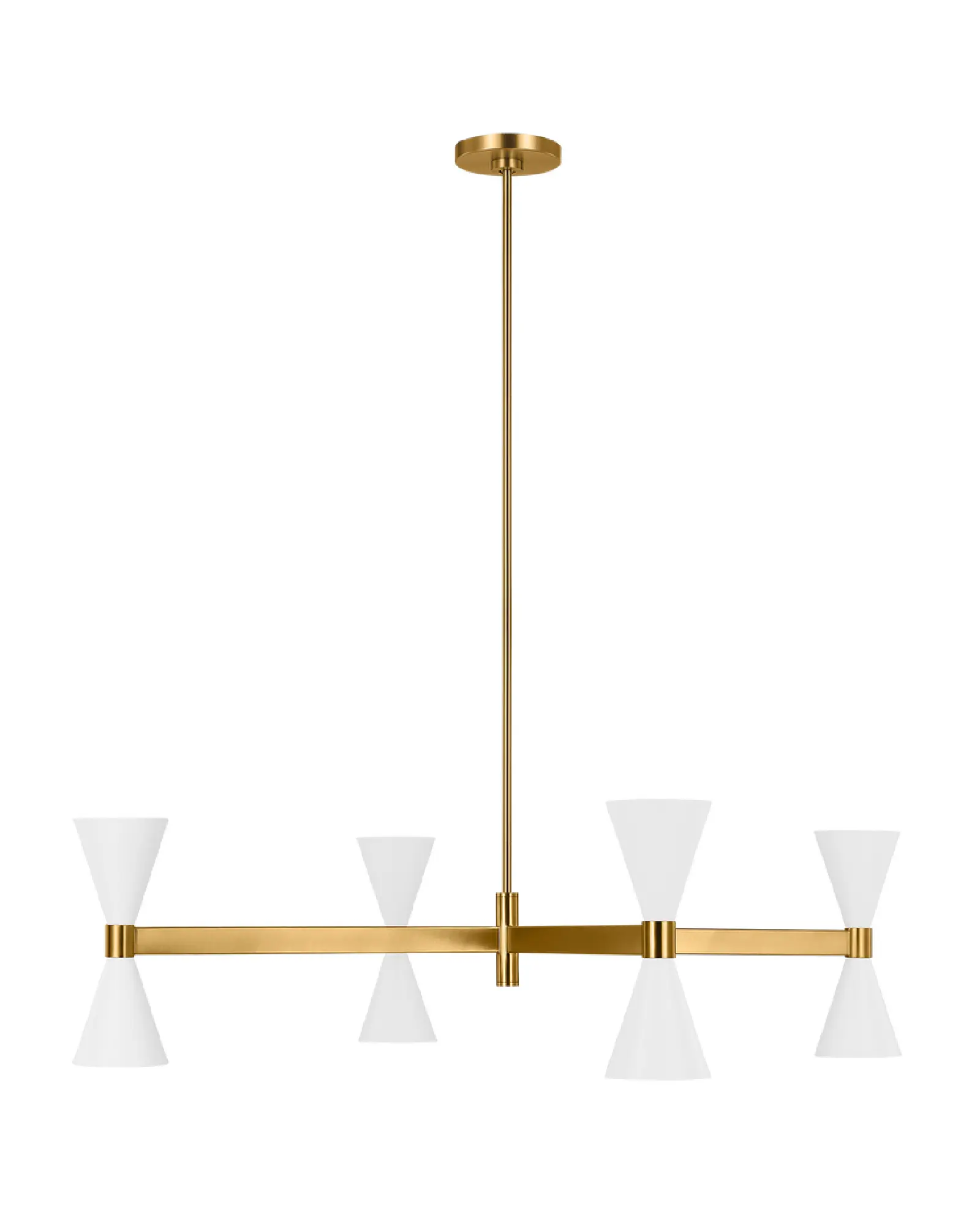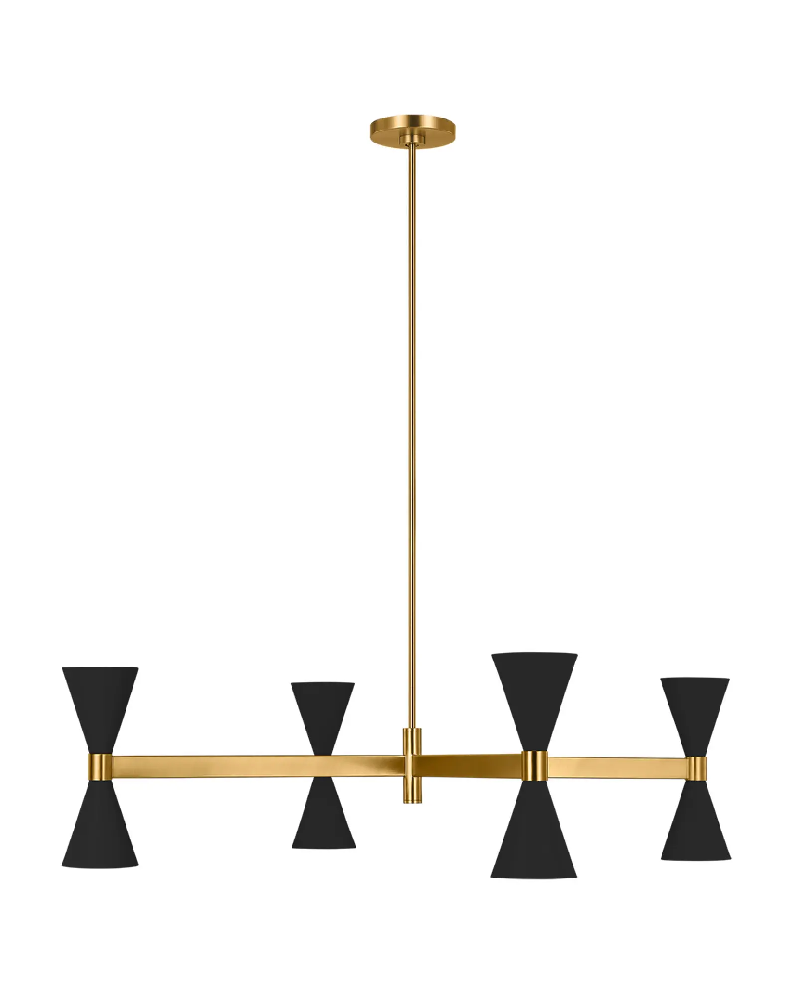 La suspensión lineal Albertine de Visual Comfort Studio refleja la inspiración de mediados de siglo a través de sus acabados contrastados y su encantadora geometría. Sus amplios travesaños se extienden a lo largo de la mesa de comedor o la isla de cocina, mientras que el brillo del travesaño contrasta con los tonos neutros de las dos pantallas cónicas verticales. Estas pantallas bloquean el deslumbramiento lateral, permitiendo al mismo tiempo por un chorro de luz vertical.