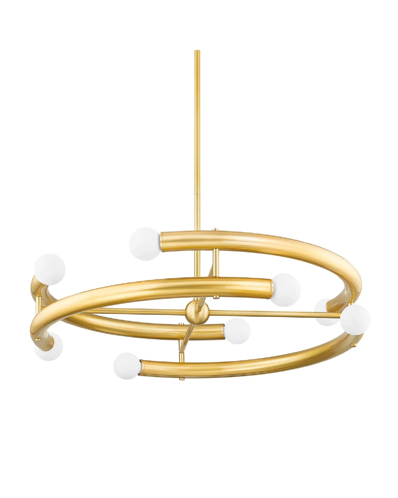 Allegra, una deconstrucción de la reconocible lámpara de araña circular, rompe la forma circular en arcos escalonados separados. Estos arcos orbitan alrededor de una esfera de latón envejecido en el centro y las bombillas están deliberadamente espaciadas a una distancia equidistante entre sí, creando un efecto rítmico y relajante. El aplique toma un único tubo curvado de latón envejecido y lo monta en una placa trasera circular que proporciona tanto luz ascendente como descendente.