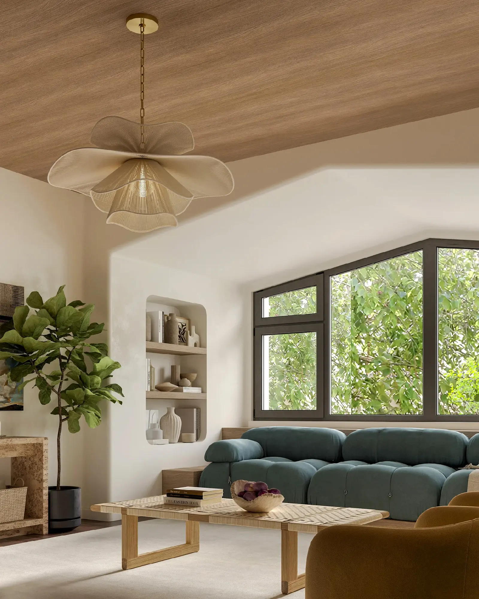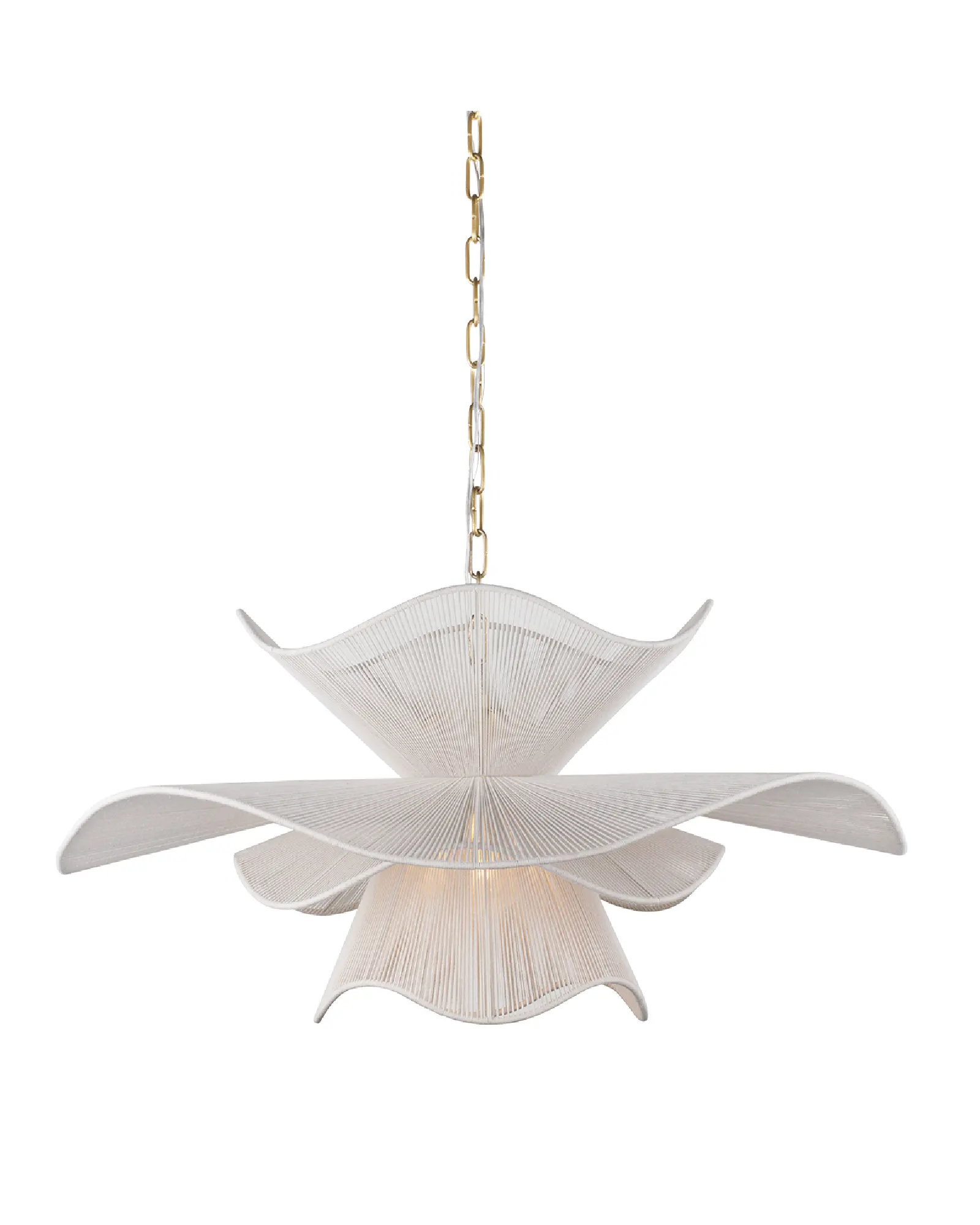 Compuesta de formas orgánicas en capas inspiradas en hojas, la araña Amanda causa un impacto visual a gran escala. Las cuatro pantallas de cuerda de algodón, suavemente ondulantes, crean una sensación implícita de movimiento rítmico. A pesar de su gran tamaño, Amanda es increíblemente ligera y ventilada, lo que la convierte en una pieza central versátil para cualquier espacio.