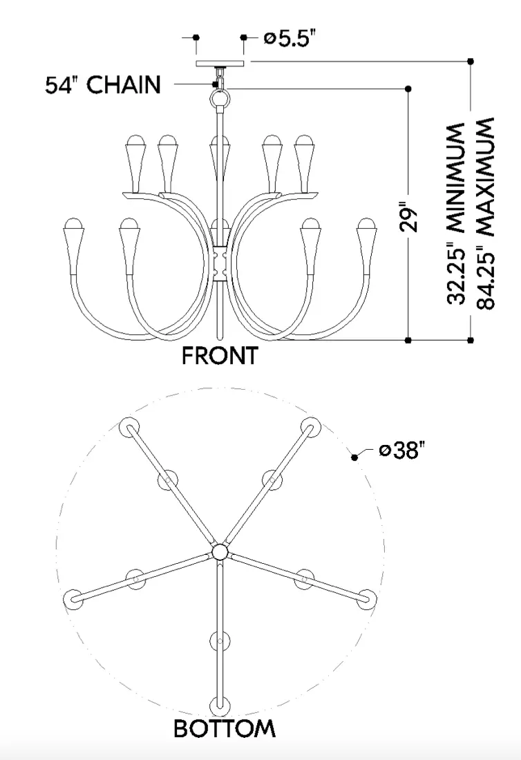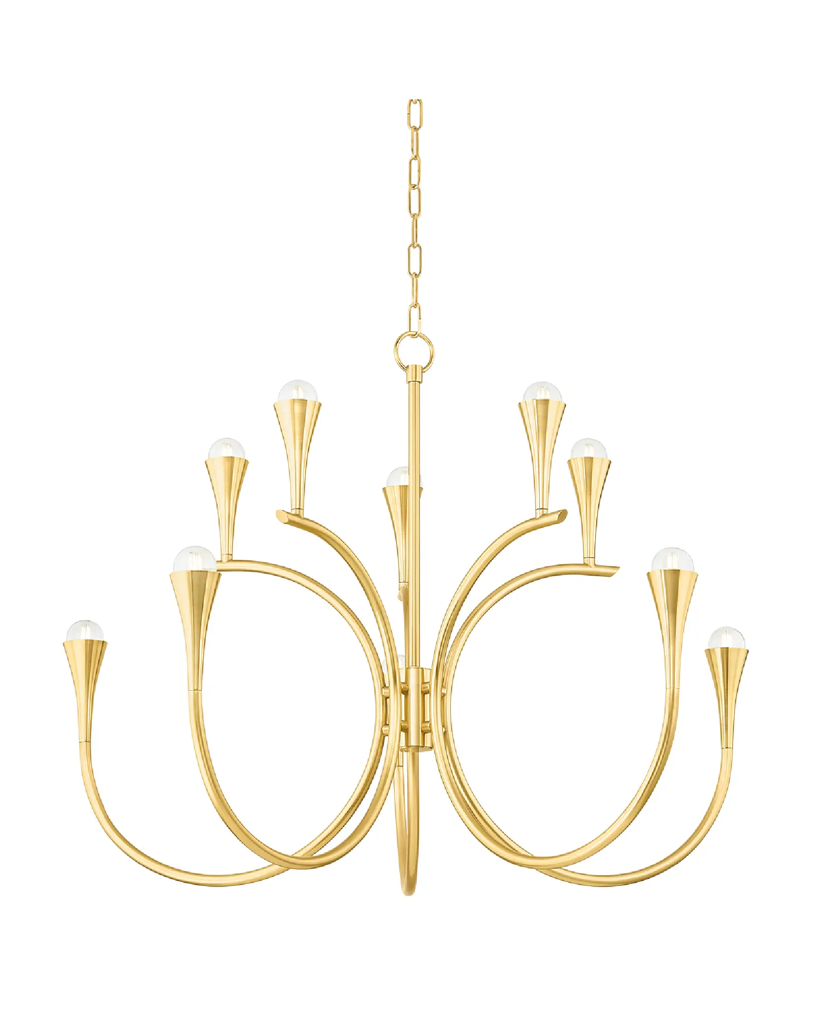 Aviana es una interpretación moderna de una lámpara de araña Art Decó. Las pantallas metálicas, con forma de trompeta, se elevan desde un marco inclinado, llenando de luz tanto el espacio vertical como el horizontal. Los brazos ligeros y elegantes parecen casi musicales, lo que confiere a esta lámpara una cualidad dinámica y alegre.