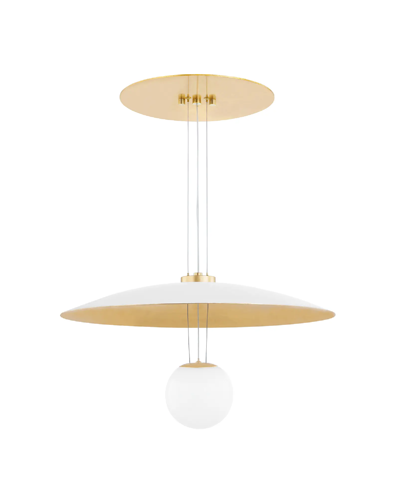 La Brim de la derecha es decididamente más limpia, elegante y moderna. Un trío de finos alambres suspende la suave pantalla blanca del dosel, intencionadamente sobredimensionado. Los cables se extienden por debajo de la pantalla, haciendo que el globo opalino brillante parezca flotar bajo ella.