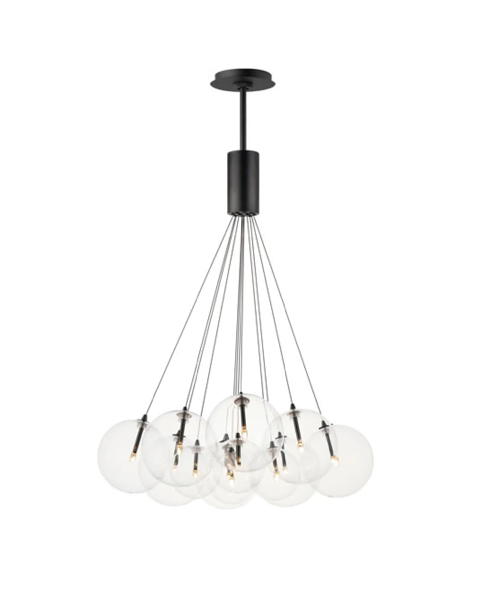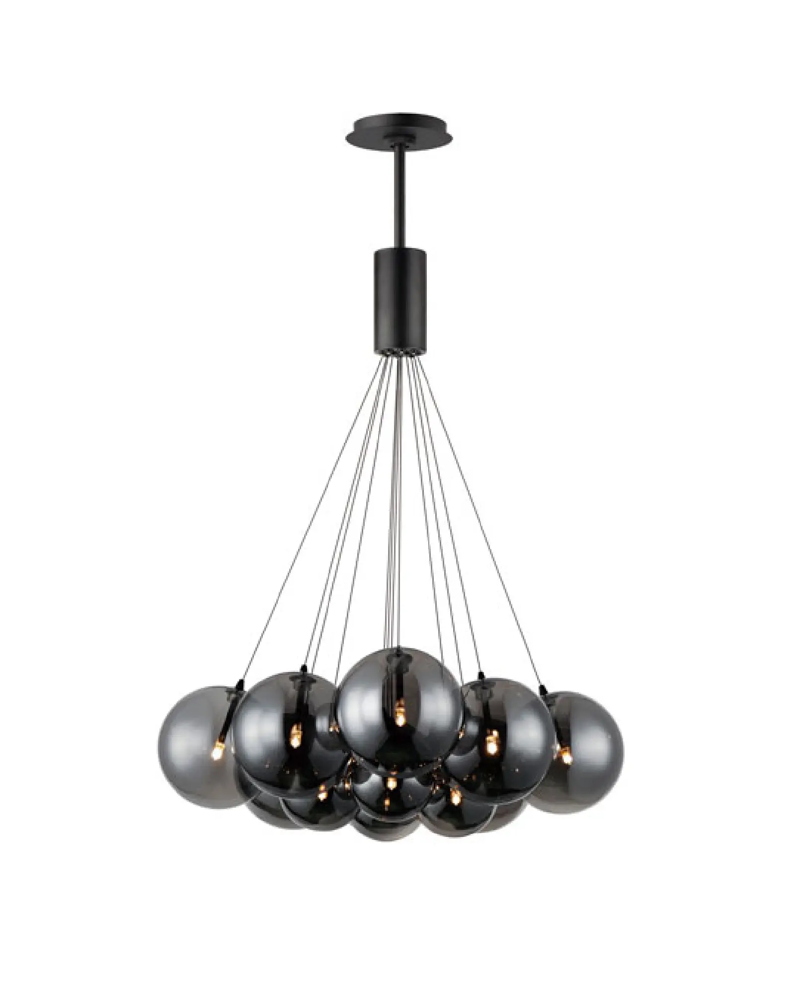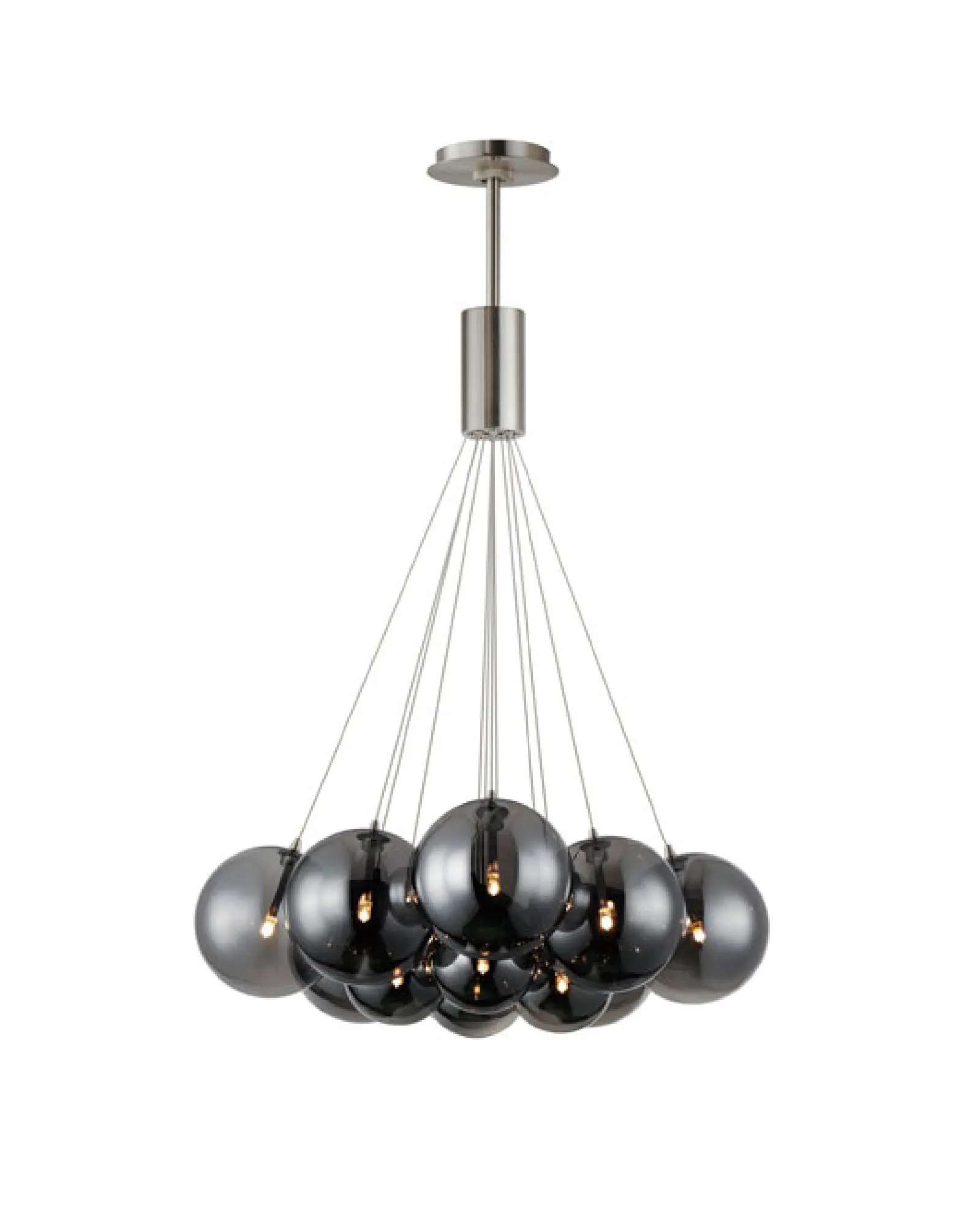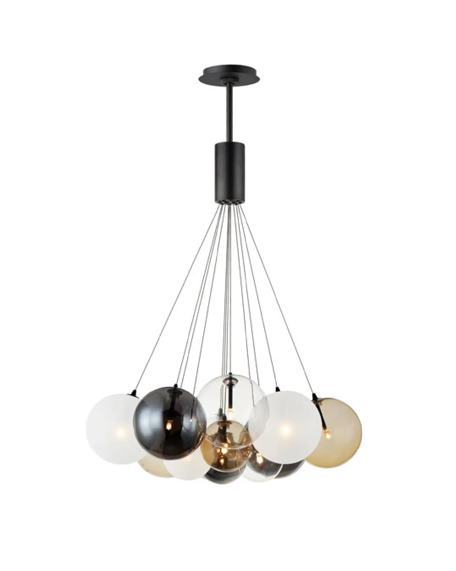 Grupos de globos de cristal de distintos tamaños y colores suspendidos de un punto central que estallan hacia el exterior. Las configuraciones incluyen un racimo de 4, 9 y 12 luces y se pueden montar cerca del techo o incluir varillas para ampliar la altura. Elija entre las opciones de grupos de globos de cristal transparente o esmerilado emparejados con marcos de níquel satinado para un diseño transicional aireado o sea atrevido con cristal ahumado de espejo o una combinación variada del cristal incluyendo tintado ámbar suspendido en un marco negro mate con cables negros finos. Las pequeñas lámparas LED G4 se incluyen con las luminarias y se centran en el cristal acentuando su escala.