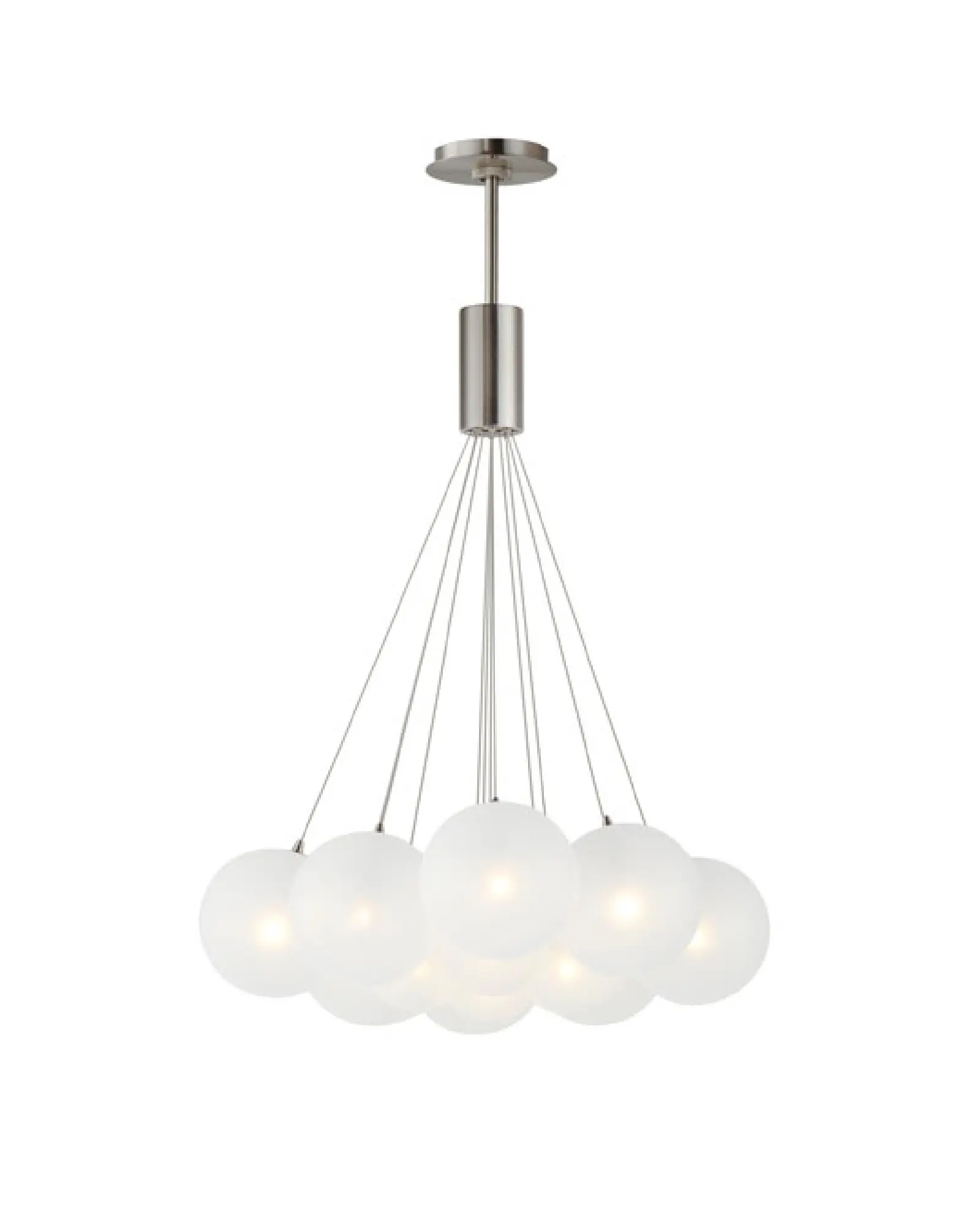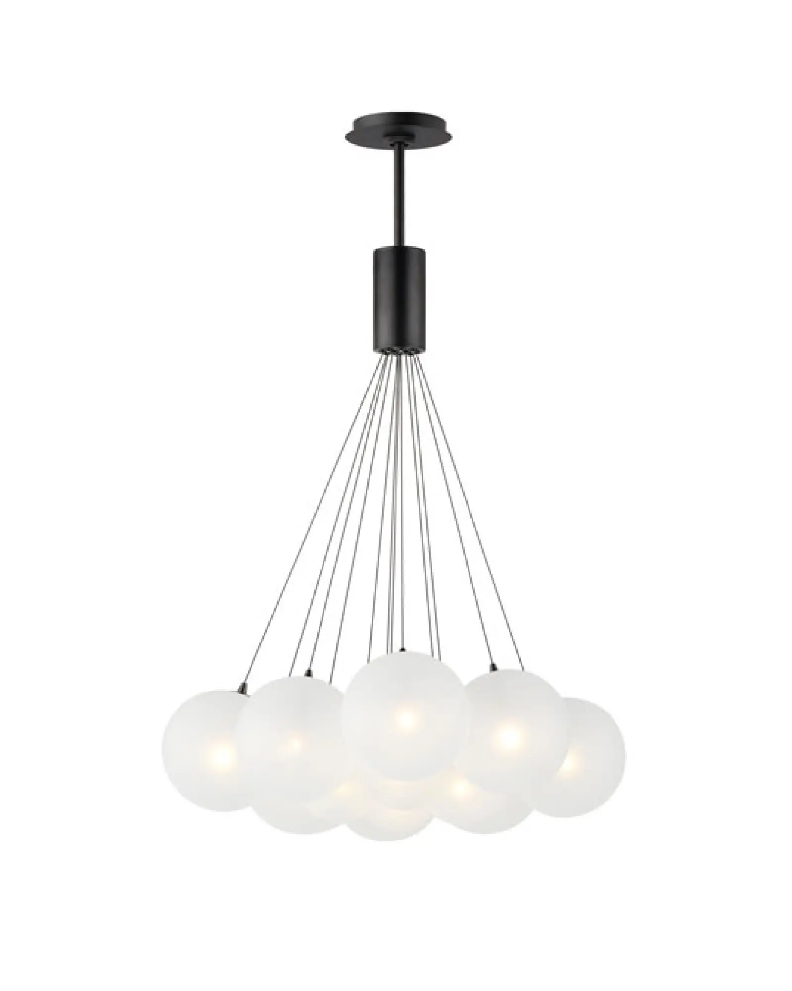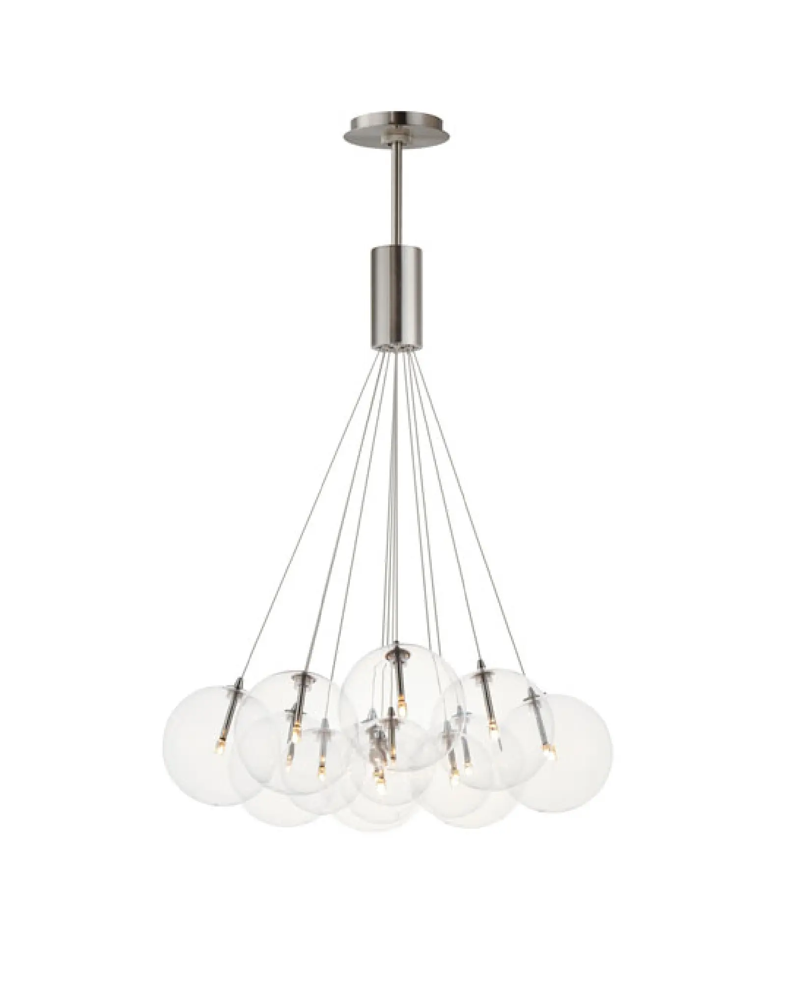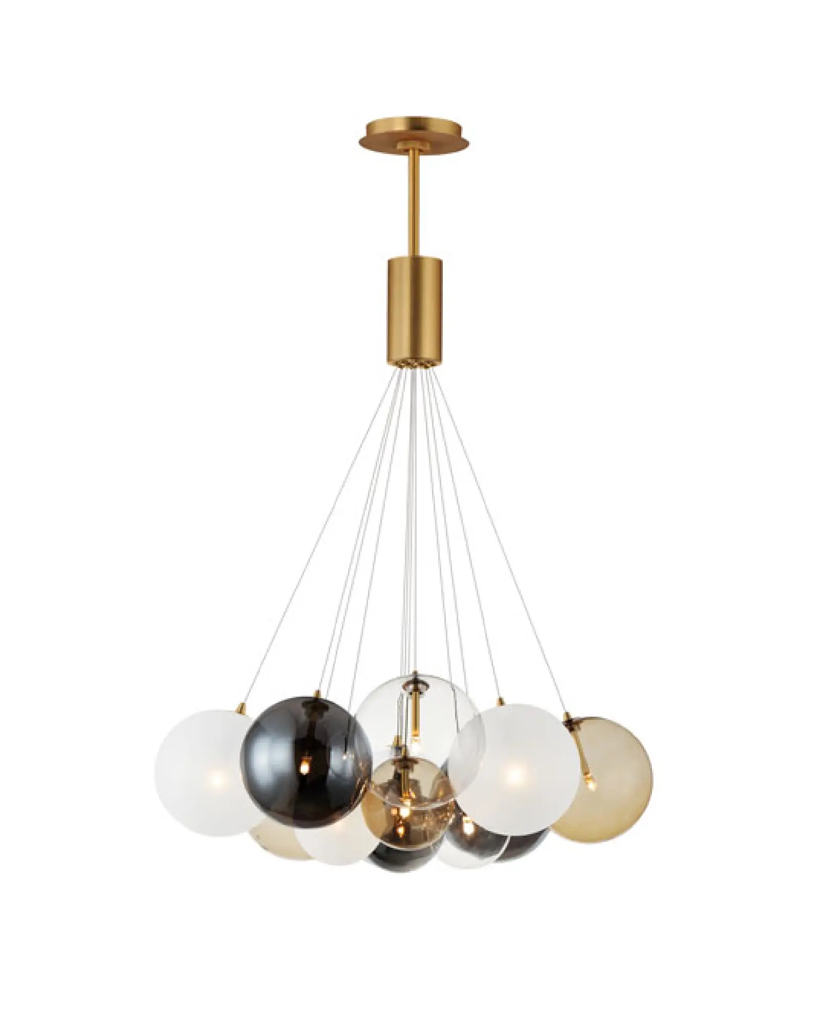 Grupos de globos de cristal de distintos tamaños y colores suspendidos de un punto central que estallan hacia el exterior. Las configuraciones incluyen un racimo de 4, 9 y 12 luces y se pueden montar cerca del techo o incluir varillas para ampliar la altura. Elija entre las opciones de grupos de globos de cristal transparente o esmerilado emparejados con marcos de níquel satinado para un diseño transicional aireado o sea atrevido con cristal ahumado de espejo o una combinación variada del cristal incluyendo tintado ámbar suspendido en un marco negro mate con cables negros finos. Las pequeñas lámparas LED G4 se incluyen con las luminarias y se centran en el cristal acentuando su escala.
