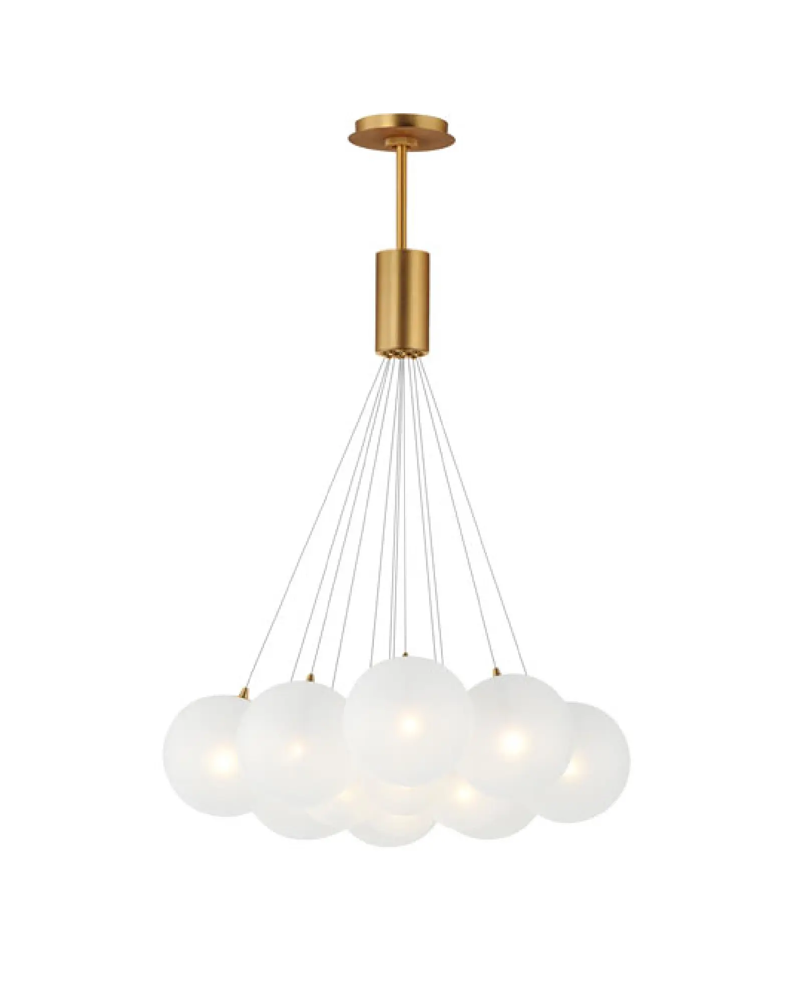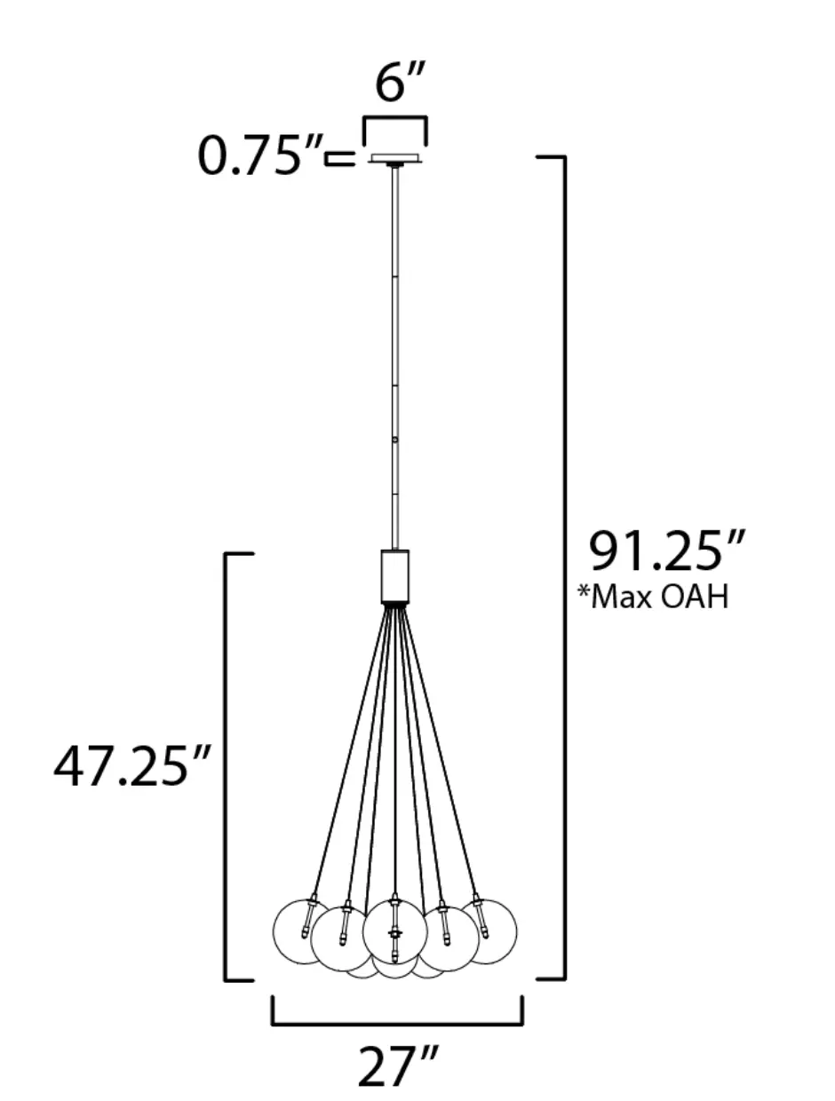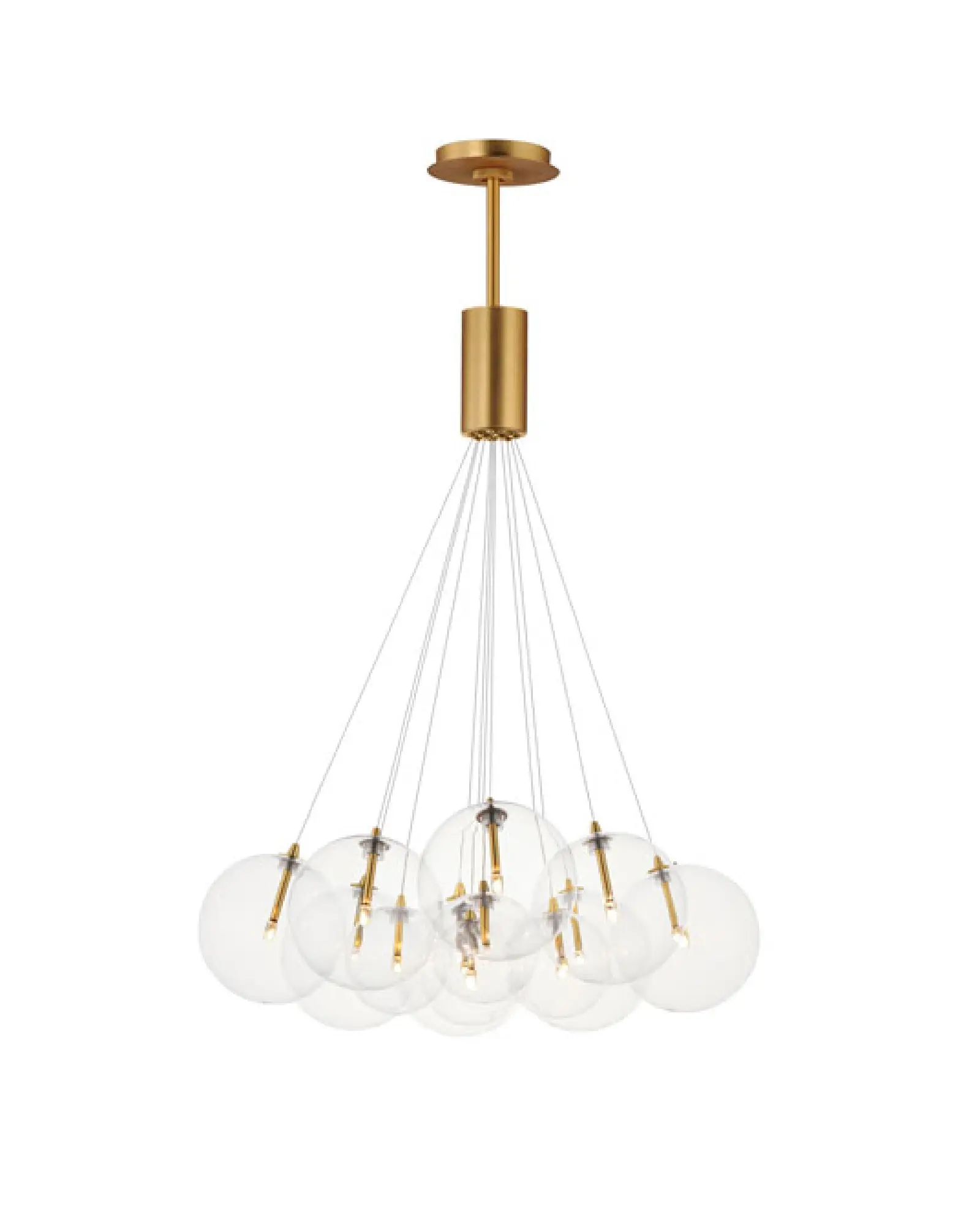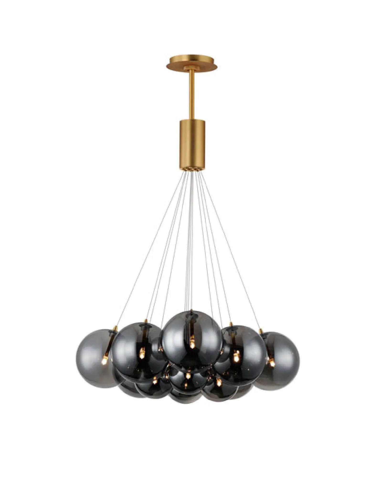 Grupos de globos de cristal de distintos tamaños y colores suspendidos de un punto central que estallan hacia el exterior. Las configuraciones incluyen un racimo de 4, 9 y 12 luces y se pueden montar cerca del techo o incluir varillas para ampliar la altura. Elija entre las opciones de grupos de globos de cristal transparente o esmerilado emparejados con marcos de níquel satinado para un diseño transicional aireado o sea atrevido con cristal ahumado de espejo o una combinación variada del cristal incluyendo tintado ámbar suspendido en un marco negro mate con cables negros finos. Las pequeñas lámparas LED G4 se incluyen con las luminarias y se centran en el cristal acentuando su escala.