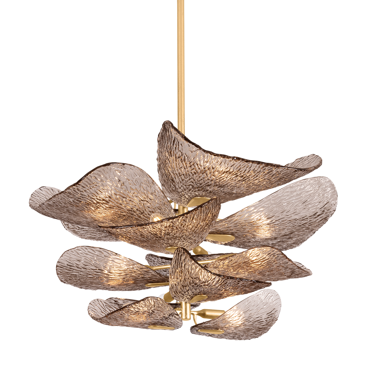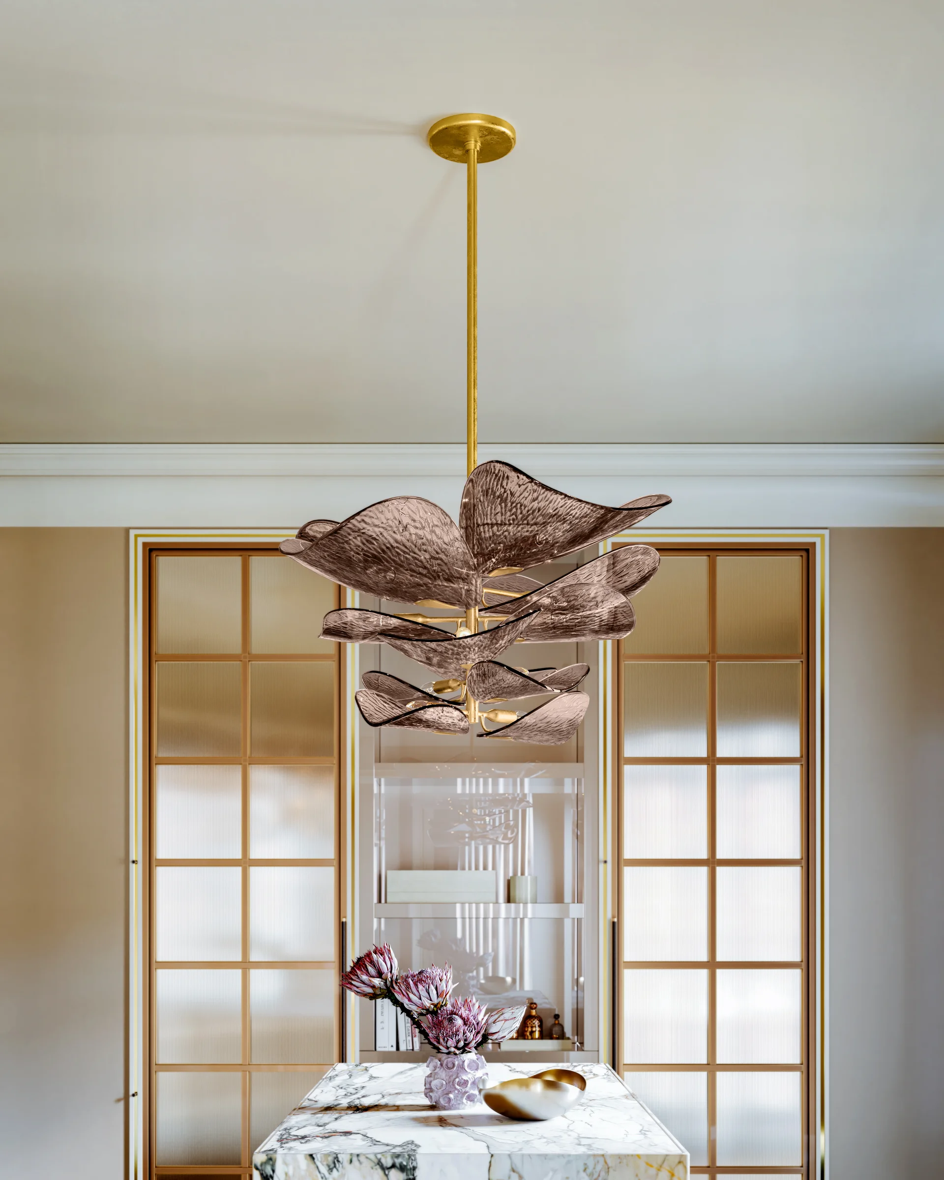 Las ondulantes «pétalos» de cristal Piastra en bronce oscuro están cuidadosamente dispuestos alrededor de un «tallo» central, lo que le da al diseño un efecto flotante y en capas. Cada pétalo ha sido grabado con un patrón óptico en forma de rayos de sol para añadir dimensionalidad.
