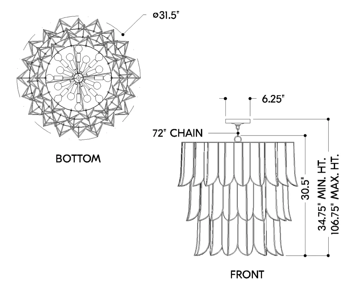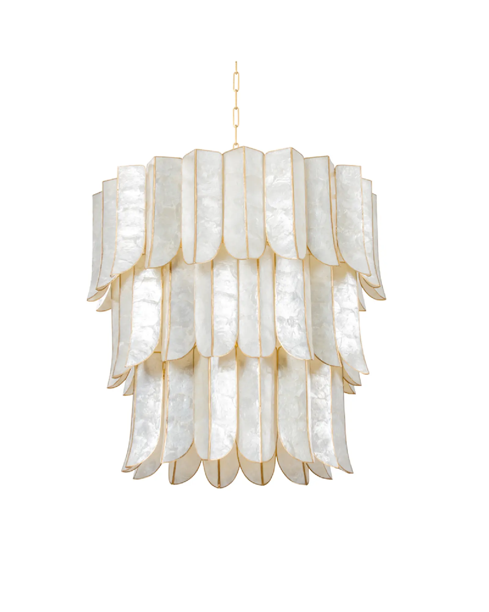 Capturando el dinamismo de su ciudad homónima, Cartagena es una figura impresionante con sus brillantes capas y su exquisita materialidad. Capas de brillantes paneles en forma de hoja hechos a mano de fina concha Capiz exudan dramatismo y decadencia. El pan de oro vintage realza el glamour de esta pieza, que se presenta como aplique o araña en tres tamaños.