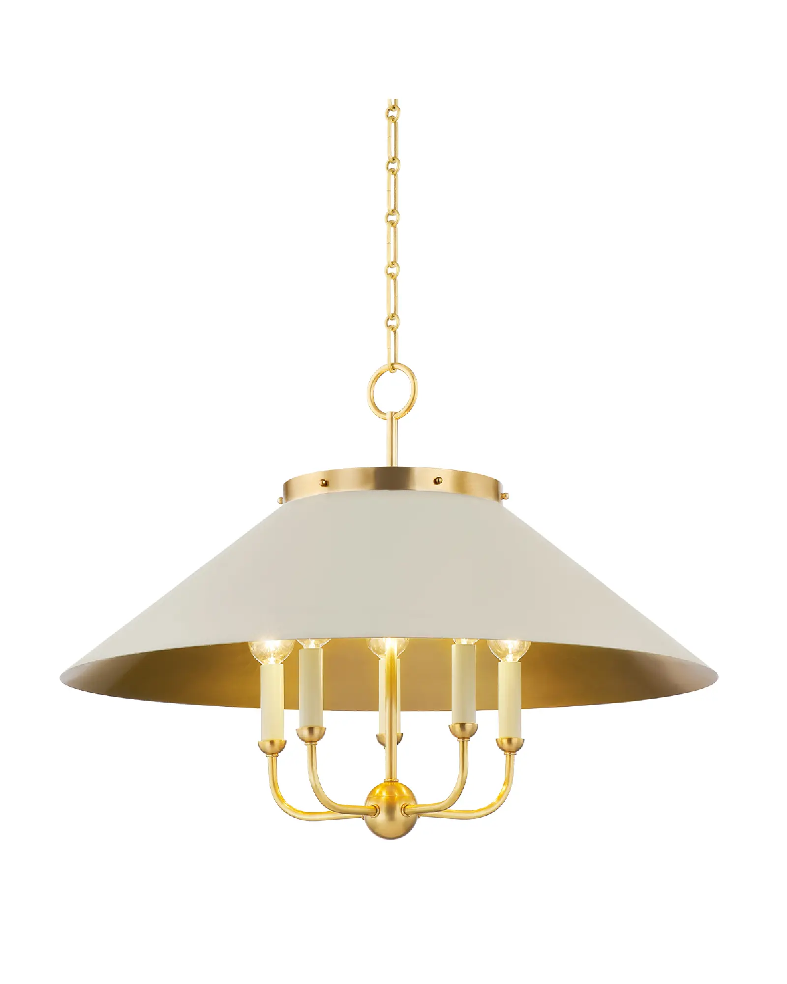 Este diseño clásico de pantalla metálica se siente especial a nuevas combinaciones de acabados y elegantes detalles inspirados en el patrimonio. Los acentos contrastantes de latón envejecido y el moderno brazo de cuello de cisne confieren a las lámparas colgantes y al candelabro un aire renovado pero clásico. La pantalla cónica sobre un candelabro de cinco luces confiere al candelabro un nuevo atractivo tradicional. Cada lámpara cuenta con una pantalla de latón envejecido, con interior metálico y exterior pintado en blanco roto. Parte de nuestra gama Mark D.