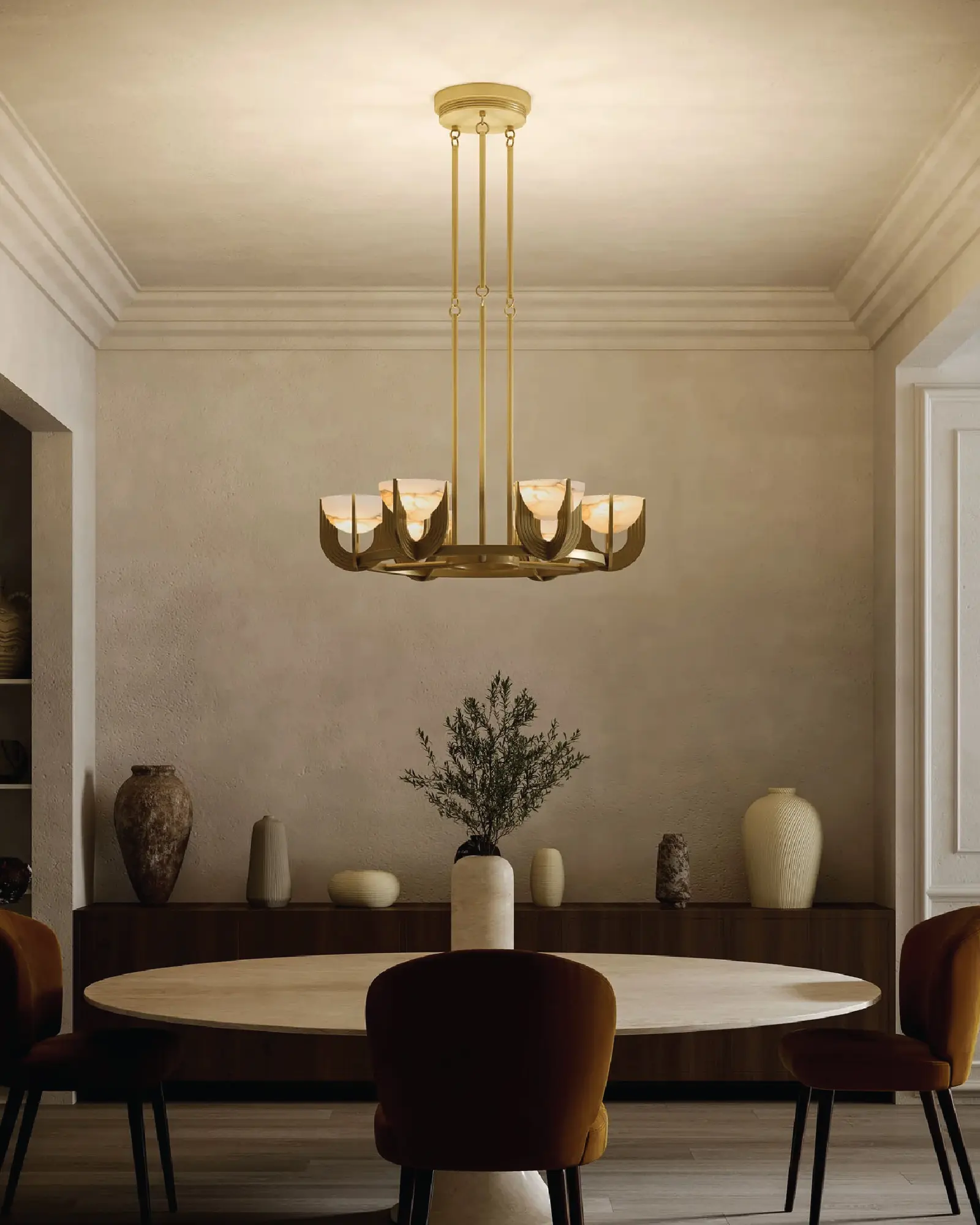 Conozca la colección Colette, donde el Art Déco clásico se une al encanto contemporáneo. Disfrute de las suaves curvas de la estructura metálica en forma de U de Colette, que envuelve cuencos luminosos de piedra de alabastro natural, proyectando un resplandor suave y romántico que transforma cualquier espacio.