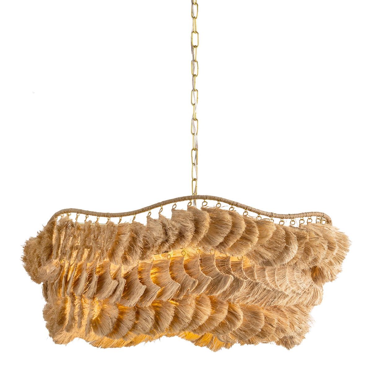 La estructura ondulada y envuelta queda al descubierto en la parte superior, resaltando la suspensión de cada pieza independiente de la pantalla. Suaves y fluidas hebras de fibra de plátano con textura ondulada se orientan en diferentes direcciones para crear una luminaria de aspecto desgreñado. El acabado en latón envejecido añade un toque pulido a esta belleza inspirada en el arte textil. Daria está disponible en dos tamaños.