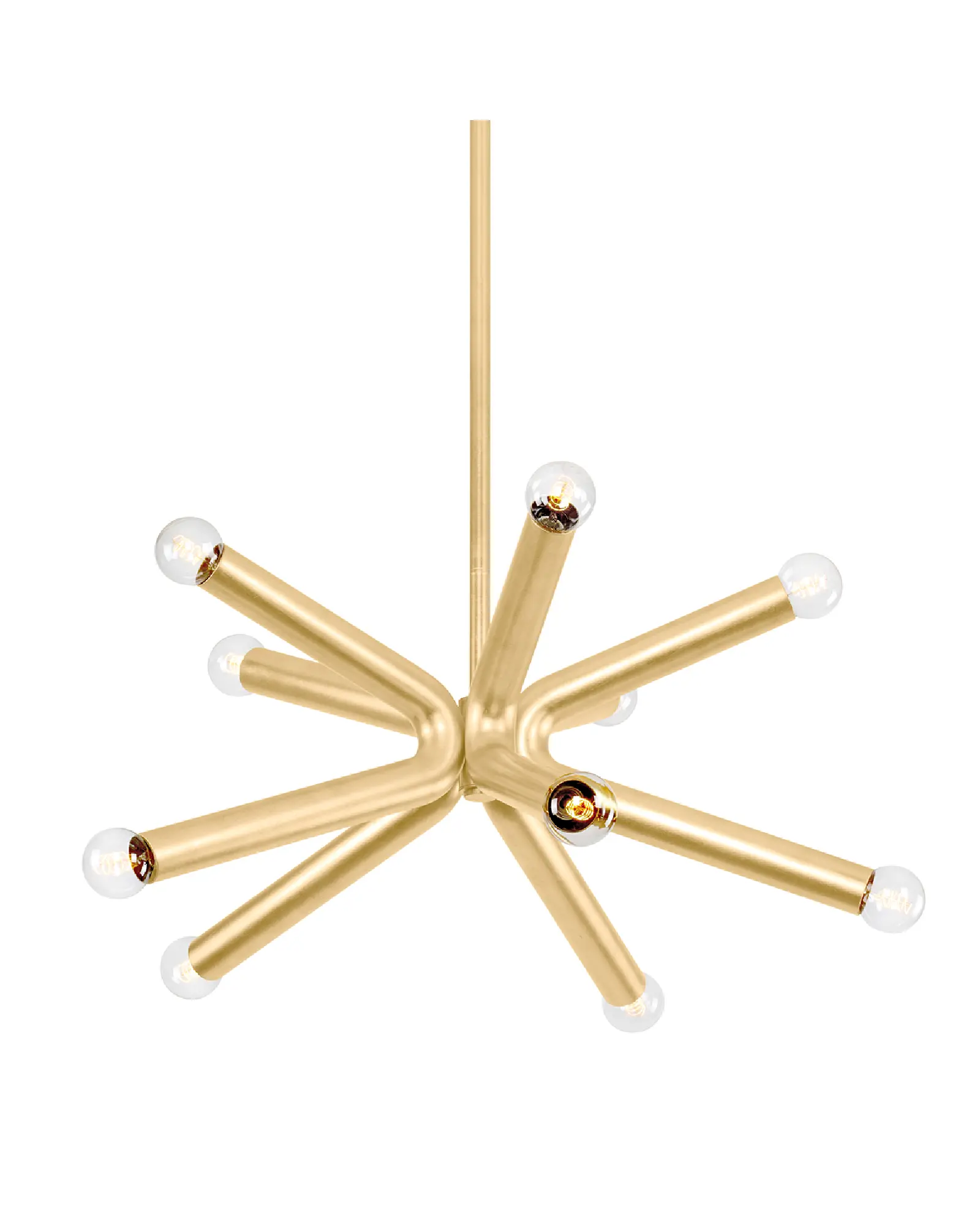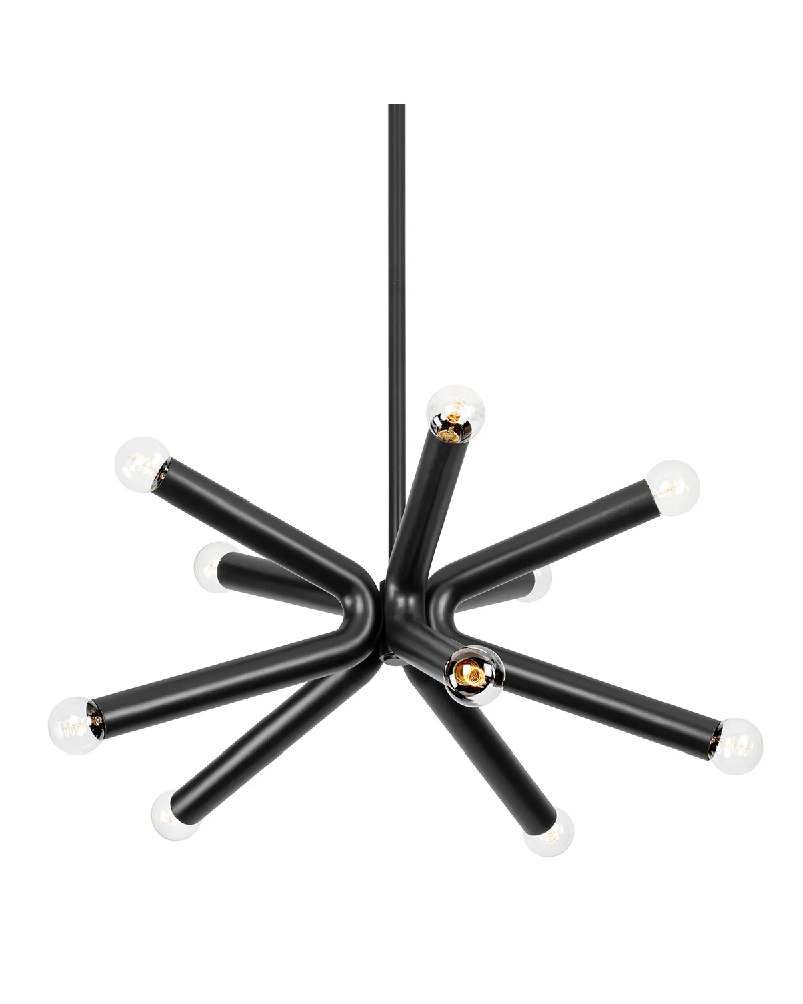Una serie de gruesos tubos metálicos curvados se combinan para formar una llamativa silueta tipo Sputnik de ocho o diez luces. Esta araña de diseño cuidado proporciona una amplia iluminación con luz ascendente y descendente. Mantenga la frescura en el acabado Soft Black o añada un poco de calidez en Vintage Golf Leaf.