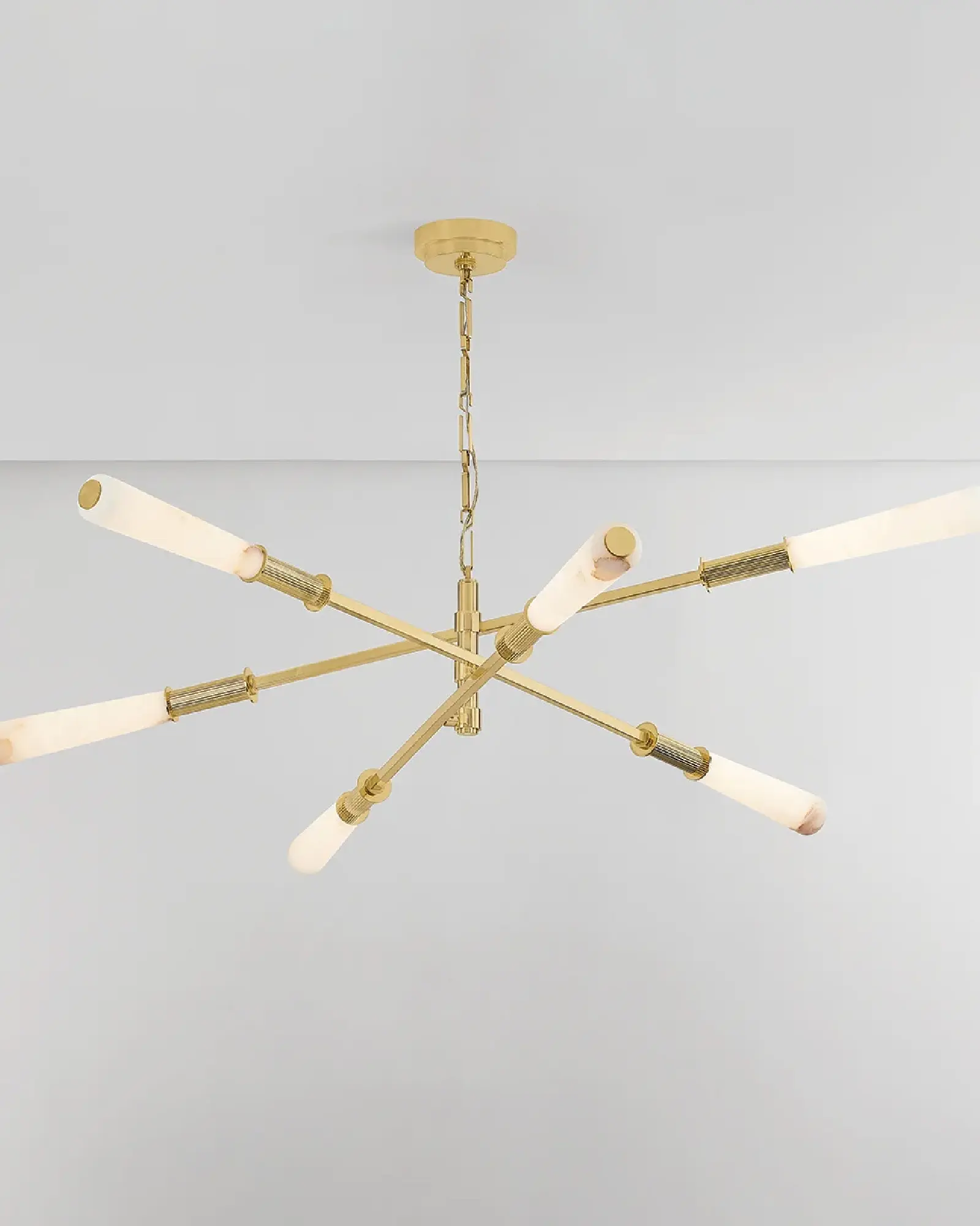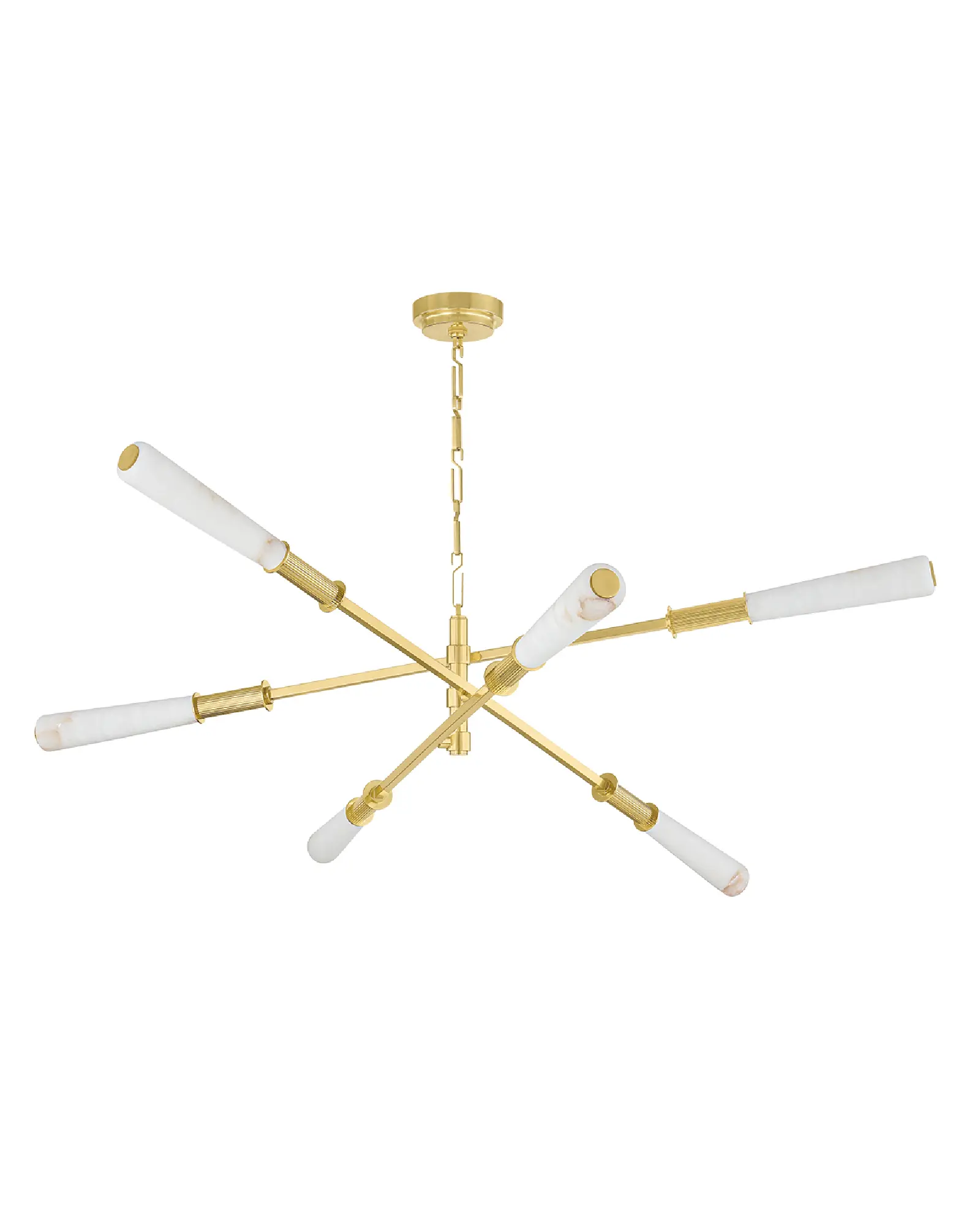 La moderna lámpara de araña Dashiell, de inspiración móvil, está diseñada para suscitar conversaciones. Aunque está fabricada con materiales sustanciales, esta lámpara mantiene una apariencia ligera y equilibrada con una innata sensación de movimiento. Los esbeltos brazos de latón pulido vintage están rematados con pantallas cilíndricas cónicas de alabastro, que añaden una nota de contraste a la elegante luminaria. Los característicos soportes acanalados de las pantallas aportan un estilo adicional. Iluminada por LED, Dashiell está disponible en dos tamaños.