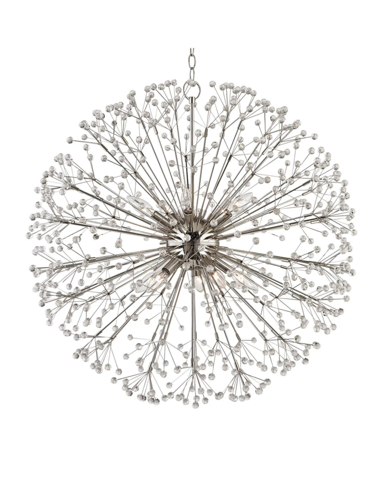 Densamente poblada con las cuentas de cristal biselado de mayor calidad, Dunkerque irrumpe en escena con una presencia espectacular. Las bombillas tipo candelabro iluminan desde el interior de las ramas cargadas de cristal, logrando un efecto deslumbrante e hipnotizador. Con una estética que evoca fuegos artificiales, Dunkerque se convierte en la pieza central de cualquier espacio, destinada a provocar asombro. Disponible en dos tamaños para montaje empotrado y en tres tamaños como lámpara de araña, estas luminarias pueden usarse de forma individual o en conjunto para lograr un impacto visual aun mayor. Disponible en acabados de latón envejecido o níquel pulido.