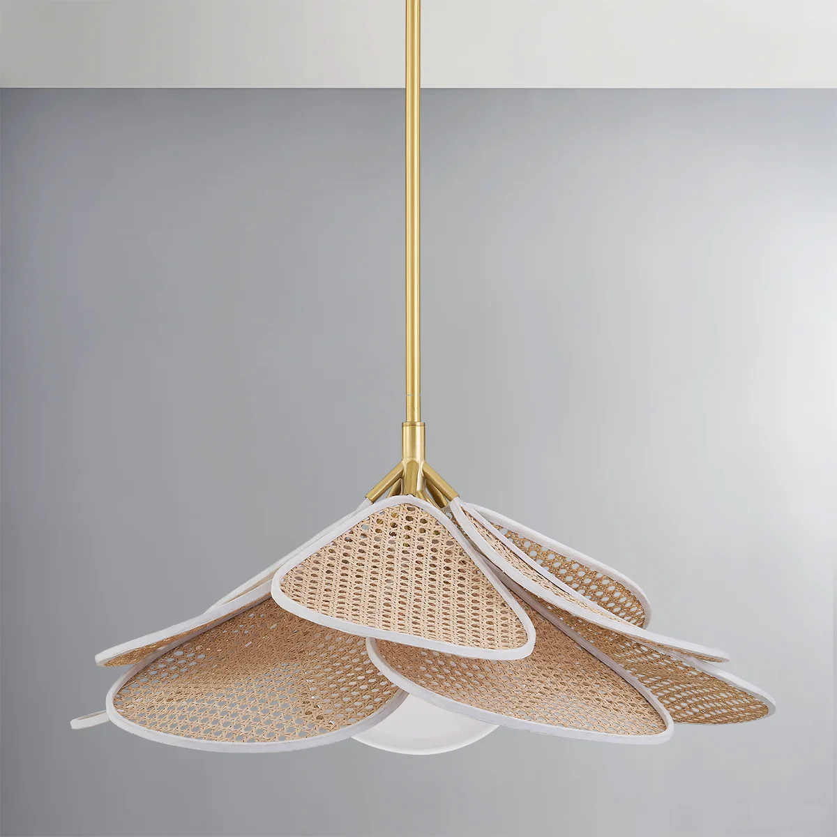 Los pétalos de mimbre natural están recortados en algodón blanco y dispuestos en capas alrededor de una esfera de cristal opalino brillante para conferir a Florina su estética floral natural y etérea.