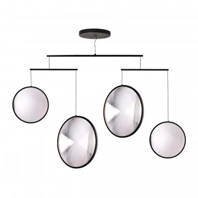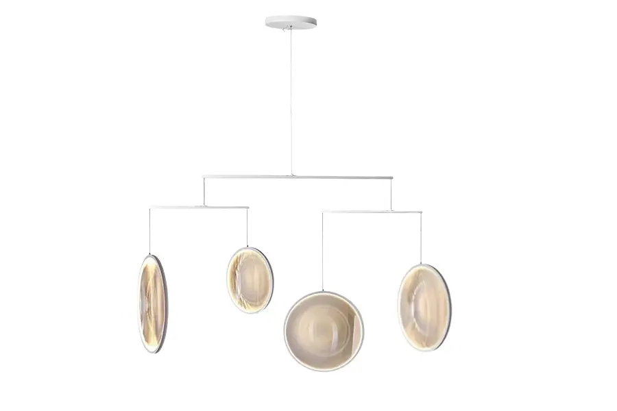 El trabajo del diseñador Yuji Okitsu considera la forma como el aspecto clave de un espacio, mejorando la vida cotidiana. Okitsu aporta un enfoque de diseño refinado que se refleja en la delgada barra transversal y la delicada combinación de alambres de la lámpara. Los alambres dirigen la mirada hacia los anillos metálicos abiertos que albergan una serie de LED y un difusor acrílico. El acrílico actúa como una lente, centrando la mirada en sus reflejos y destellos fascinantes.