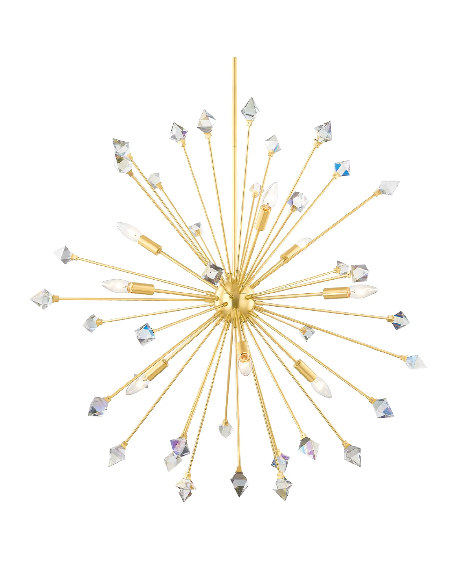 El estilo sputnik, una maravilla de mediados de siglo, ha cautivado a los amantes del diseño durante décadas. Genesis reimagina este icono, aportando un glamour celestial en forma de estrella. Danzando entre cada fuente de luz hay cristales iridiscentes, creando prismas de luz por toda la habitación. Con un acabado en latón envejecido, la lámpara de pared, la lámpara empotrada y la lámpara de araña Genesis son la pieza que necesita para llamar la atención.