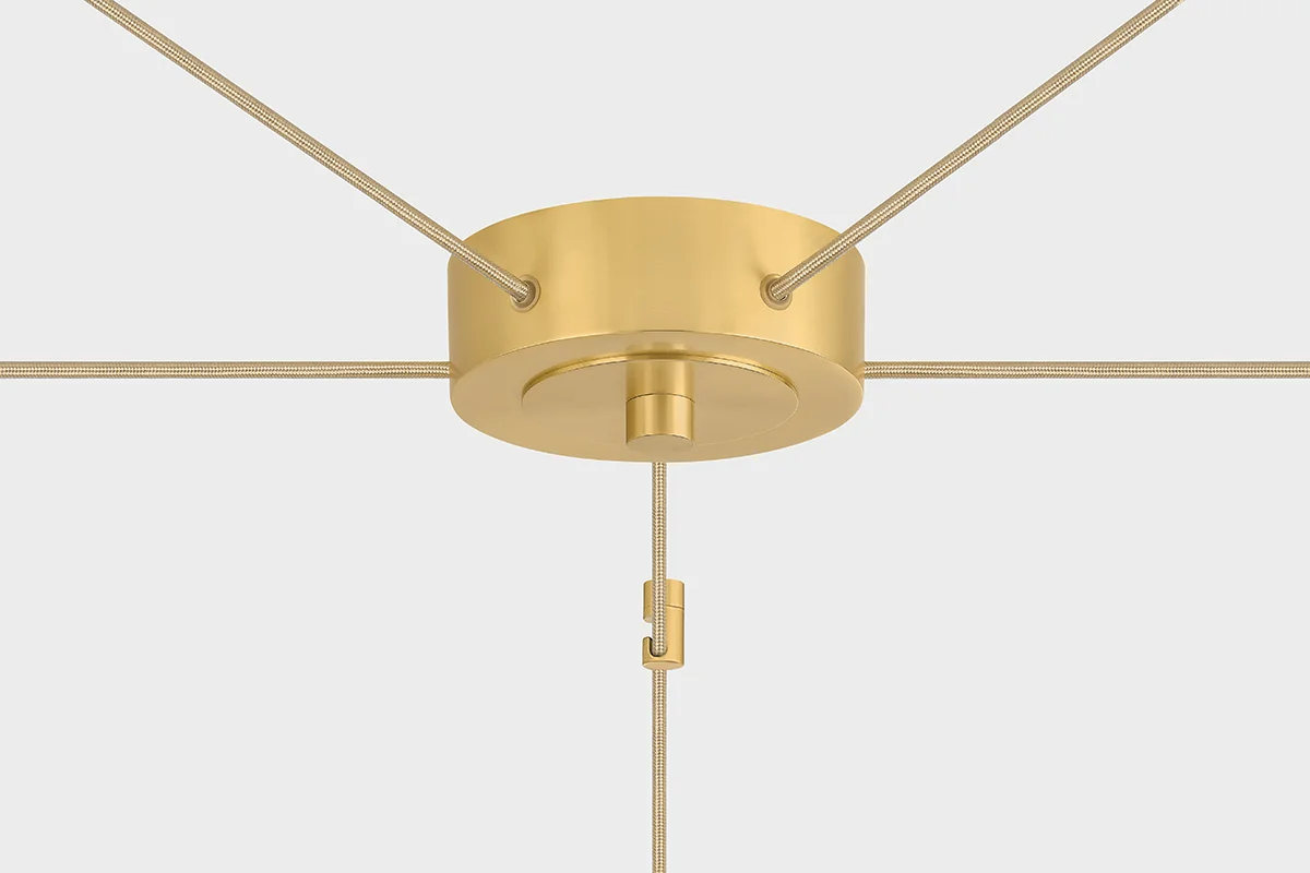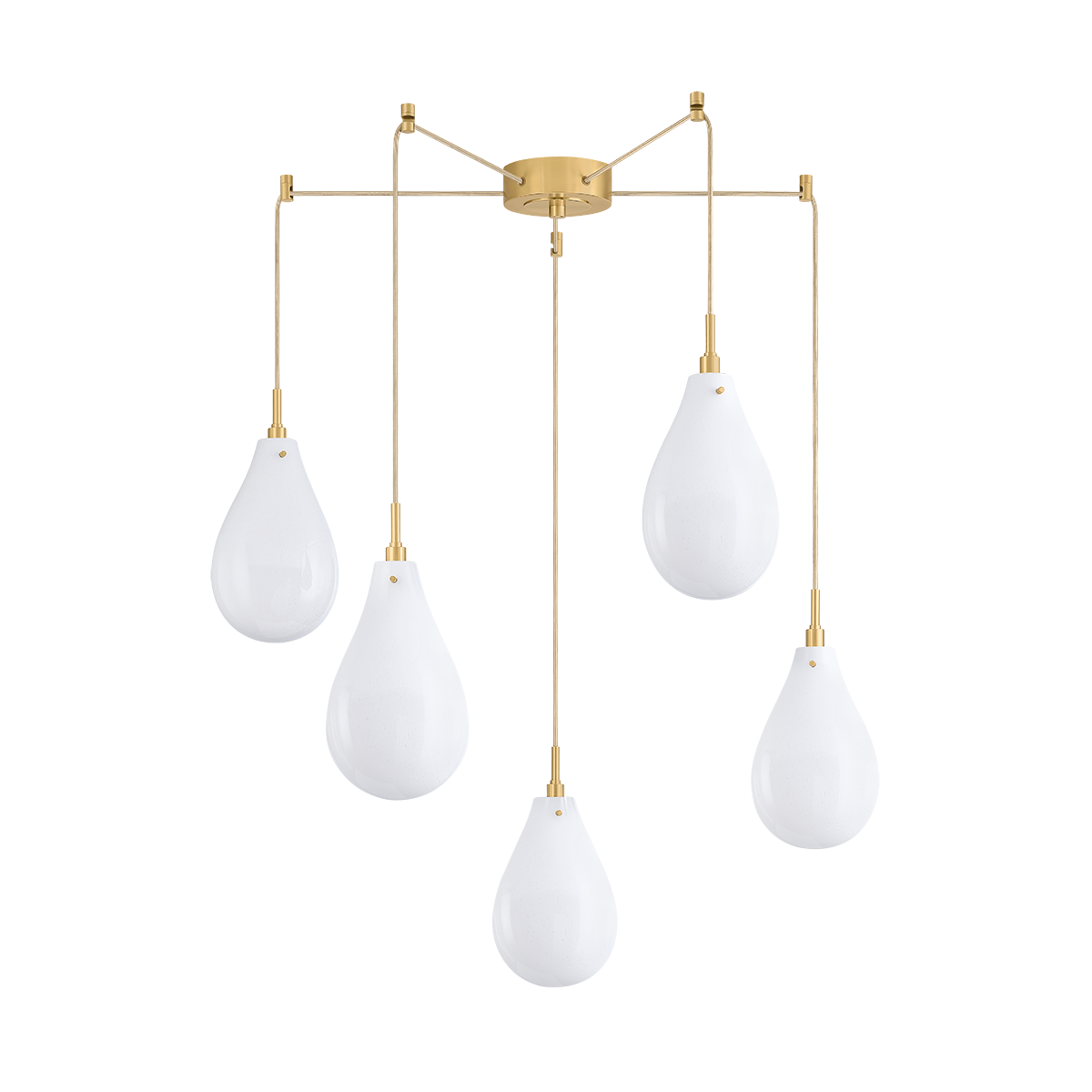 La lámpara de araña Ironwood cuenta con numerosas pantallas suaves y colgantes que recuerdan a gotas de lluvia. El cristal opalino con textura granulada confiere a cada forma un aspecto orgánico y texturizado, mientras que el acabado en latón envejecido añade un toque de elegancia al diseño inspirado en la naturaleza.
