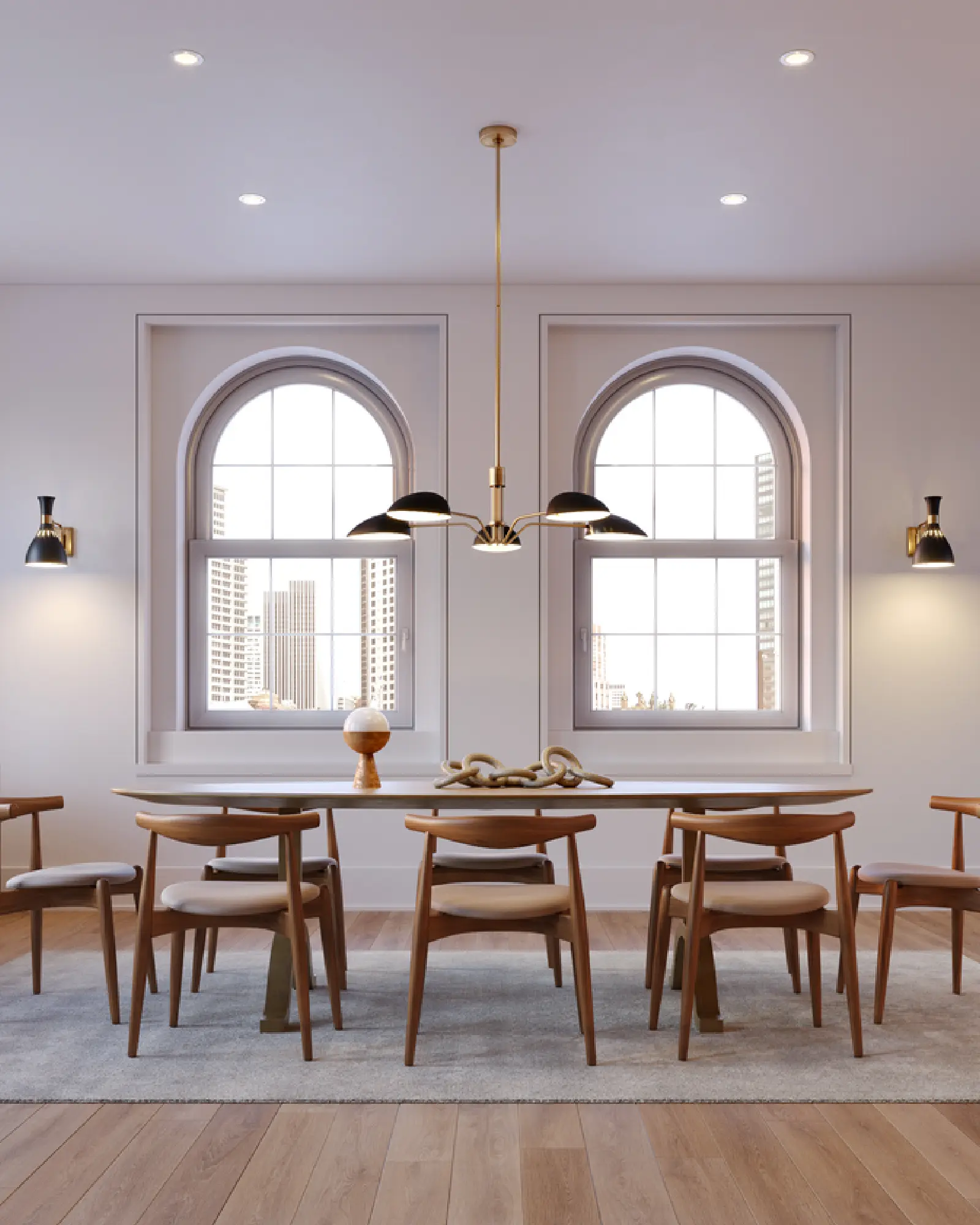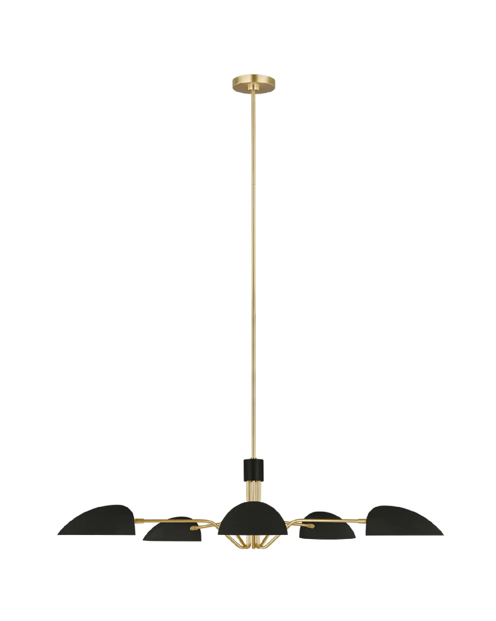 Un diseño sencillo de inspiración retro.Todo el conjunto está fabricado en acero para garantizar su durabilidad. Cuelga del techo mediante una varilla, y cinco brazos se extienden desde la base. Cada brazo sostiene una pantalla curva que dirige la luz hacia abajo, lo que la hace perfecta sobre una mesa de comedor o un futbolín.