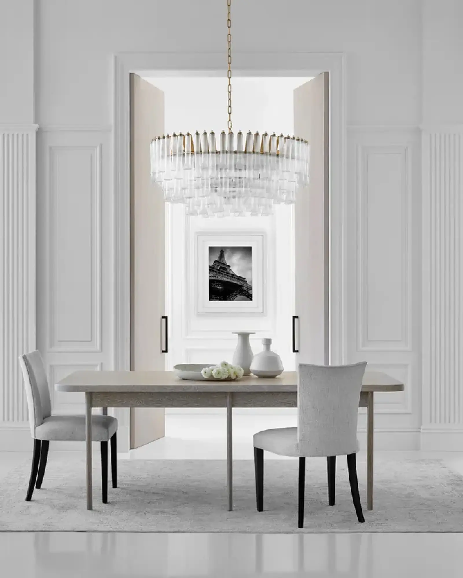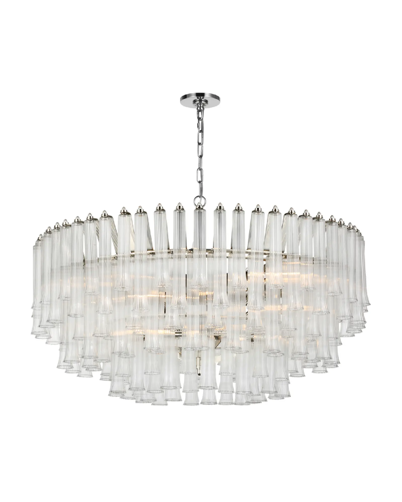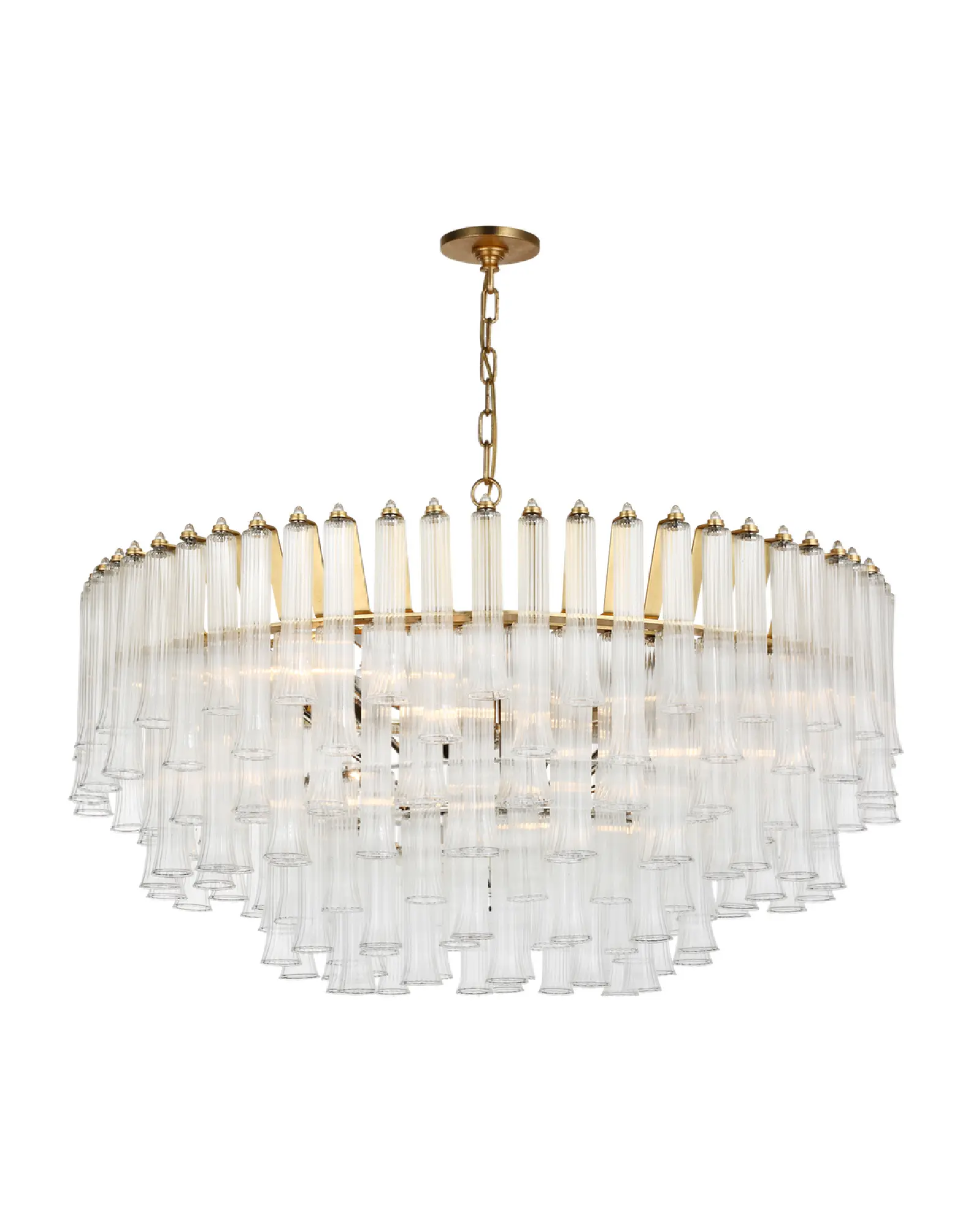La lámpara Lorelei diseñada por Julie Neill presenta elegantes tubos de cristal estriados dispuestos cuidadosamente en cascada, formando círculos concéntricos alrededor de un marco pulido. Con reminiscencias de flecos del art decó, sus apliques darán un toque decadente a cualquier espacio, ya sea grande o pequeño.