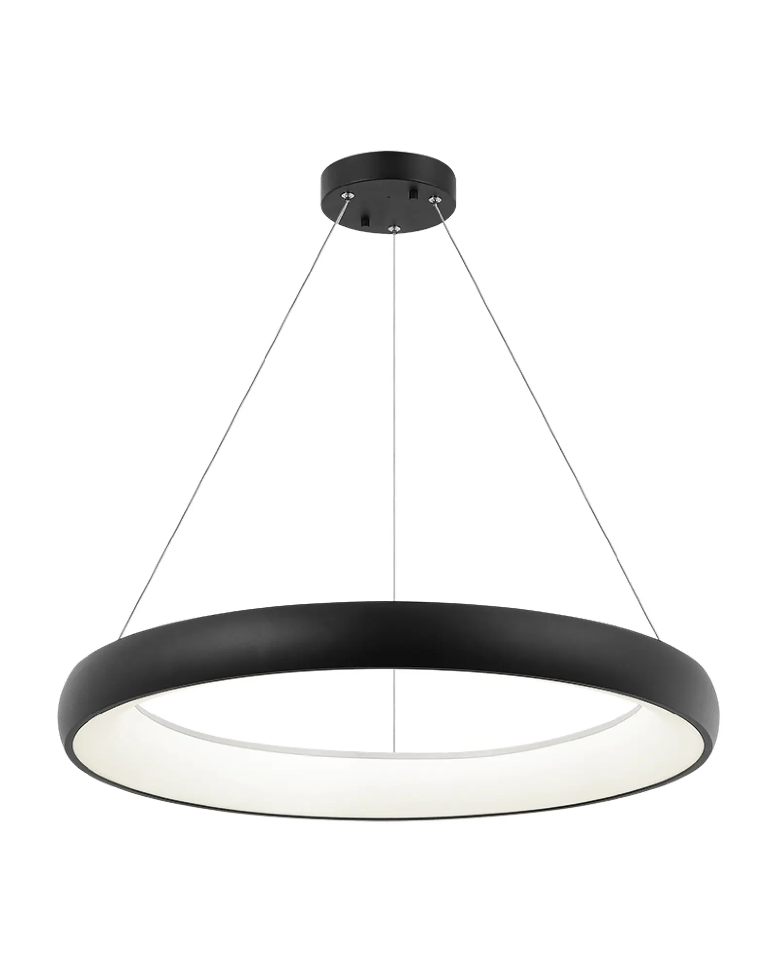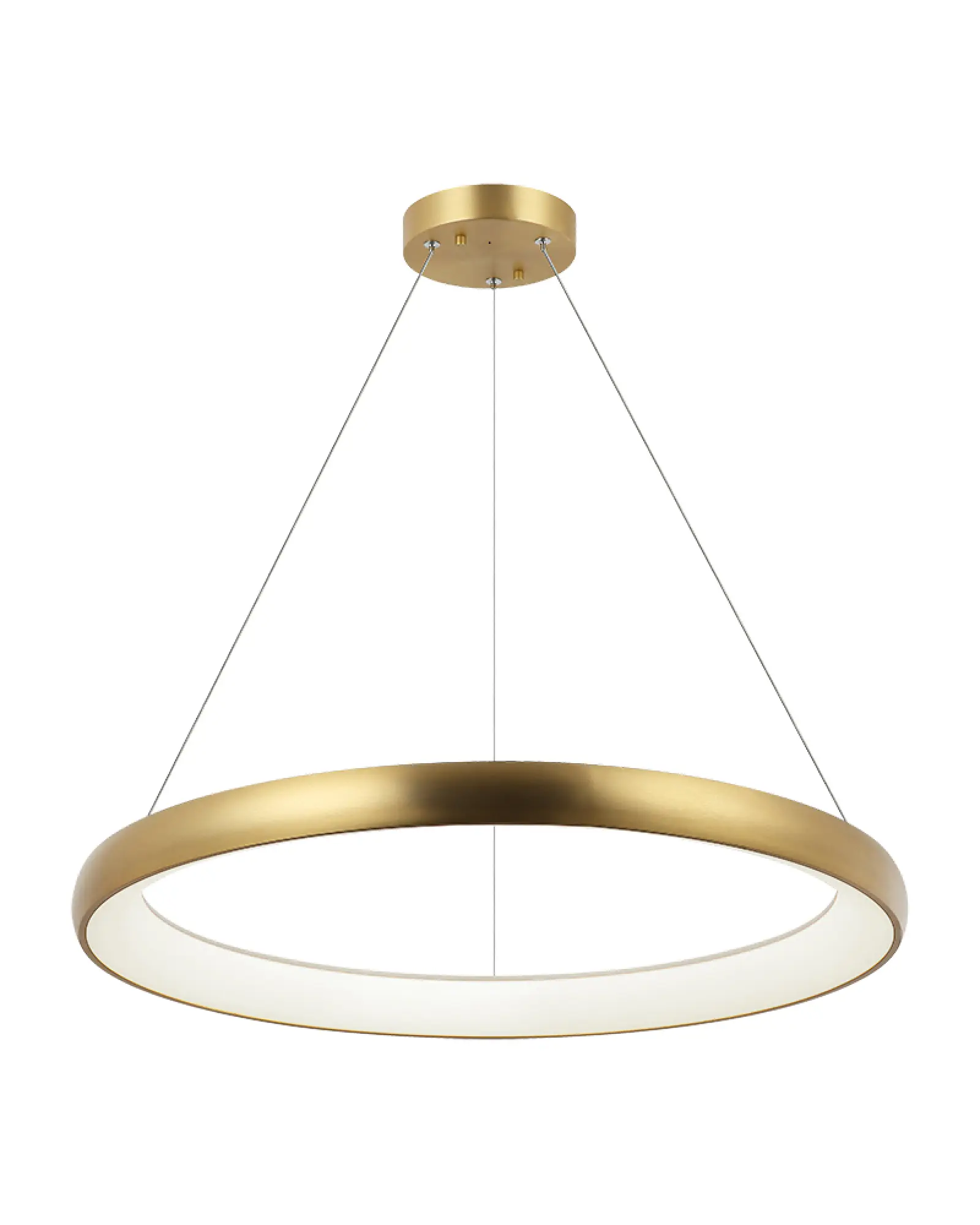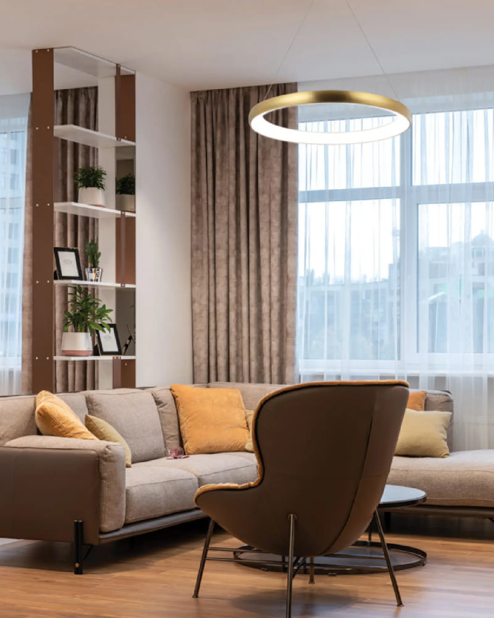 La Maverick es una familia moderna, perfecta para actualizar cualquier espacio. Los bordes metálicos en dorado y negro mate perfilan la luz LED, creando una luminaria elegante.