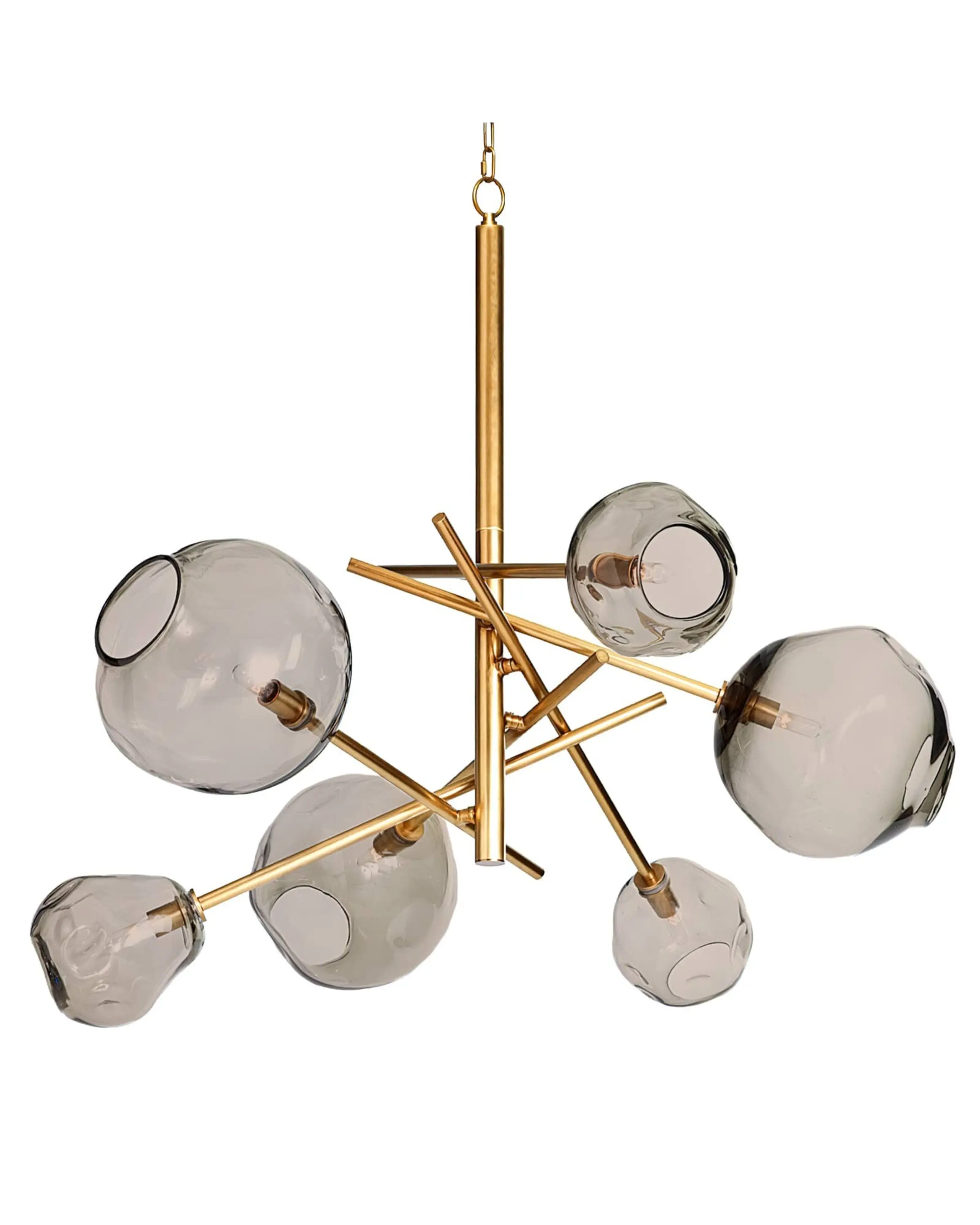 La variación natural de la pantalla de cristal ahumado crea un cautivador juego de luces y contrastes, que se complementa a la perfección con el cálido atractivo de los tubos lineales de latón natural.