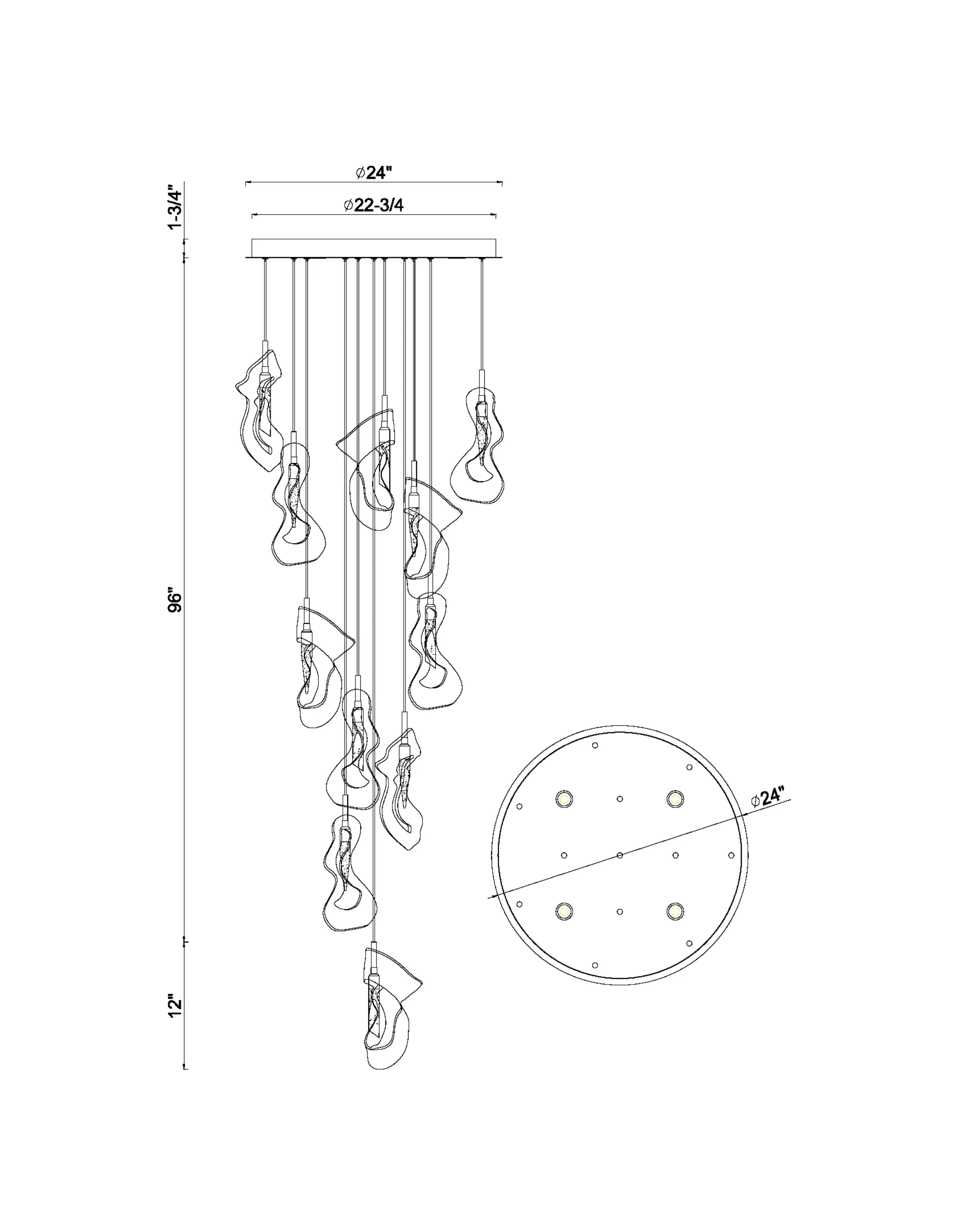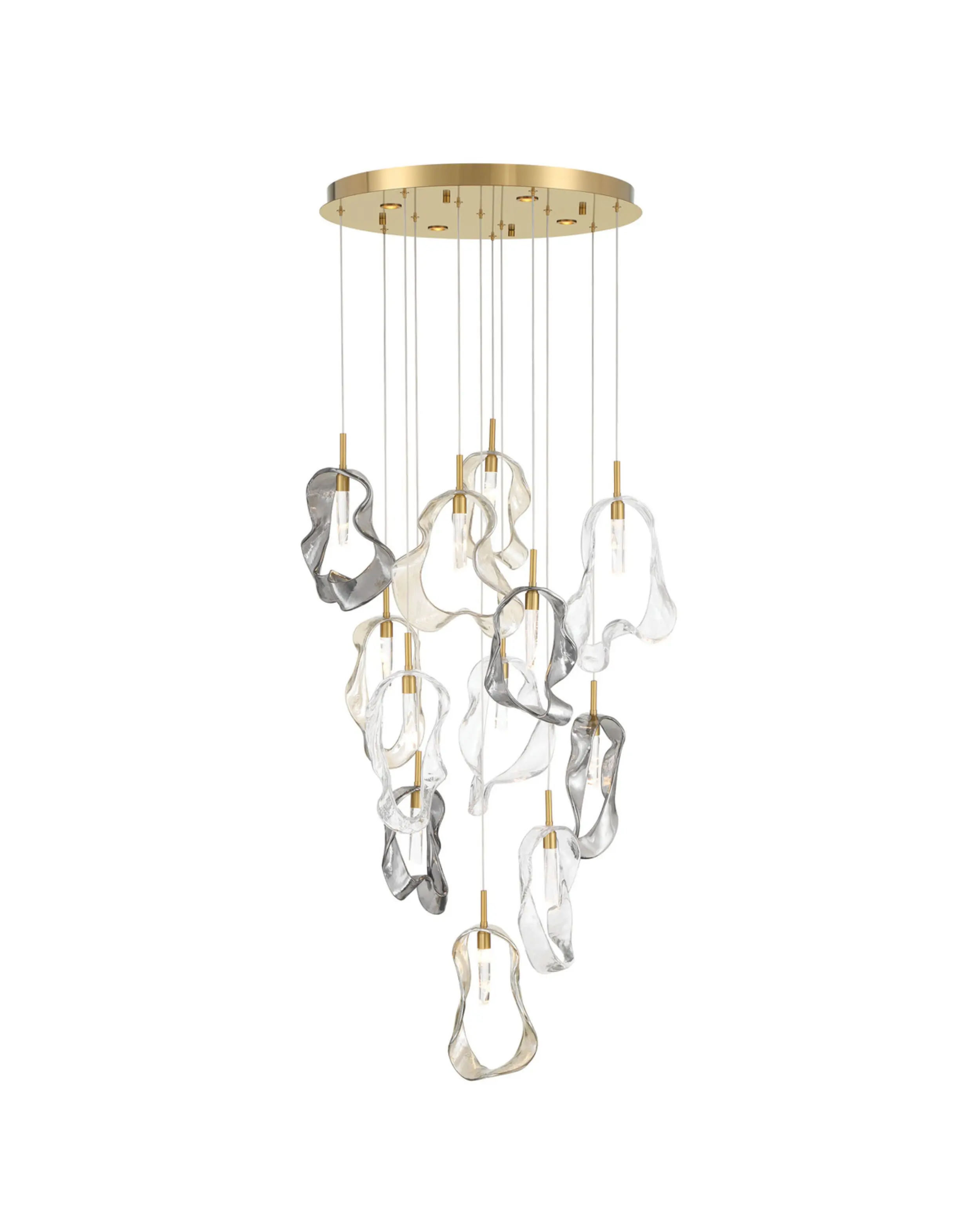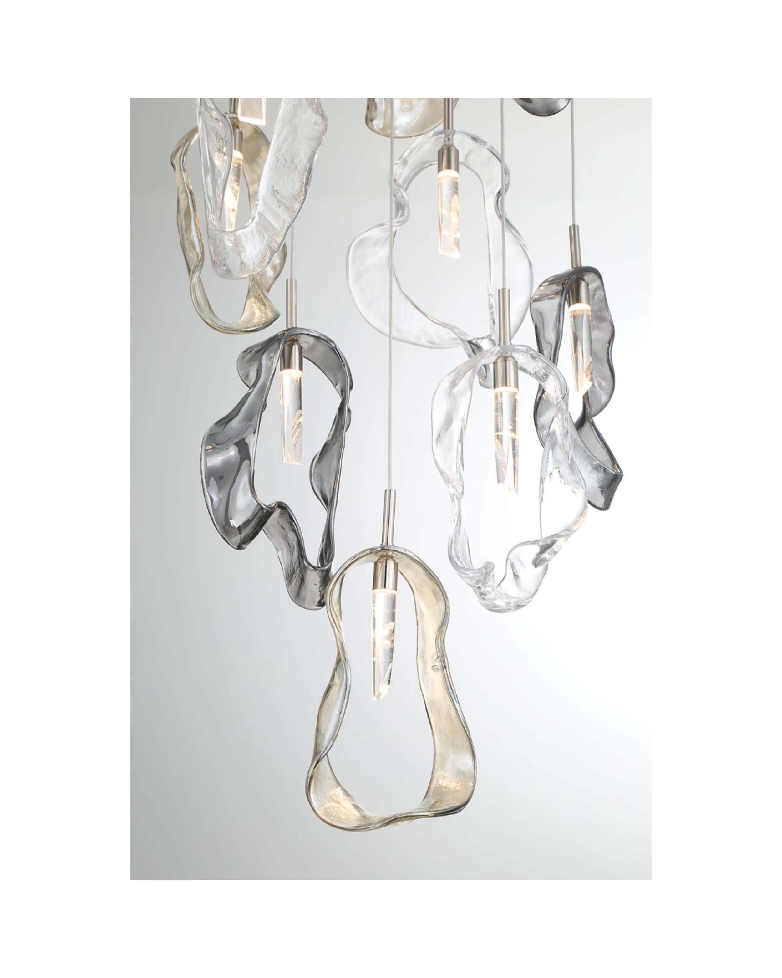 Composición de cintas de vidrio hechas a mano y de forma libre, hechas de cristal de cuarzo que las rodea. Todo ello se embellece aún más con un trío de colores y la fascinante reflexión y refracción que se produce al introducir la luz. Este conflicto artístico ha creado piezas impactantes que definen un espacio.