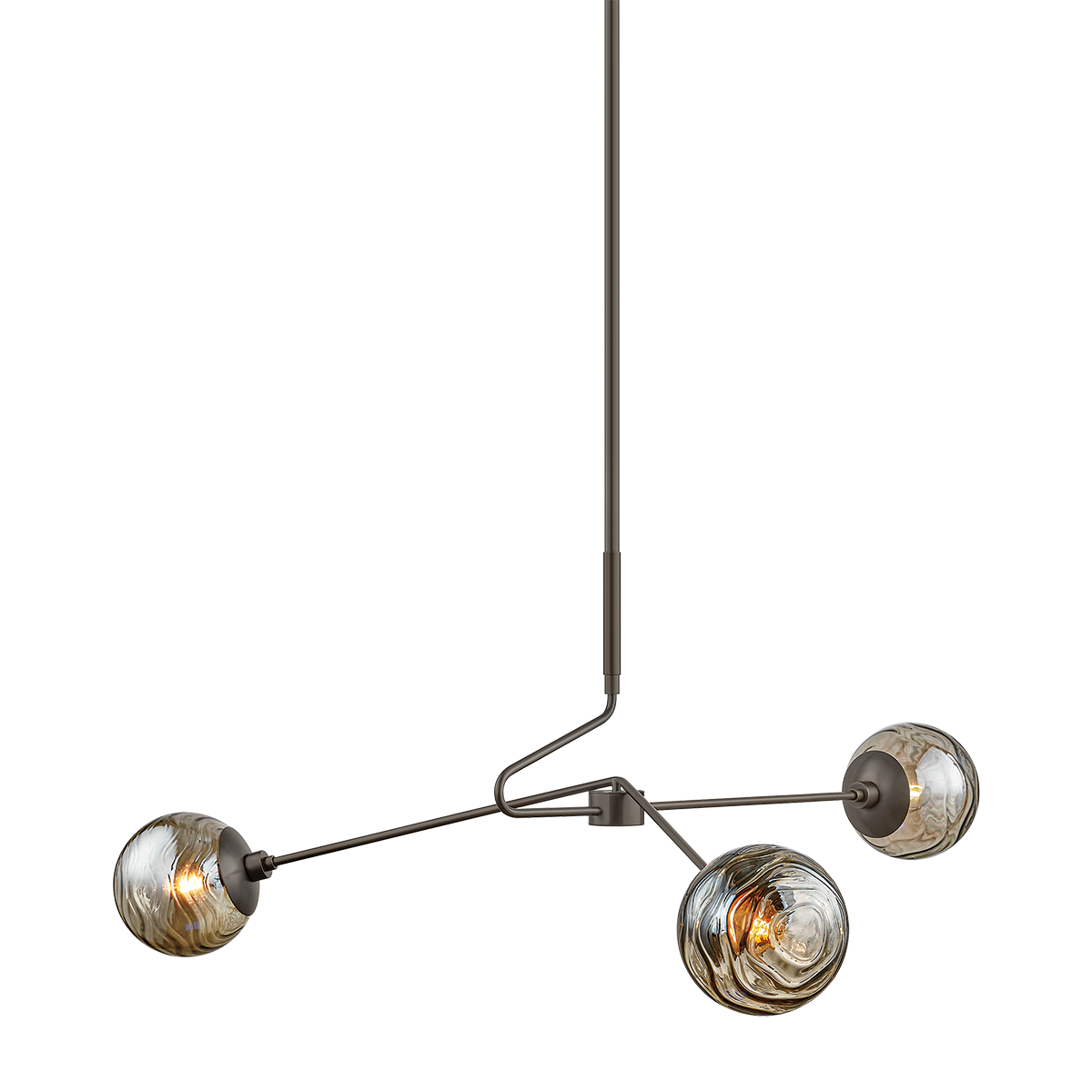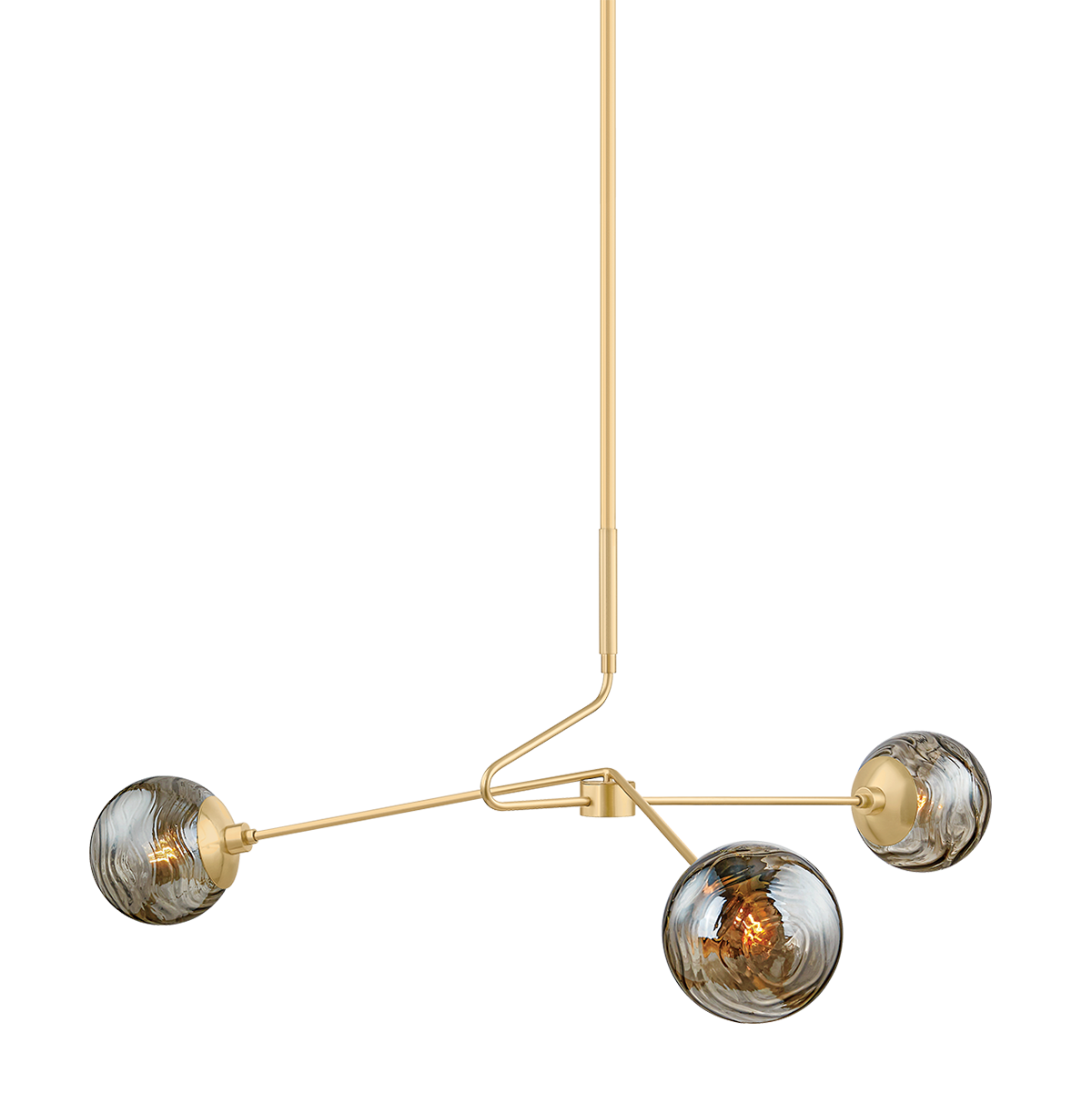 Pantallas esféricas irregulares y vidrio ahumado atmosférico. Para crear la silueta similar a un móvil, tres brazos cuidadosamente equilibrados se extienden dramáticamente en el espacio. El marco esbelto y minimalista se hace más accesible gracias a la suave forma del vidrio. Elija entre un acabado de latón envejecido para un aspecto más brillante o bronce auténtico para un efecto más industrial.