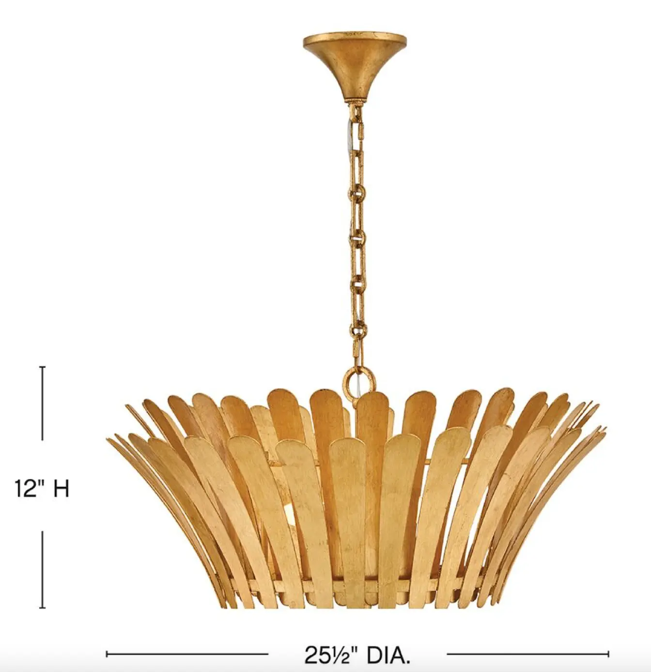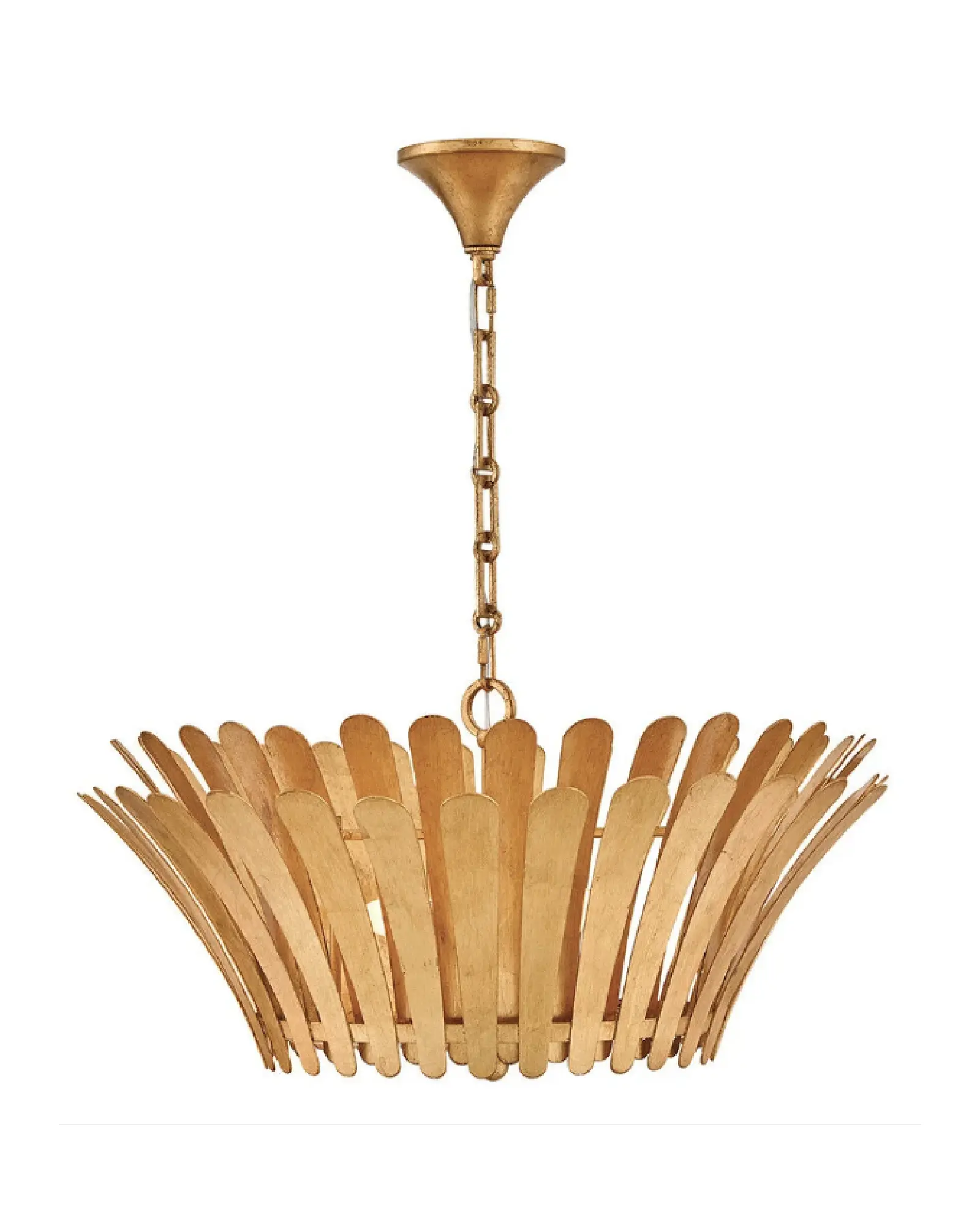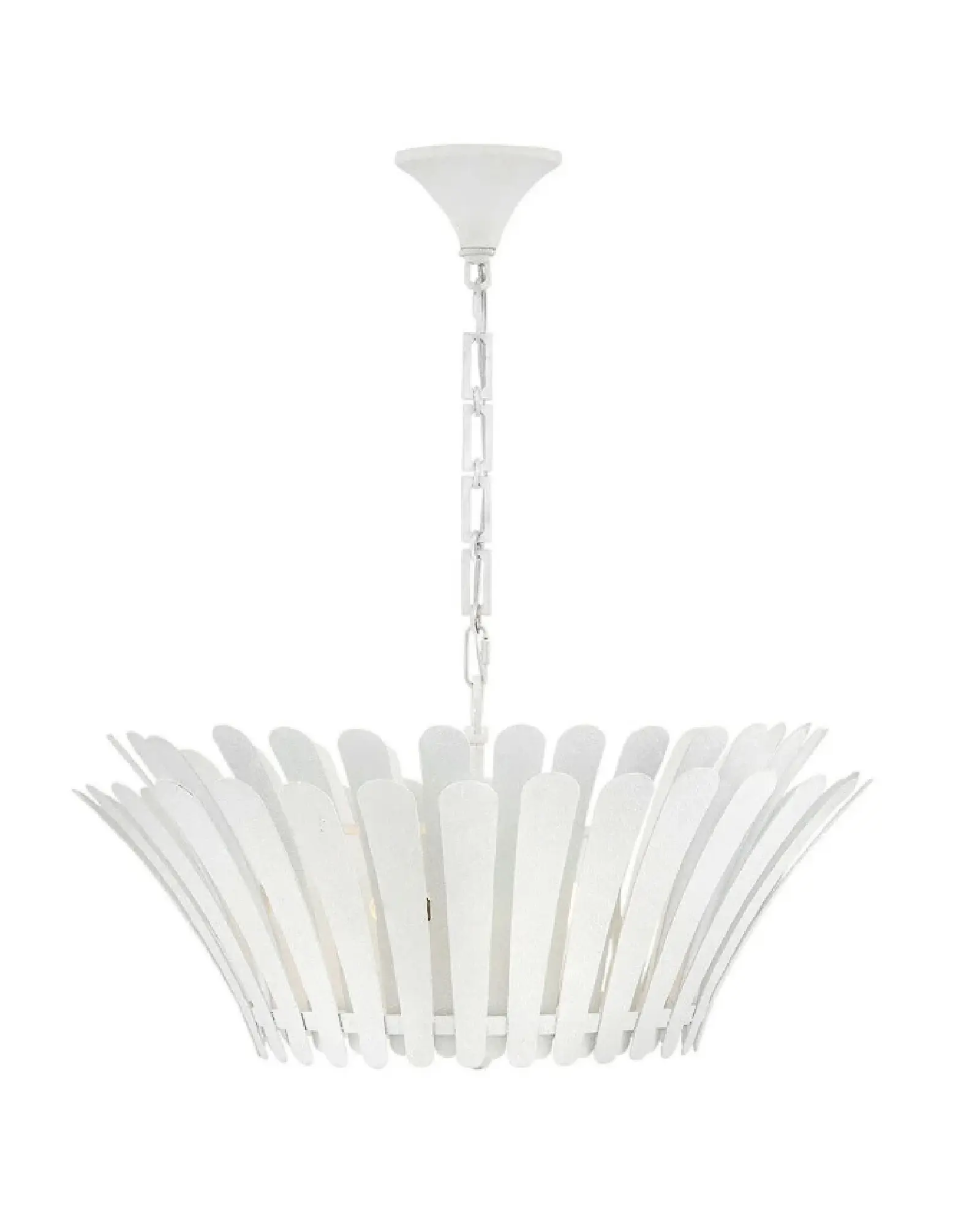 Sorprendentemente dramáticas, las frondas acampanadas de Reina rodean su tambor central y difusor de cristal blanco grabado, haciendo una declaración refinada pero llamativa en cualquier espacio. El acabado Distressed Brass crea un aspecto clásico, mientras que el acabado blanco Textured Plaster aporta un toque más moderno.