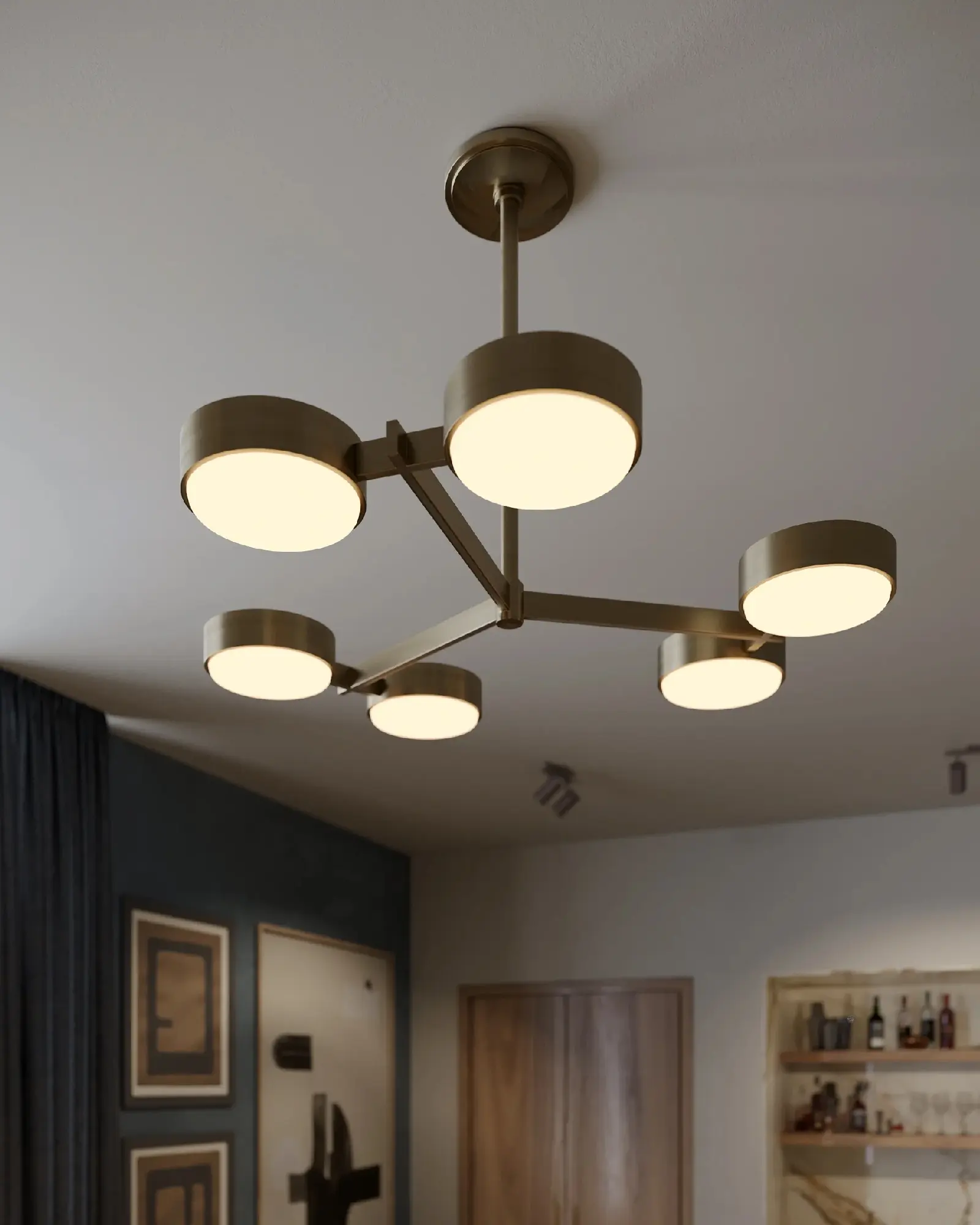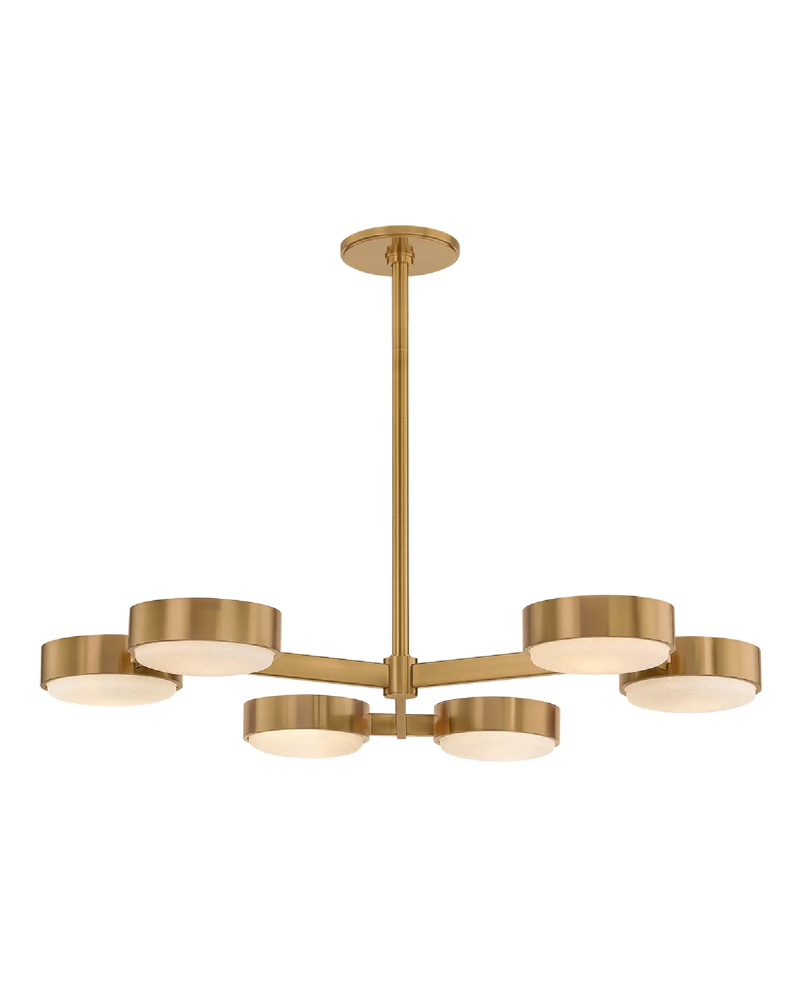 Un grupo de pantallas finas y anchas se extienden por el techo en la exclusiva lámpara Rory. En combinación con el cálido acabado Patina Brass, la amplia superficie de las pantallas de cristal aporta un estilo vintage a un diseño contemporáneo. Ya sea en su versión de 3 o 6 luces, Rory aporta un ambiente artístico a cualquier espacio.
