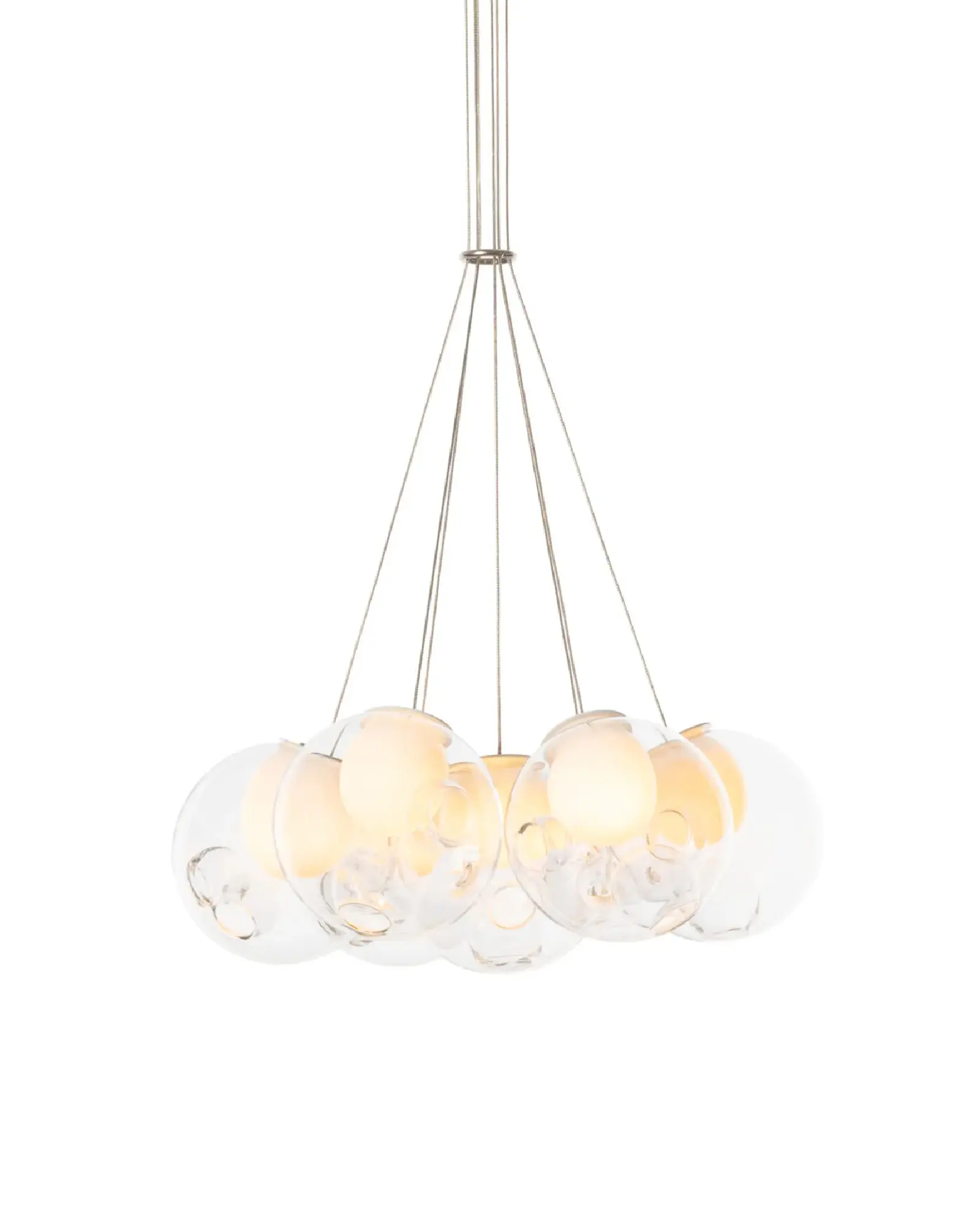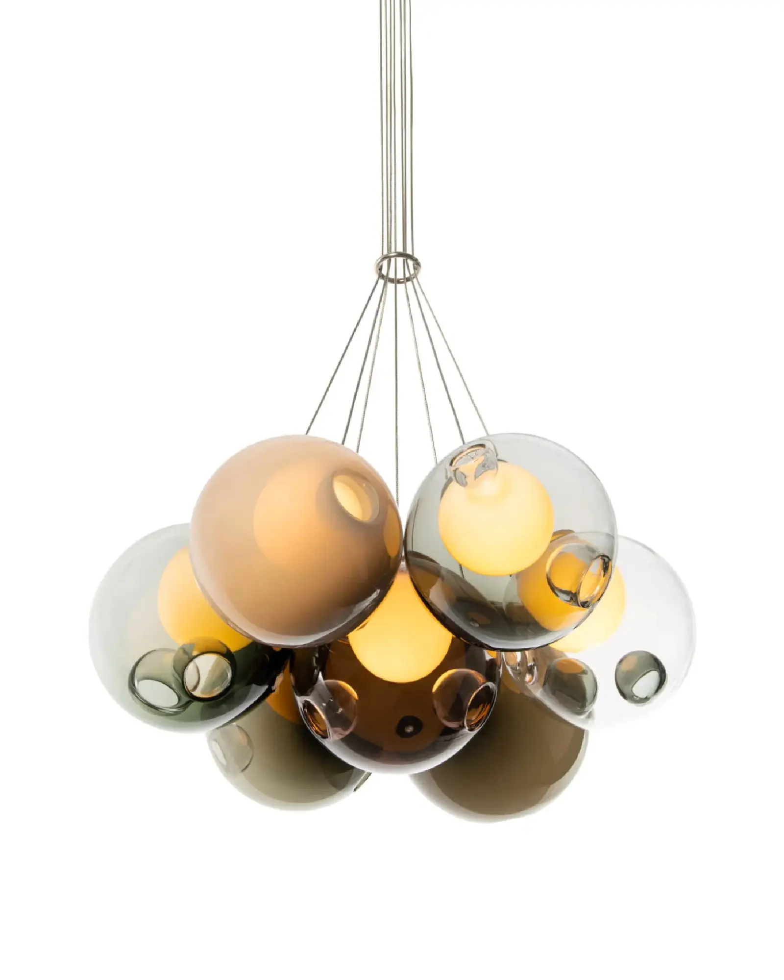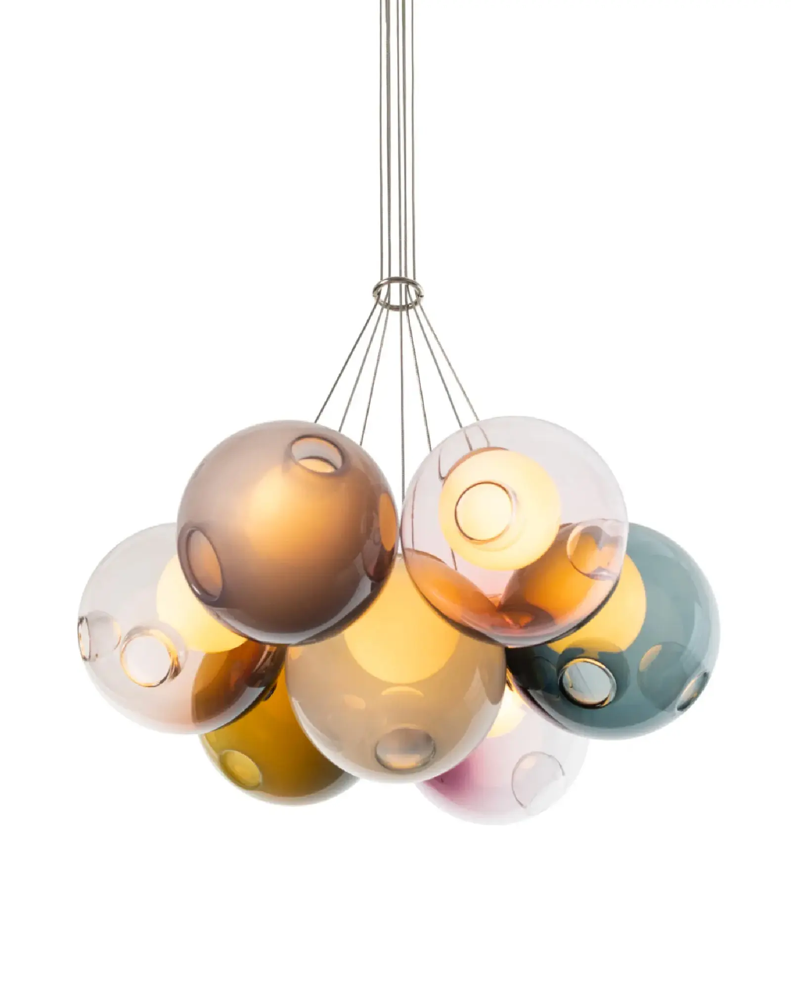 La serie 28 se elabora utilizando una innovadora técnica de soplado de vidrio, creando esferas con inclusiones empotradas que capturan y difunden la luz. Se puede personalizar los acabados dentro de los 70 colores diferentes y en opciones de suspensión, superficie, suelo y sobremesa, esta versátil serie aporta un resplandor etéreo a cualquier ambiente. Las medidas pueden variar.