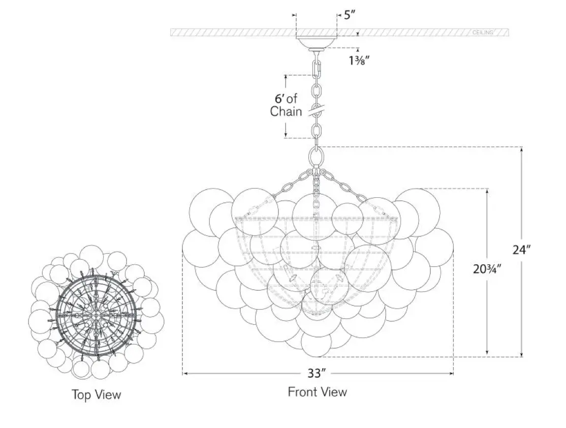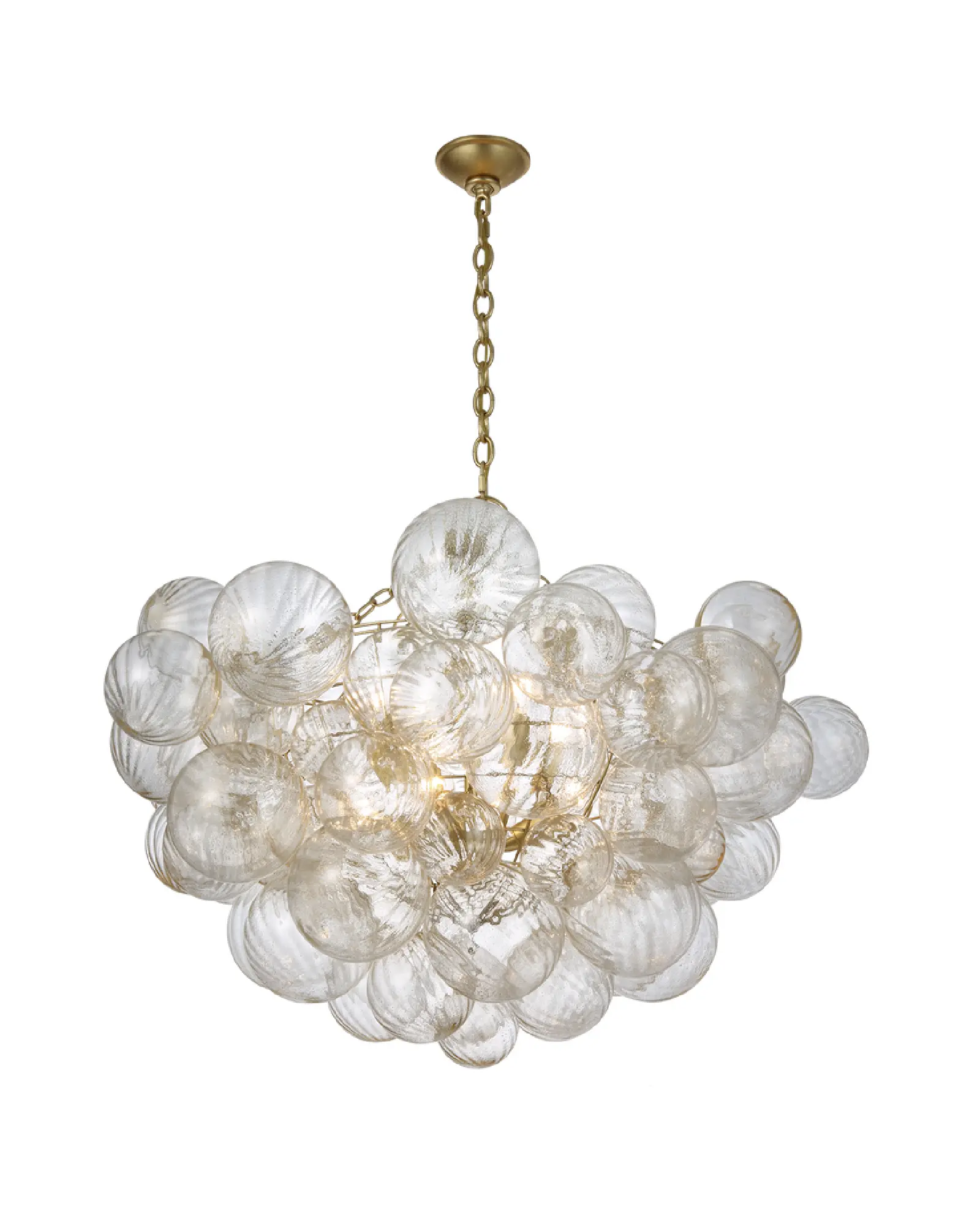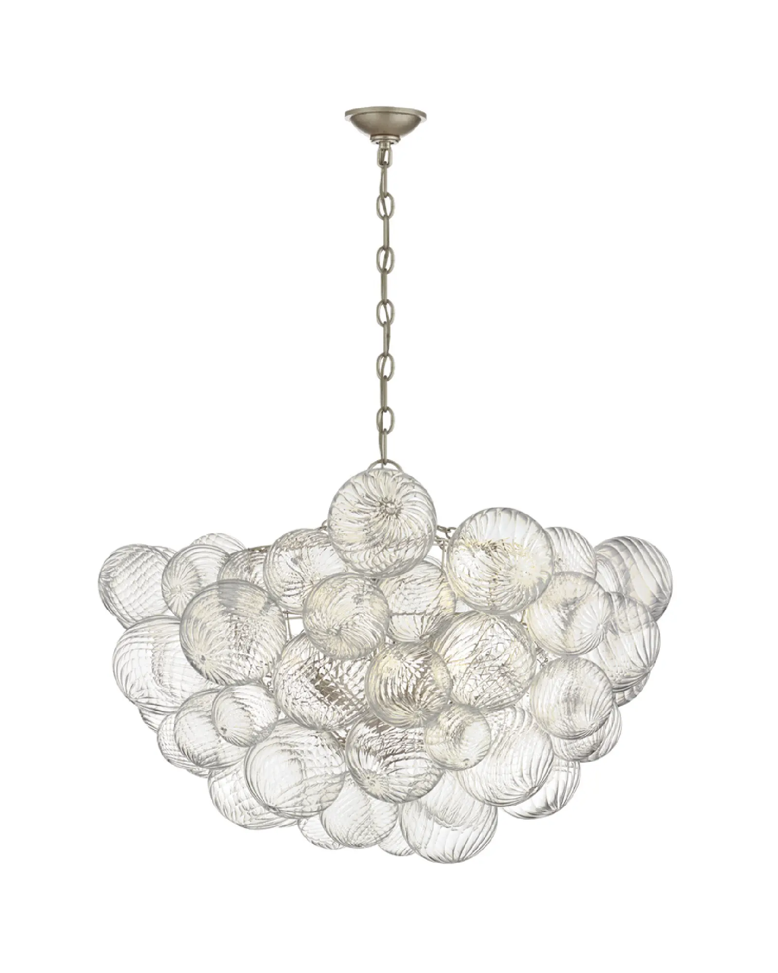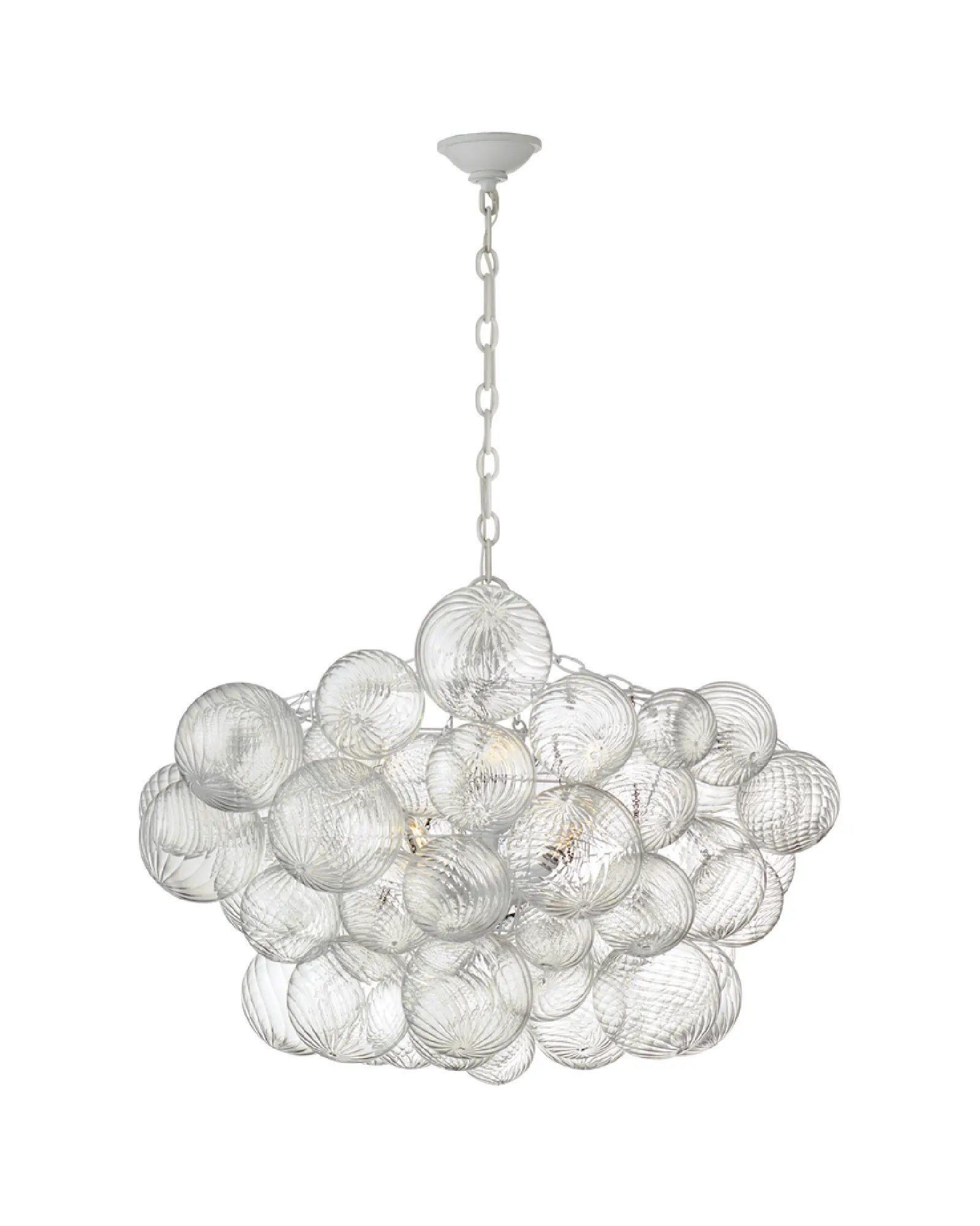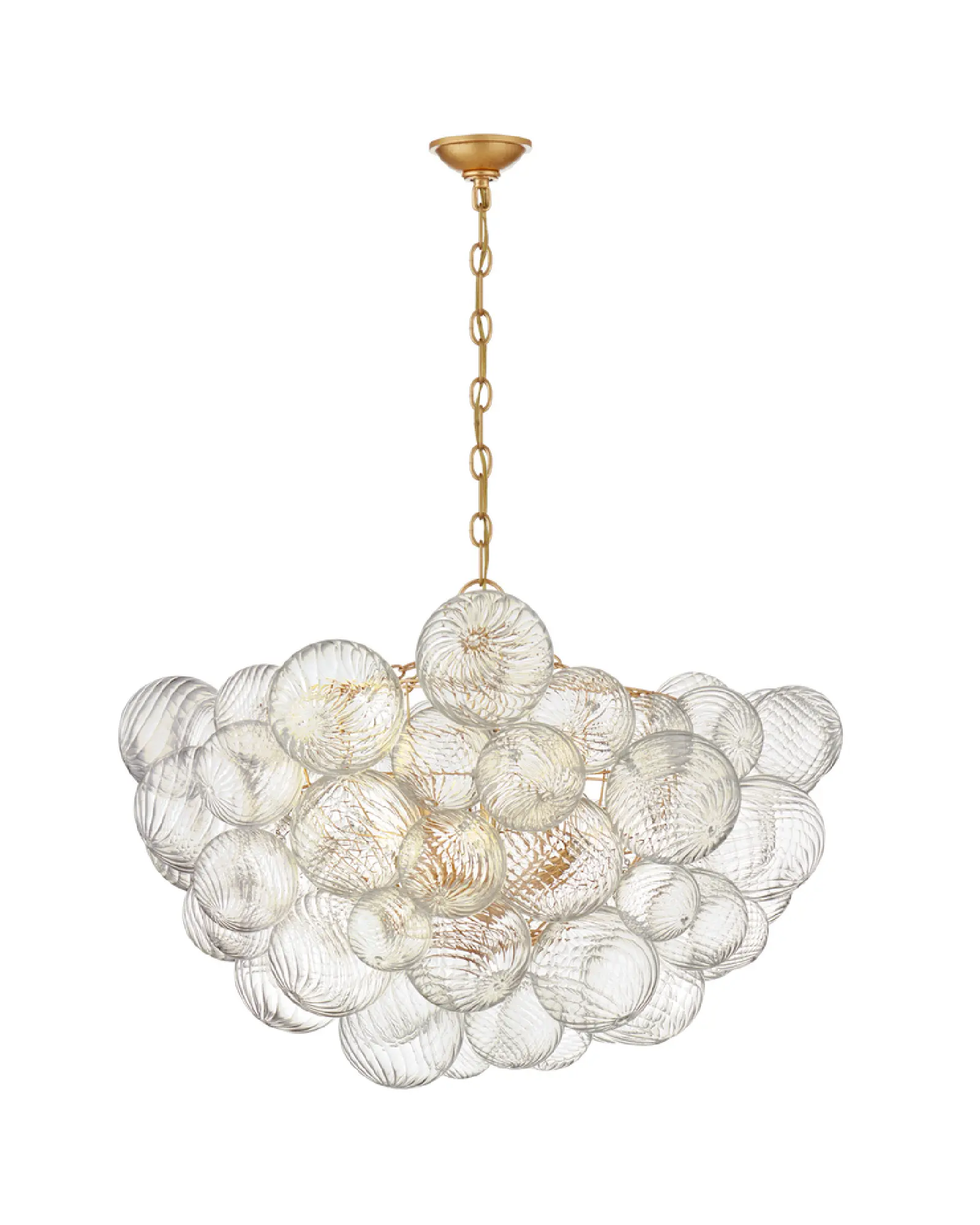 La luz se proyecta a través de multiples esferas de cristal en espiral, sujetas a cestas metálicas, creando un efecto visual extravagante.