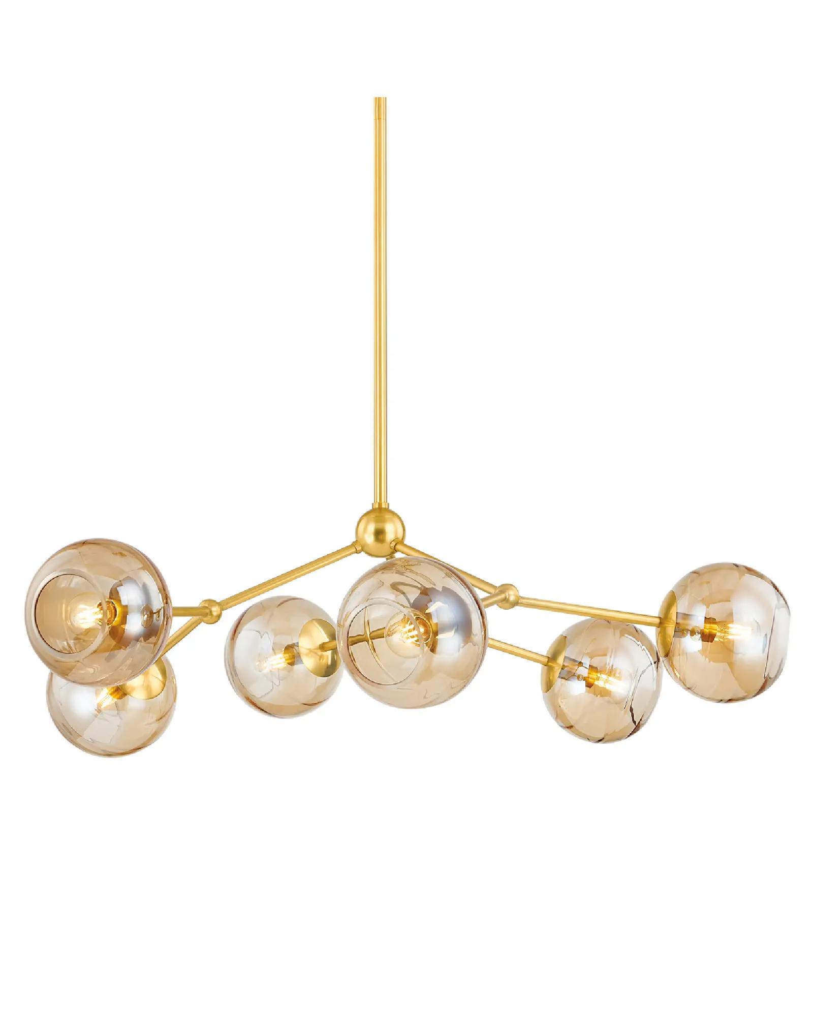Inspirada en la naturaleza, esta impresionante lámpara de araña presenta brillantes orbes que se extienden desde largas y esbeltas ramas. El exquisito tratamiento de cristal Champagne Swirl de las pantallas tiene una sutil iridiscencia que llama la atención tanto si están encendidas como apagadas. Como adornos de joyería, las pequeñas esferas ornamentales actúan como uniones de Trixie, proporcionando un acento decorativo adicional.