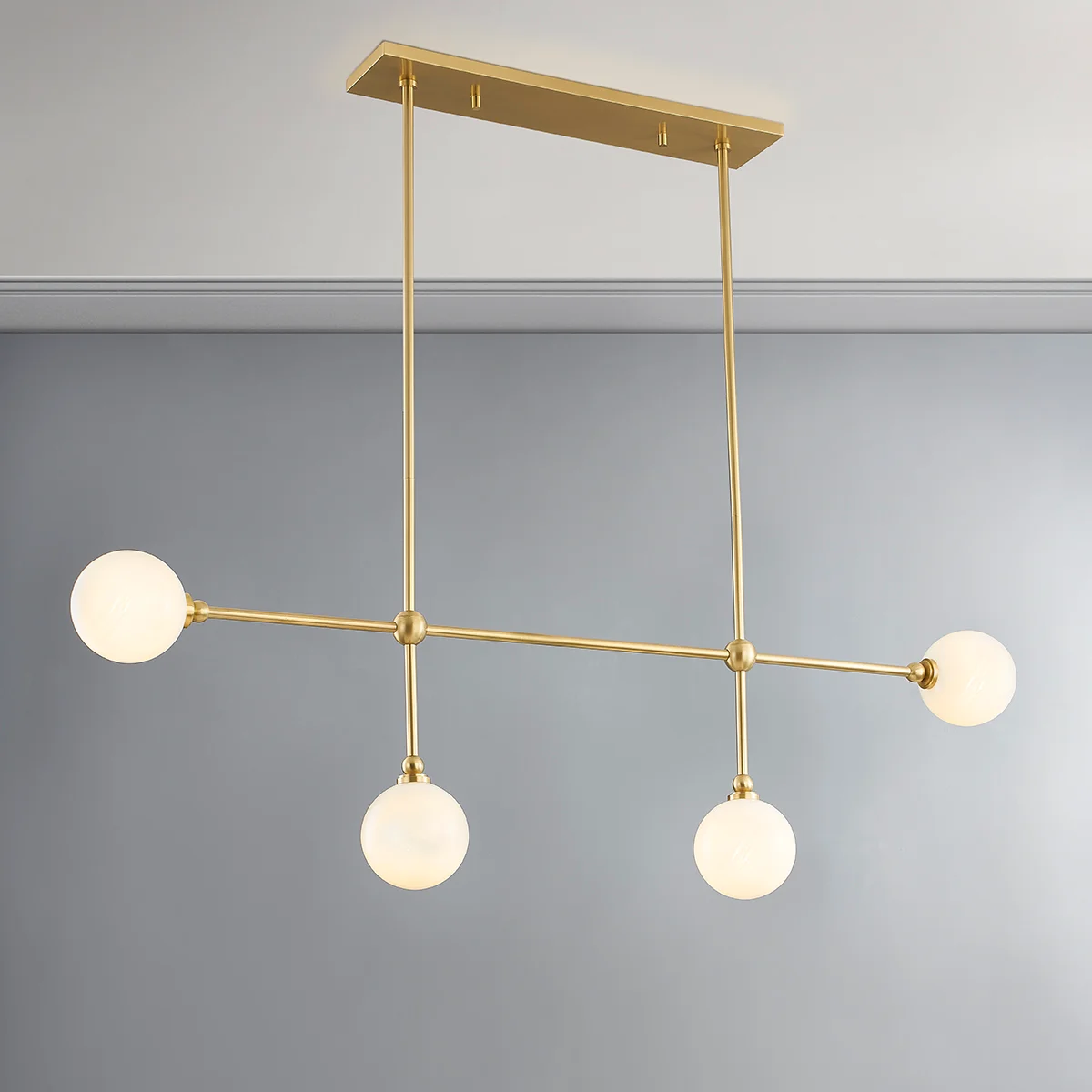 Como su nombre indica, el cristal grabado con nubes crea un delicado patrón similar a una nube en el interior de las esferas de cristal, que se llena de un cálido resplandor cuando se enciende. El aplique también está disponible en níquel pulido, lo que lo convierte en una buena opción para el cuarto de baño.