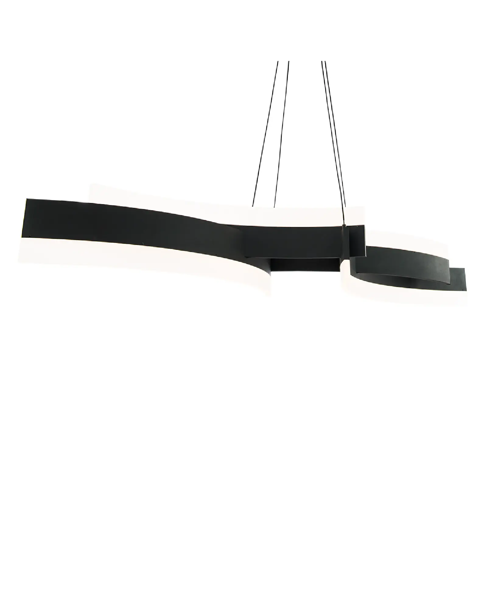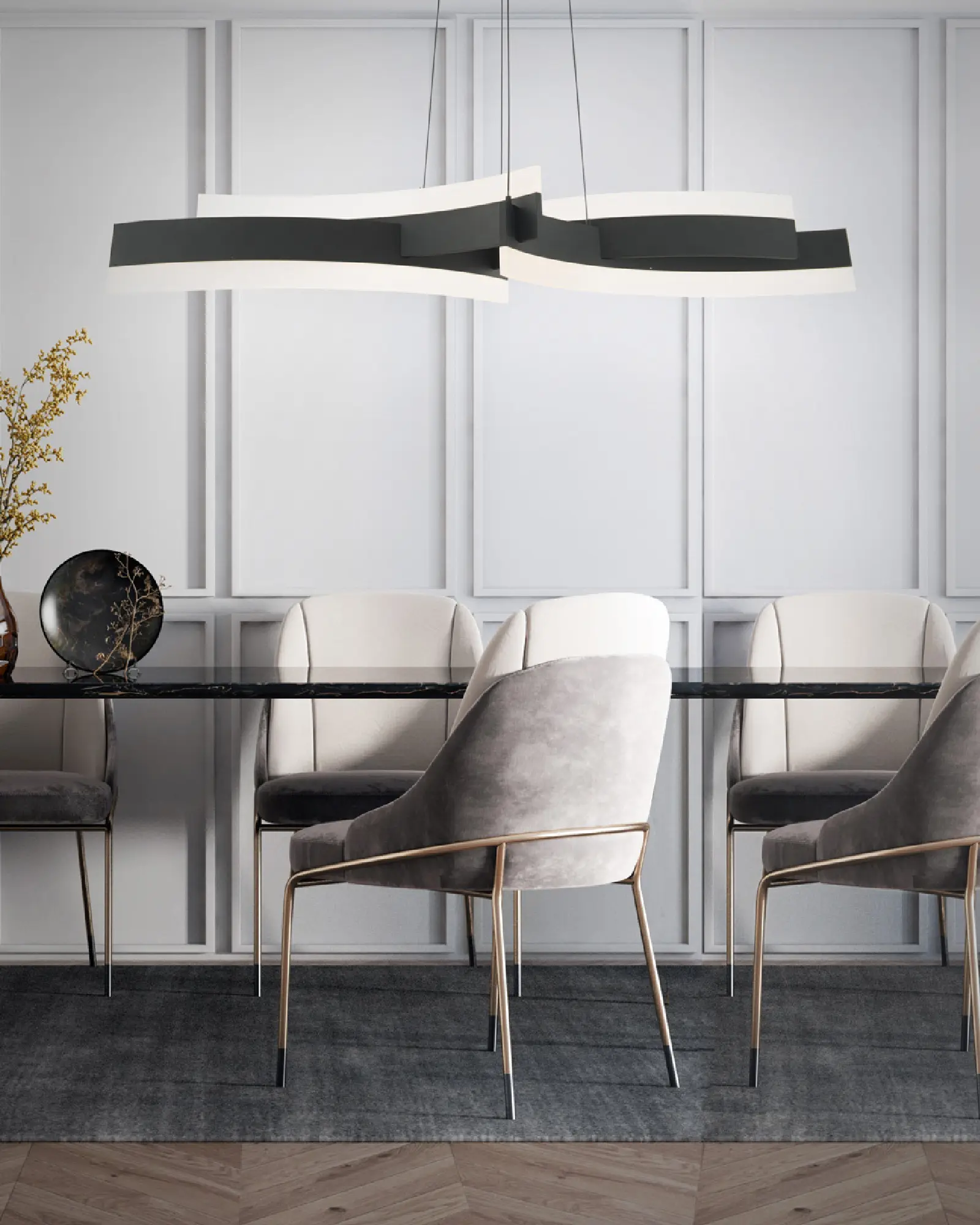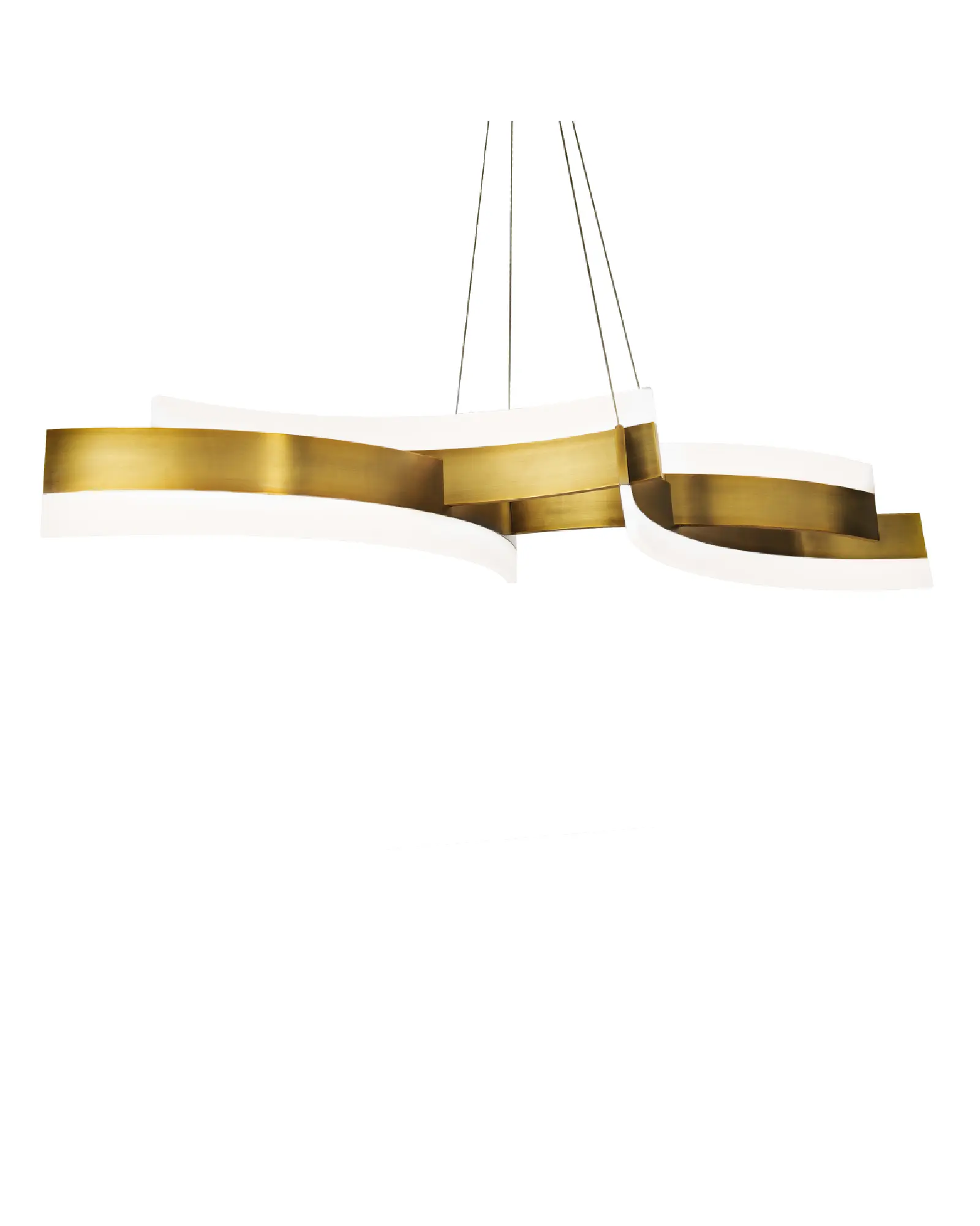 Elegantes arcos cóncavos y convexos, con un bello acabado, se cruzan y reflejan entre sí mientras soportan guías de luz curvadas y grabadas que se extienden por encima y por debajo de la pieza, difundiendo una encantadora capa de luz de bajo consumo.