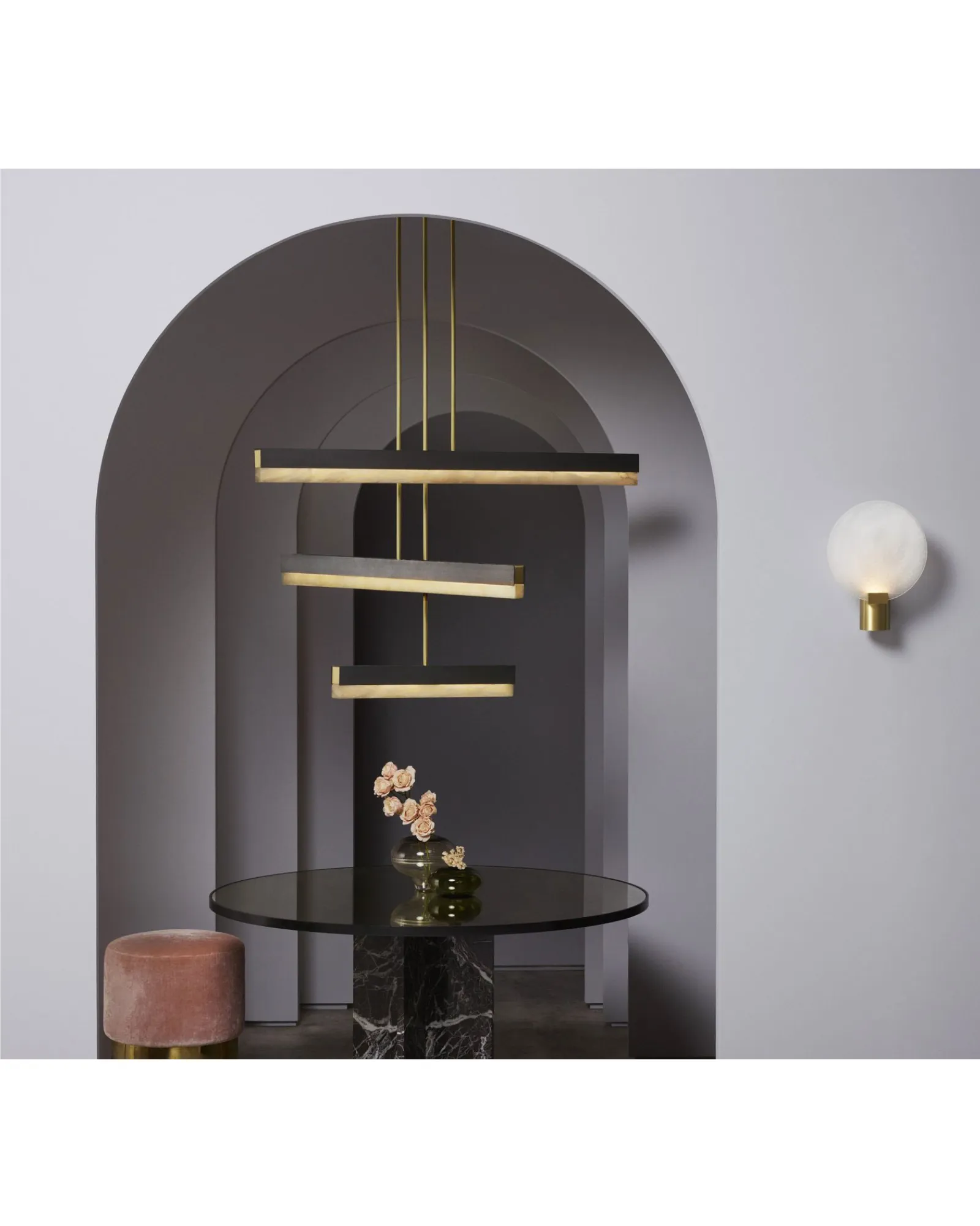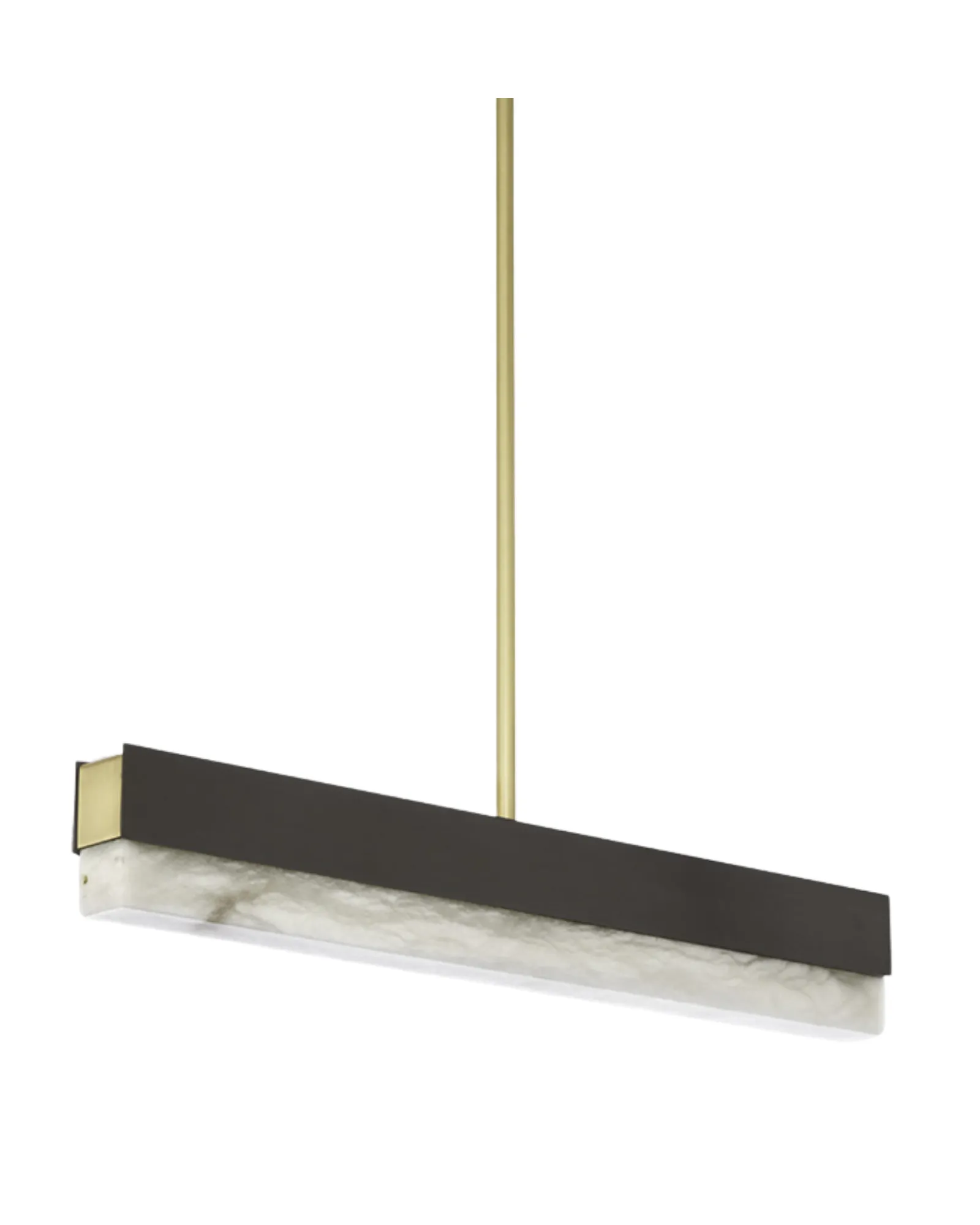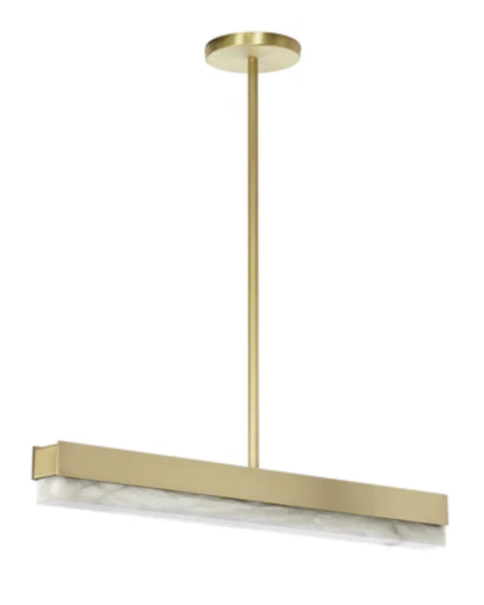 Una viga arquitectónica de luz fusionada con materiales de primera calidad, como bronce, latón satinado y alabastro pulido, crea una elegante lámpara colgante que puede utilizarse de forma individual o como parte de una composición, lo que ofrece infinitas posibilidades para personalizar un espacio.