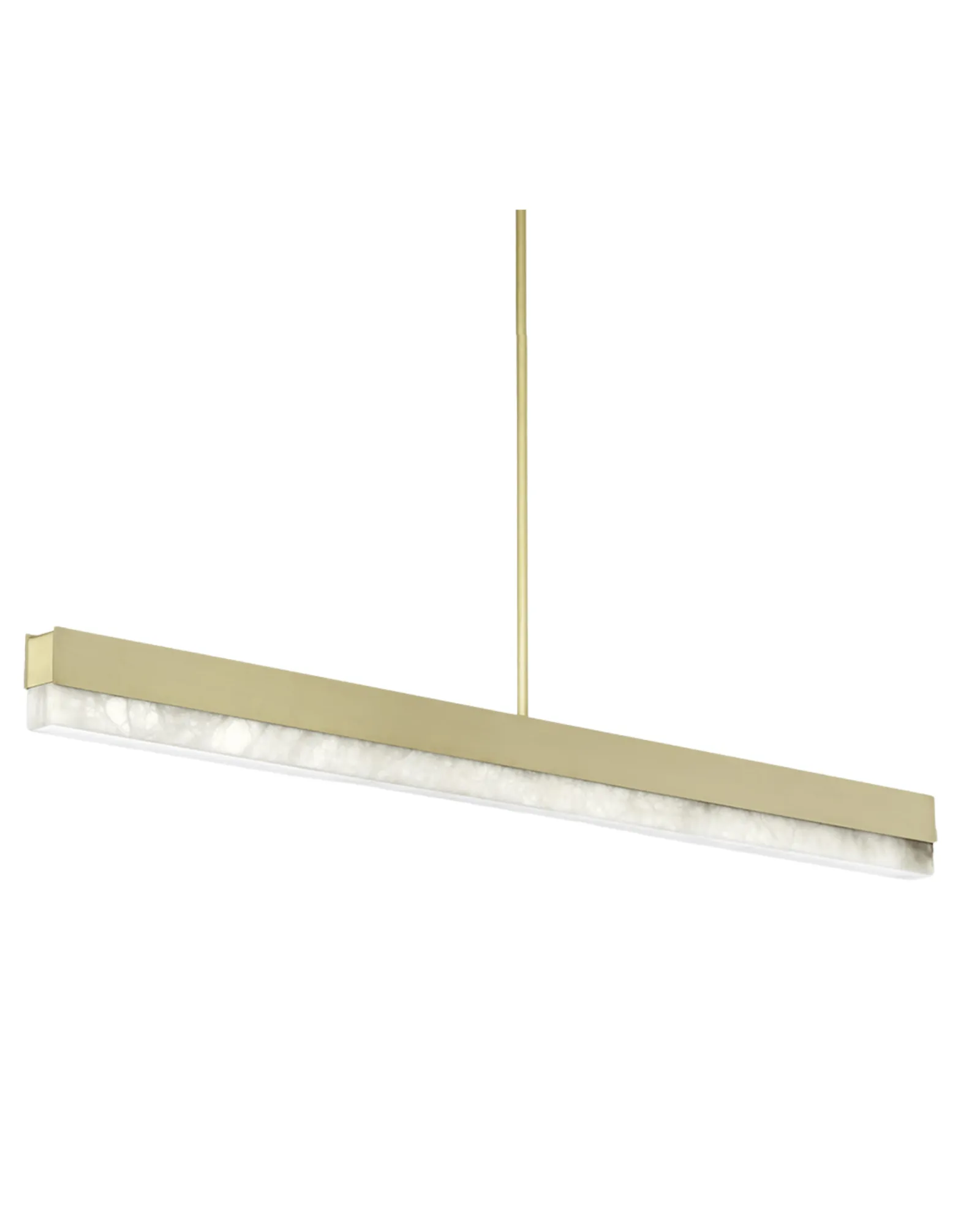 Una viga arquitectónica de luz fusionada con materiales de primera calidad, como bronce, latón satinado y alabastro pulido, da lugar a un elegante colgante que puede utilizarse de forma individual o como parte de una composición, creando infinitas posibilidades para personalizar un espacio.