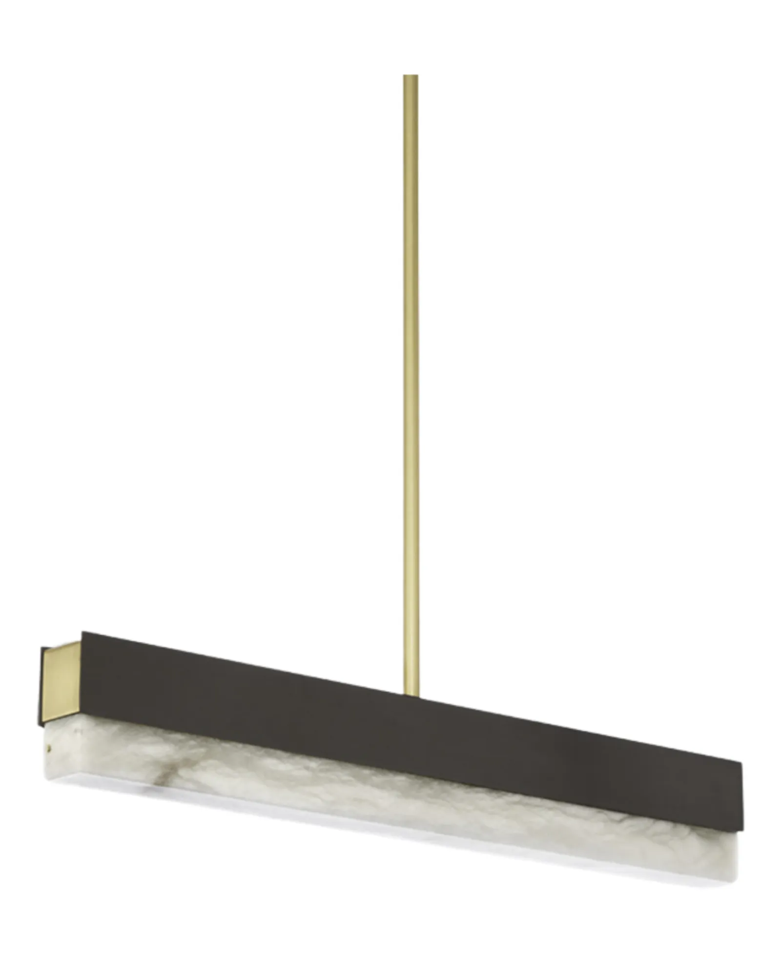 Una viga arquitectónica de luz fusionada con materiales de primera calidad, como bronce, latón satinado y alabastro pulido, da lugar a un elegante colgante que puede utilizarse de forma individual o como parte de una composición, creando infinitas posibilidades para personalizar un espacio.