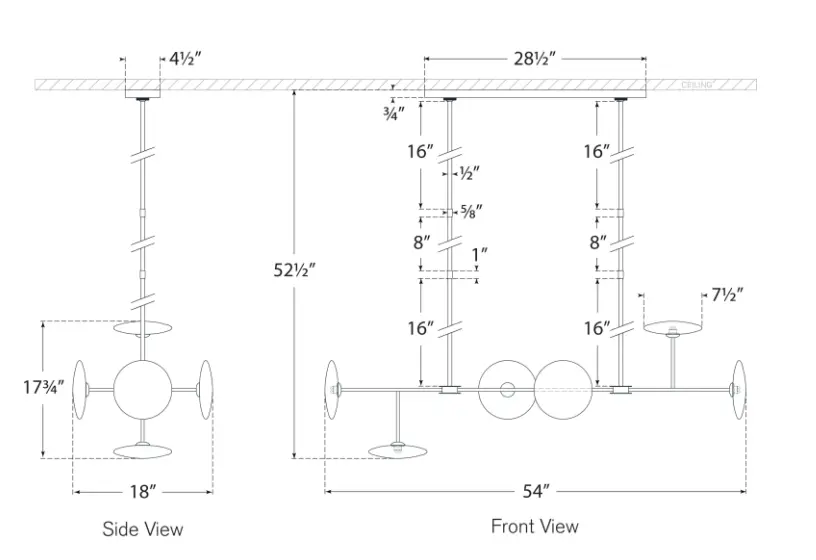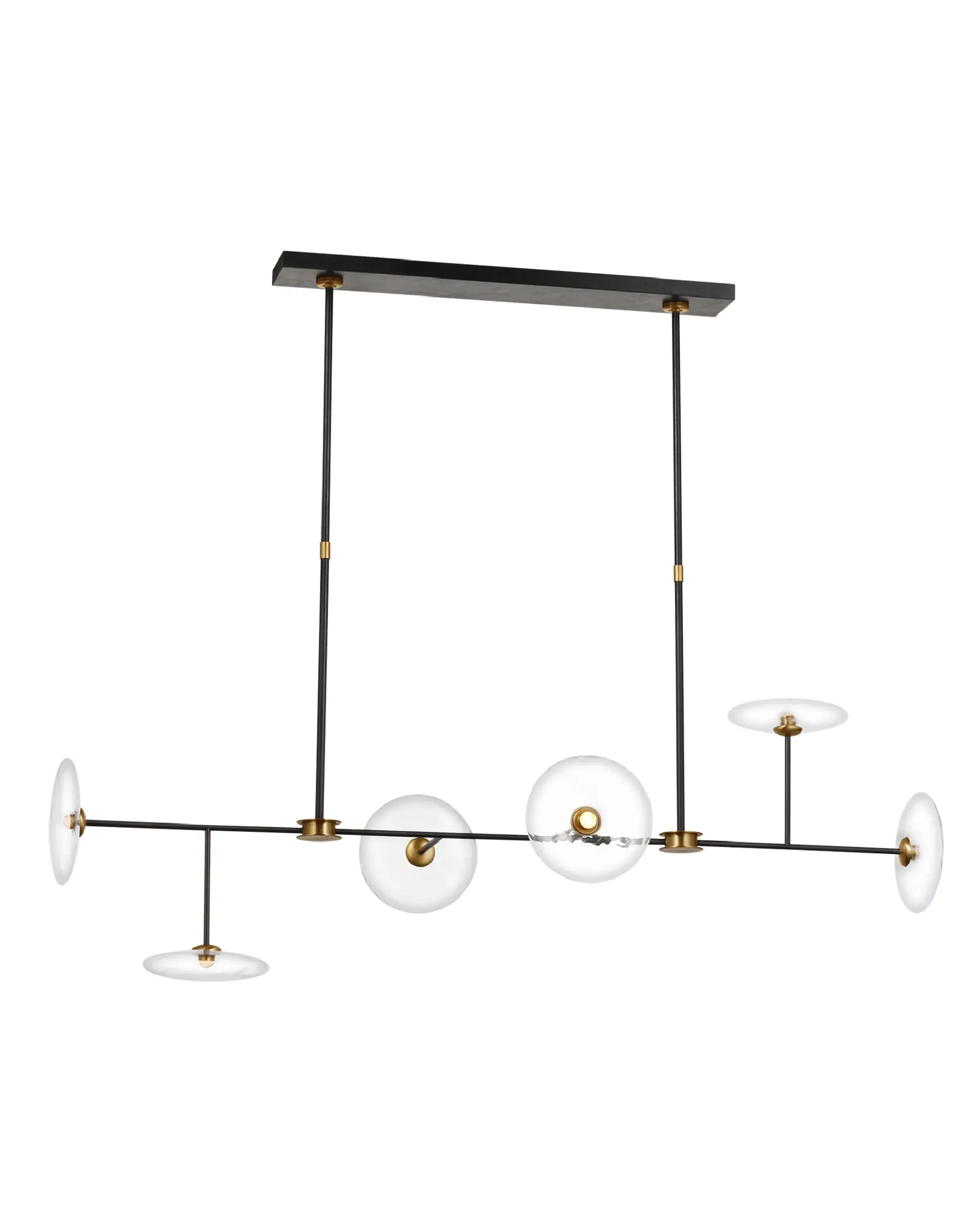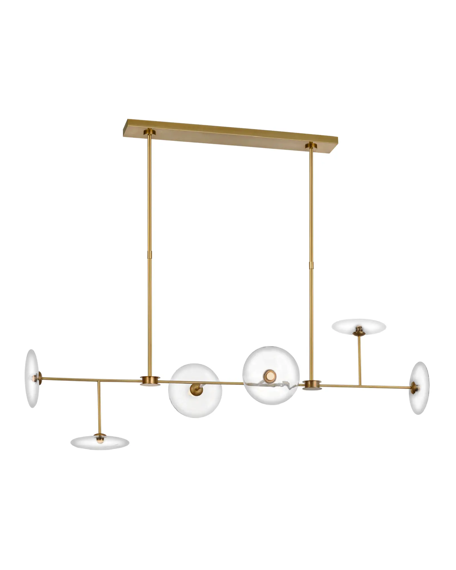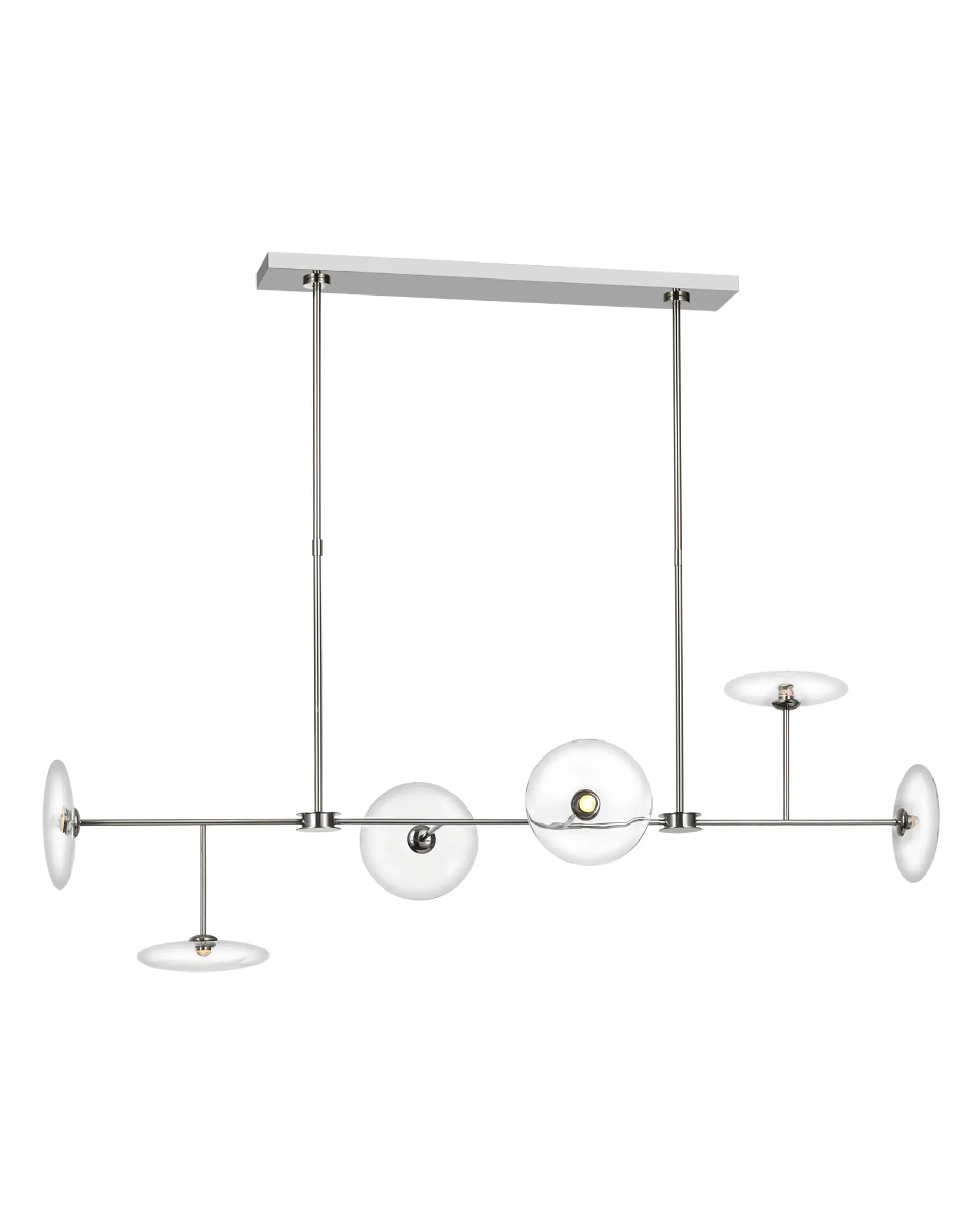 Calvino utiliza líneas modernas para crear configuraciones innovadoras. Los discos de vidrio soplado parecen flotar sobre tallos metálicos que se cruzan,jugando con la asimetría. Las mini bombillas LED generan un efecto de halo iluminado que aporta un brillo intrigante a salones y otros espacios residenciales amplios.